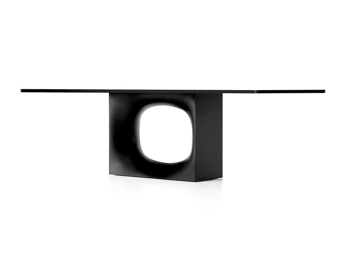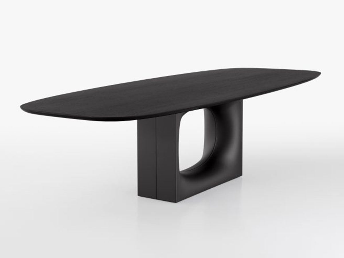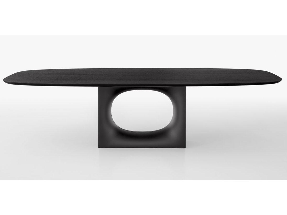 From the creativity of the Japanese designer Kensaku Oshiro comes the Holo table, produced by Kristalia. The spectacular sheet metal base, available in different finishes, has an oval hole with soft lines, made in various stages of moulding and bending which guarantee the stability of the product. The table top, oval or rectangular, is available in solid wood, marble or Fenix-NTM, an innovative regenerating material, soft to the touch and non-reflecting. The simplicity of the lines and the versatility of the materials used allow the Holo table to be inserted in large living rooms but also to use it to furnish offices or meeting rooms that will be enhanced by its strong sculptural impact.