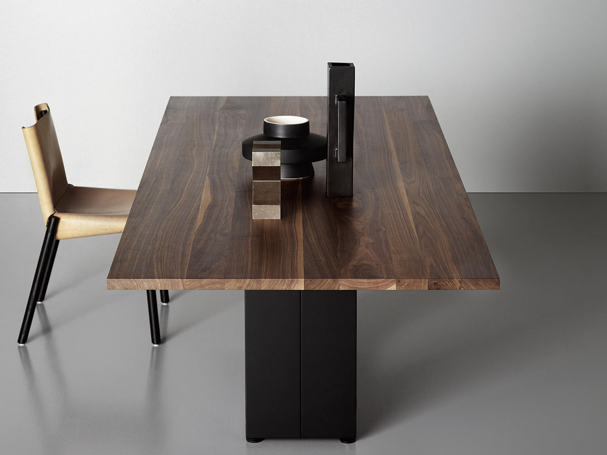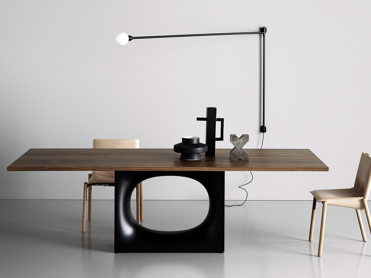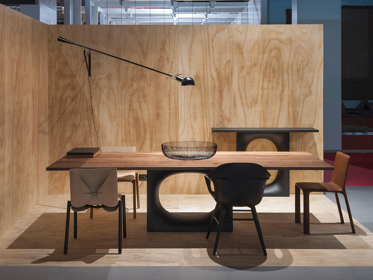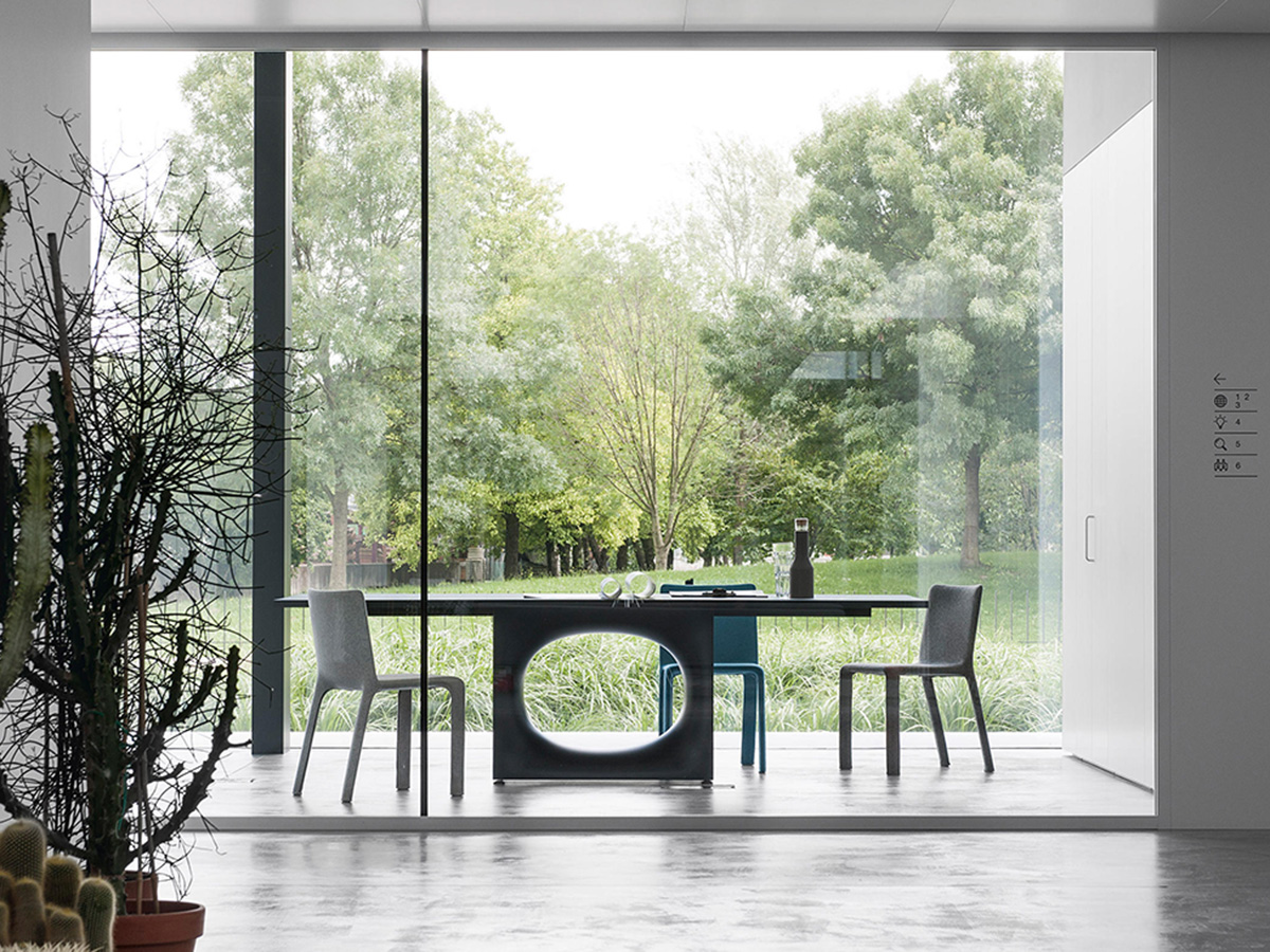 From the creativity of the Japanese designer Kensaku Oshiro comes the Holo table, produced by Kristalia. The spectacular sheet metal base, available in different finishes, has an oval hole with soft lines, made in various stages of moulding and bending which guarantee the stability of the product. The table top, oval or rectangular, is available in solid wood, marble or Fenix-NTM, an innovative regenerating material, soft to the touch and non-reflecting. The simplicity of the lines and the versatility of the materials used allow the Holo table to be inserted in large living rooms but also to use it to furnish offices or meeting rooms that will be enhanced by its strong sculptural impact.