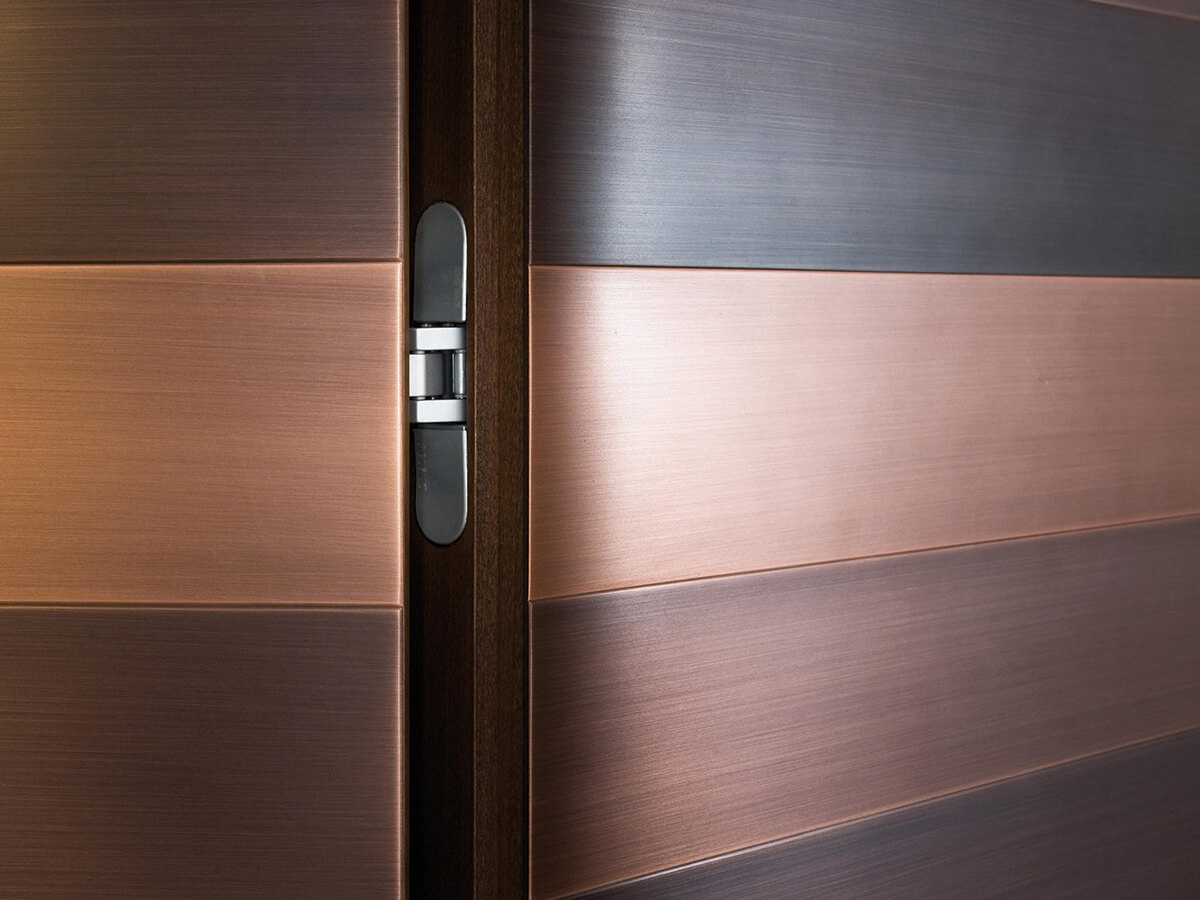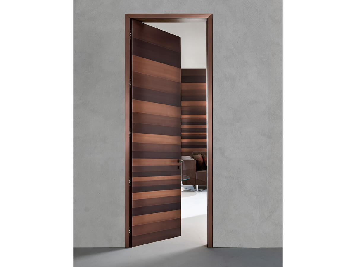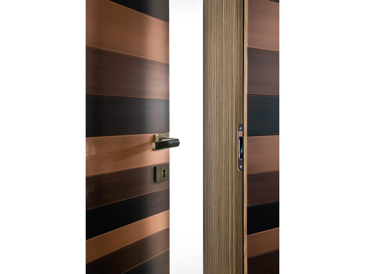 The Stars swing door by Laurameroni has a luxurious panel completely covered in metal with sparkling reflections. It can be used alone or it can be integrated into a larger boiserie in the same finish, capable of strongly connoting an entire environment, giving it a decisive and evocative tone. In the Stars door, designed by the Bartoli Design studio, the surface of the door is studded with horizontal metal strips of different sizes treated with different finishes, in a valuable optical effect that enhances the material effects. Technical features: the door is available in satin brass, burnished brass, satin copper, burnished copper, polished steel and black "Cenere" iron.