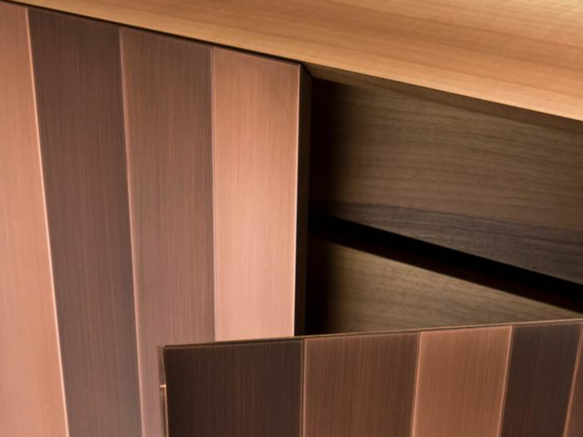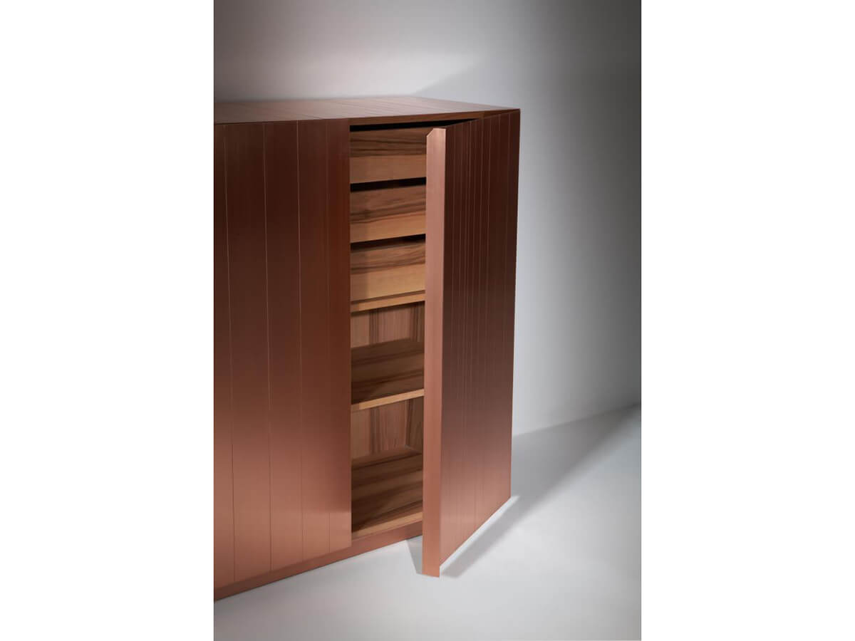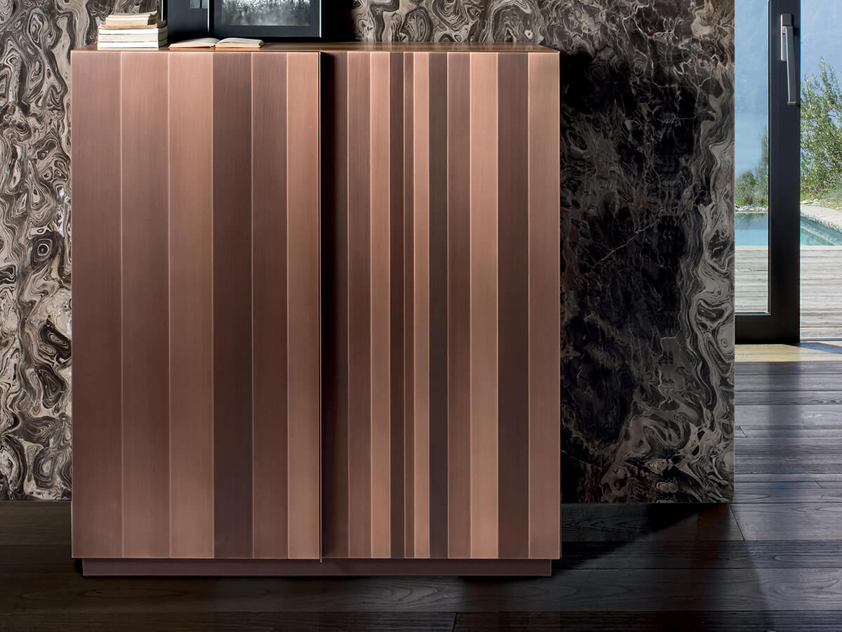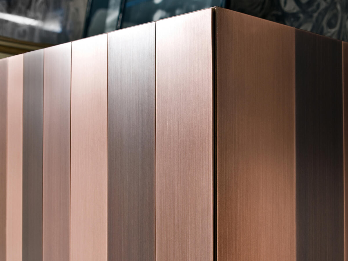 A design element explicitly dedicated to luxury and aesthetic refinement, designed to combine the idea of beauty with conceptual solidity. The Stars sideboard is part of the homonymous collection which includes tables, coffee tables, chests of drawers, doors, panels and wardrobe systems where the strong connection given by the use of metal bands from bronze to brass, to iron, to steel, copper and more, in a suggestive range of shades that go well with different furnishings. The sideboard looks like a low sideboard with four doors and a metal base, equipped with two internal drawers for the model ST11. The suggestion offered by ST12, on the other hand, is different, where two large metal feet stand out, and in ST01, higher and more compact to adapt to diversified space requirements.