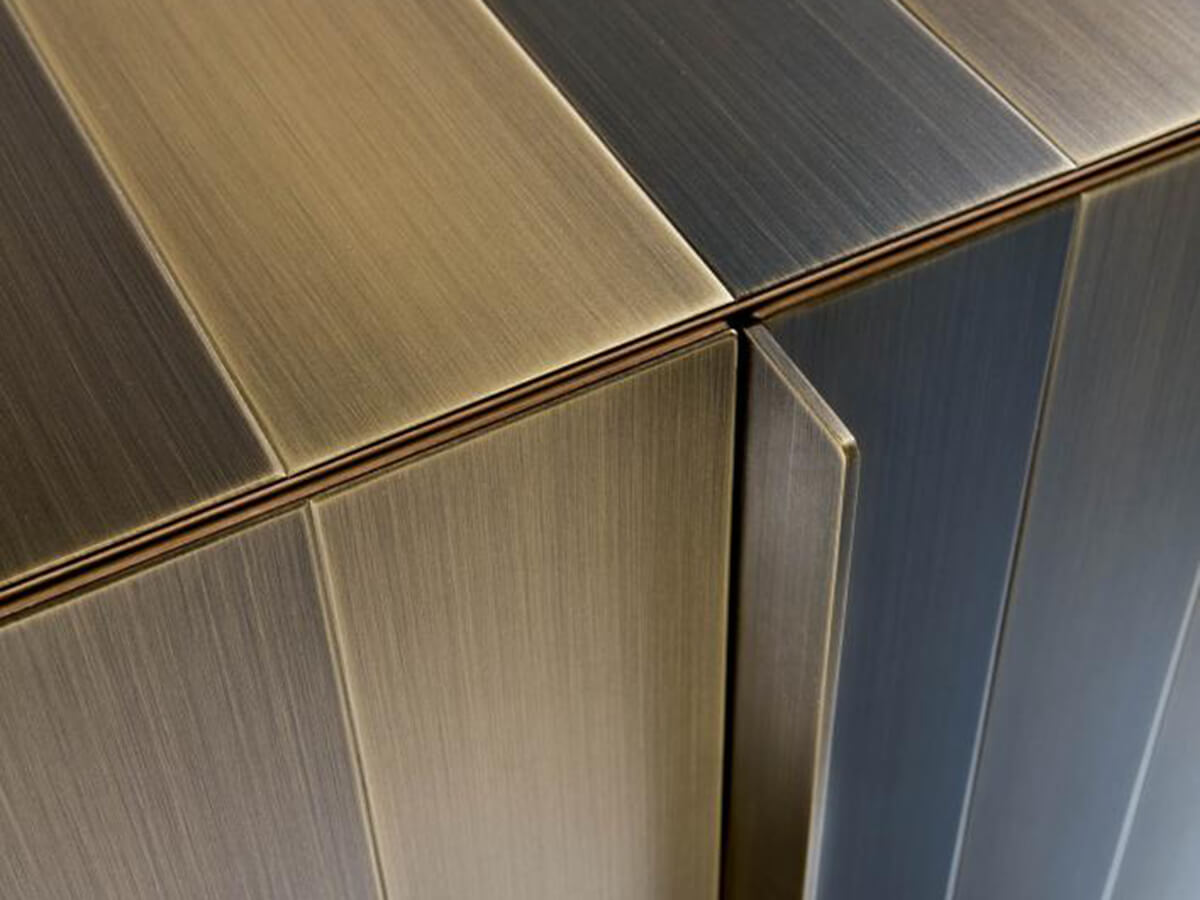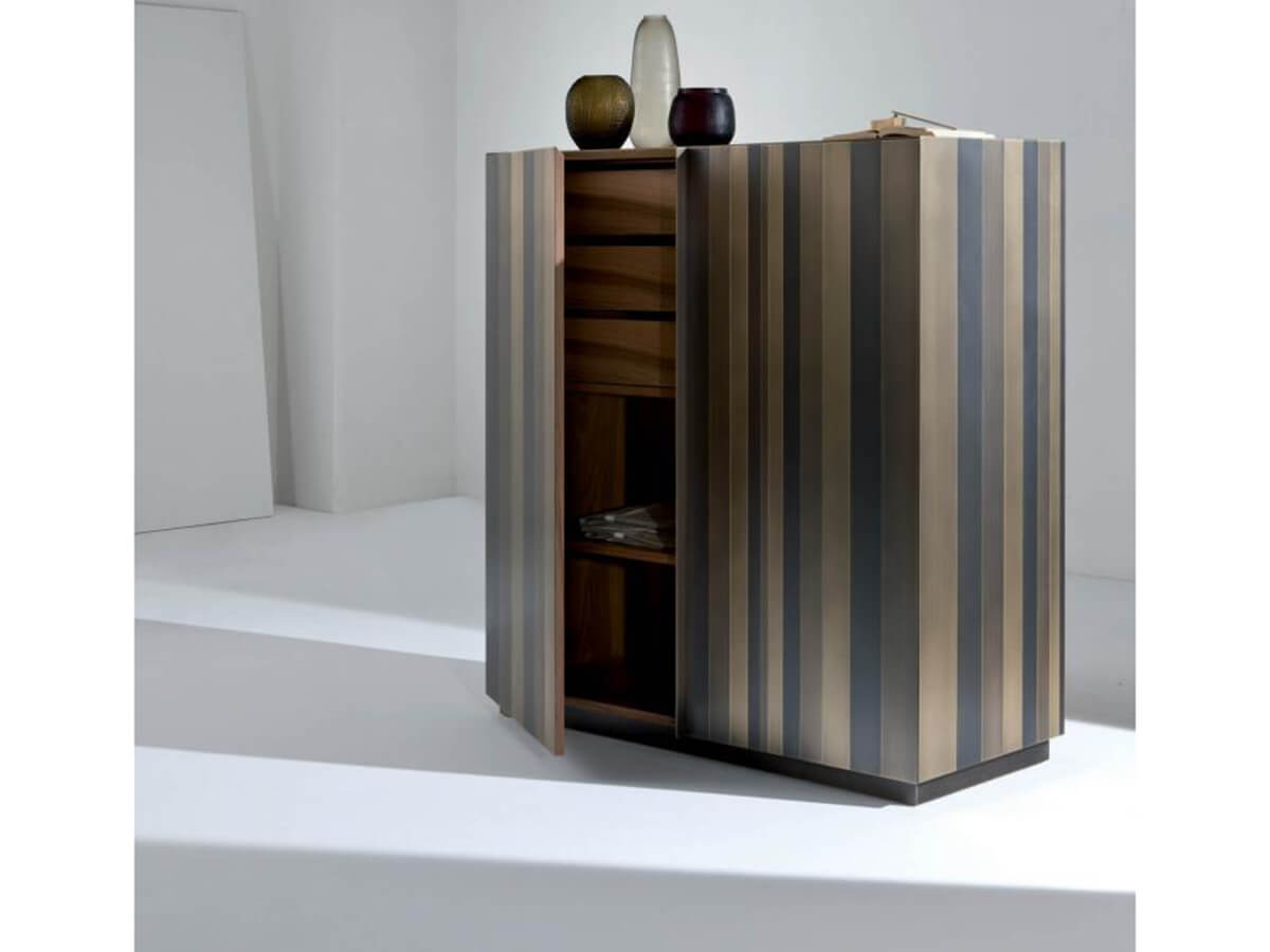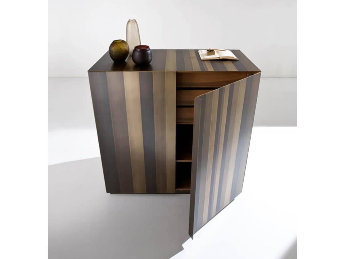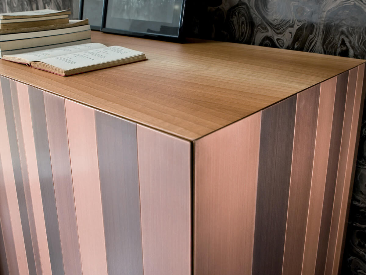 A design element explicitly dedicated to luxury and aesthetic refinement, designed to combine the idea of beauty with conceptual solidity. The Stars sideboard is part of the homonymous collection which includes tables, coffee tables, chests of drawers, doors, panels and wardrobe systems where the strong connection given by the use of metal bands from bronze to brass, to iron, to steel, copper and more, in a suggestive range of shades that go well with different furnishings. The sideboard looks like a low sideboard with four doors and a metal base, equipped with two internal drawers for the model ST11. The suggestion offered by ST12, on the other hand, is different, where two large metal feet stand out, and in ST01, higher and more compact to adapt to diversified space requirements.