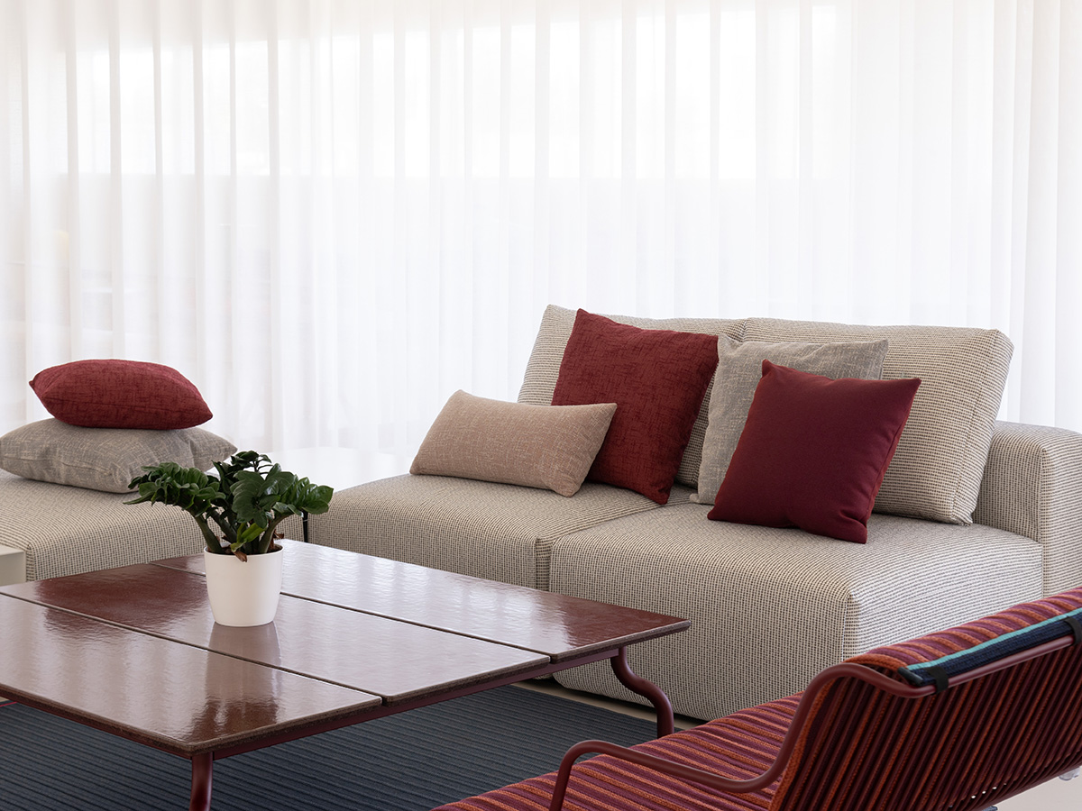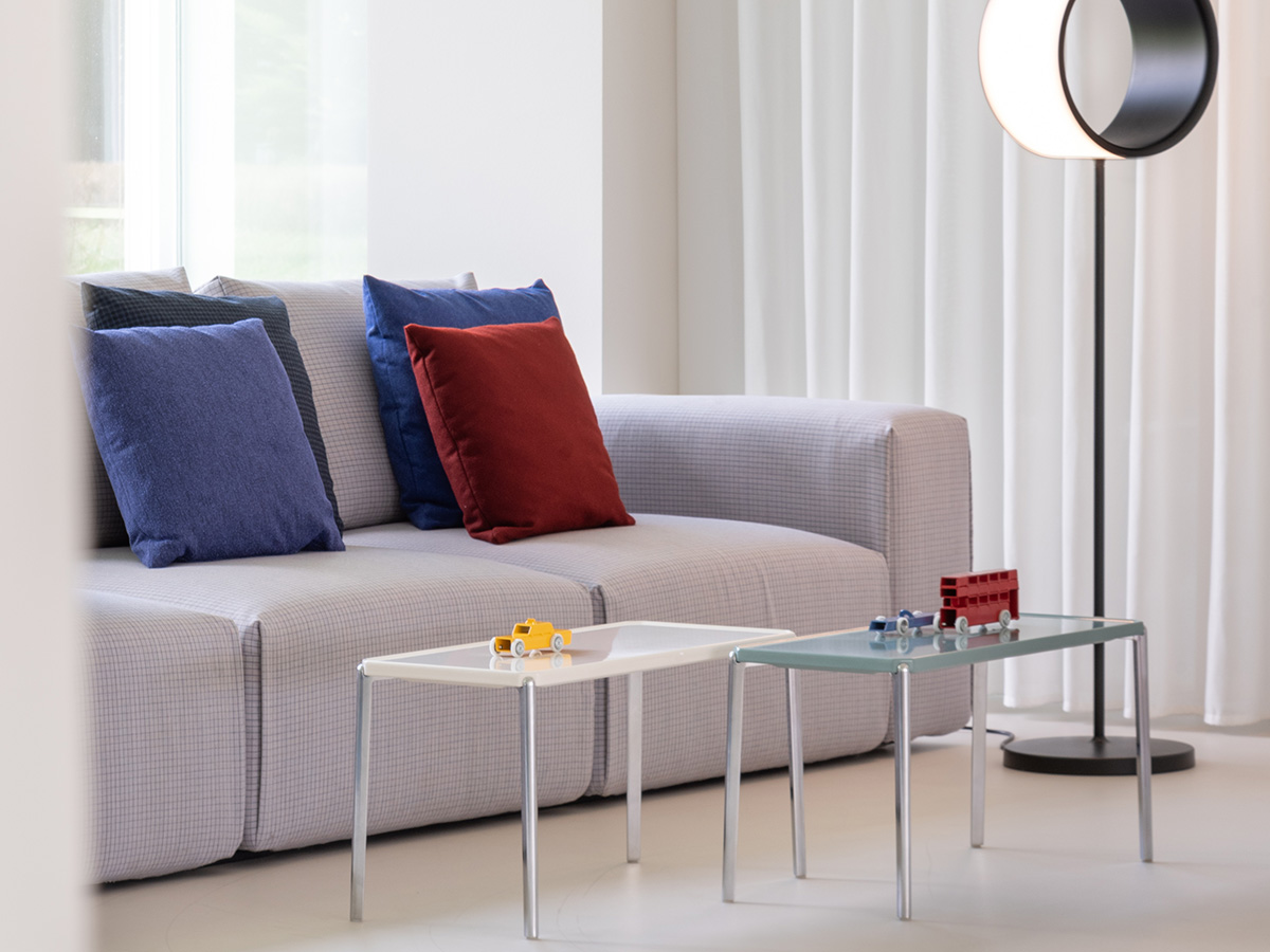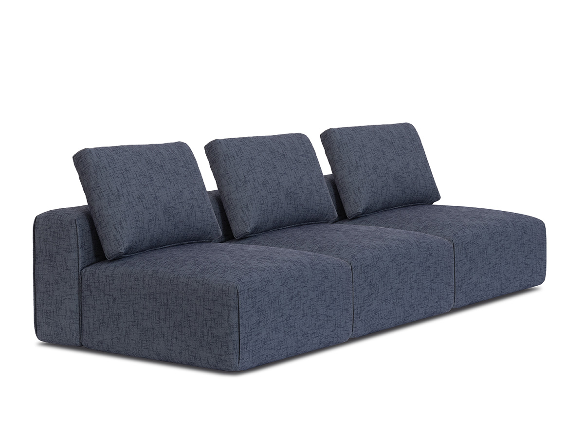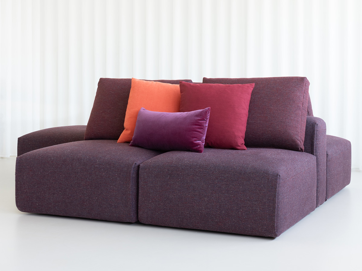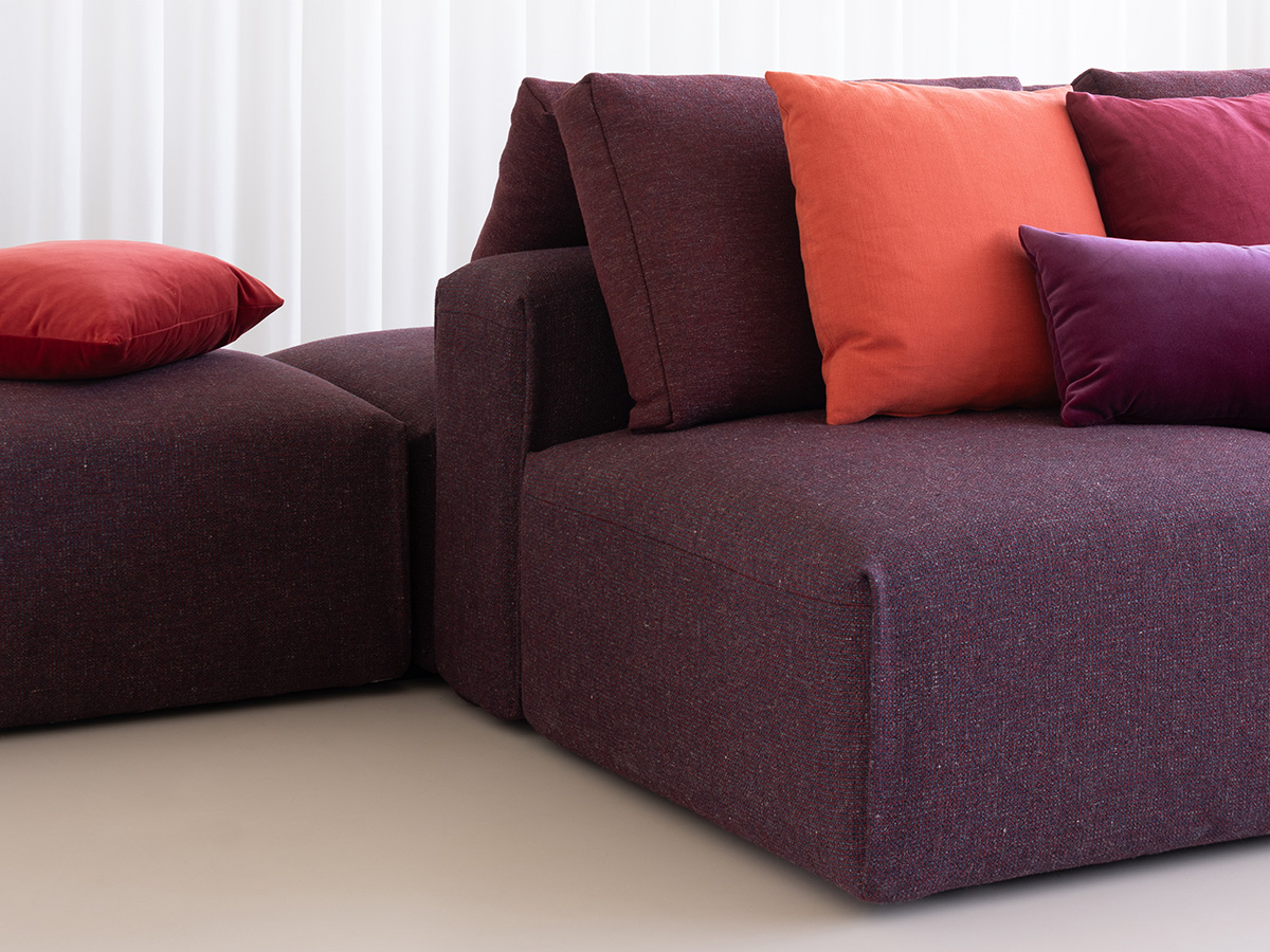 A modular sofa with essential and clear shapes, which fit well with contemporary taste and the typically modern home of the city. Costume has a structure made of recycled and recyclable polyethylene with a thickness of 4mm. The covering is available in different types of fabric to guarantee maximum compositional choice. Thanks to the elastic rings attached to the base, the sofa can be removed if necessary for washing or replaced over time. The modular system is made up of different units that can be freely positioned so as to create multifaceted and always new elements, perfect for any type of living or non-living context. The softness of the lines merges with a certain geometric rigor which instills security and makes possible the maximum freedom of expression.