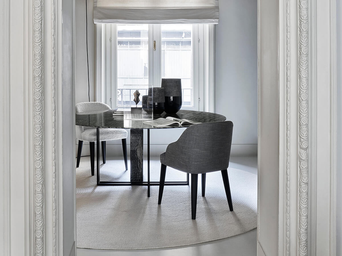 A chair with a light and elegant appearance, capable of combining tradition and modernity in a single interesting furnishing proposal. The lightness of Odette is due to the polimex structure, the result of a great technological innovation applied in the design of this model. Odette is available in versions with and without armrests, just hinted at by the curve of the structure. A range of coatings and textures ensures that this chair can be comfortably placed in living and dining environments, as well as in bedroom settings or common meeting spaces. Even contract environments do not disdain his contribution.