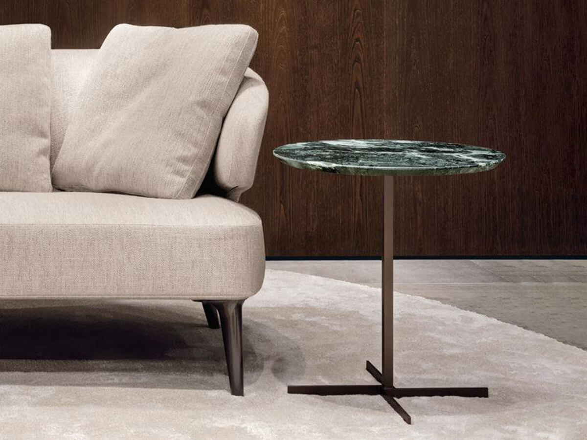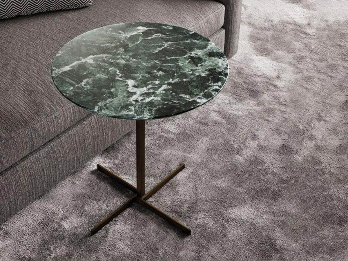 The Joy coffee table represents the emblem of a simple and essential aesthetic, capable of surprising without the aid of abundance. The choice of materials is crucial in this piece of furniture, artfully designed to offer an example of beauty that is not only formal but also visual. Issogne marble, with its typical green shades, was chosen for the top, available in both round and square versions, then associated with the elegant bronze painted metal base. The resulting contrast is perfect, ideal for embellishing any room in the house and in particular a mature and extremely refined living space.