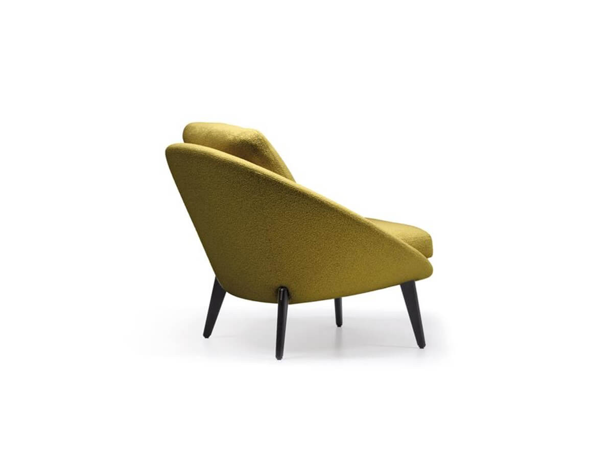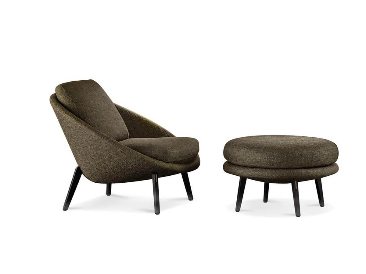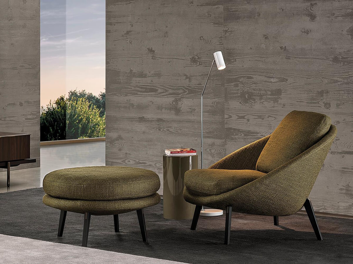 A 1950s reinterpretation with a contemporary flavor for the Lido armchair, designed by GamFratesi for Minotti. The round seat, with a continuous and enveloping curved line defines the padded shell, made more comfortable by the presence of cushions. Lido is available with either a sculptural "X" base, in aluminum covered in brushed ash lacquered in moka color, both with legs in wood with a choice of brushed ash lacquered in moka color or dark stained canaletto walnut brown and matt polyester lacquer. The Lido armchair is also equipped with a footrest and can be covered in completely removable fabrics or leathers.