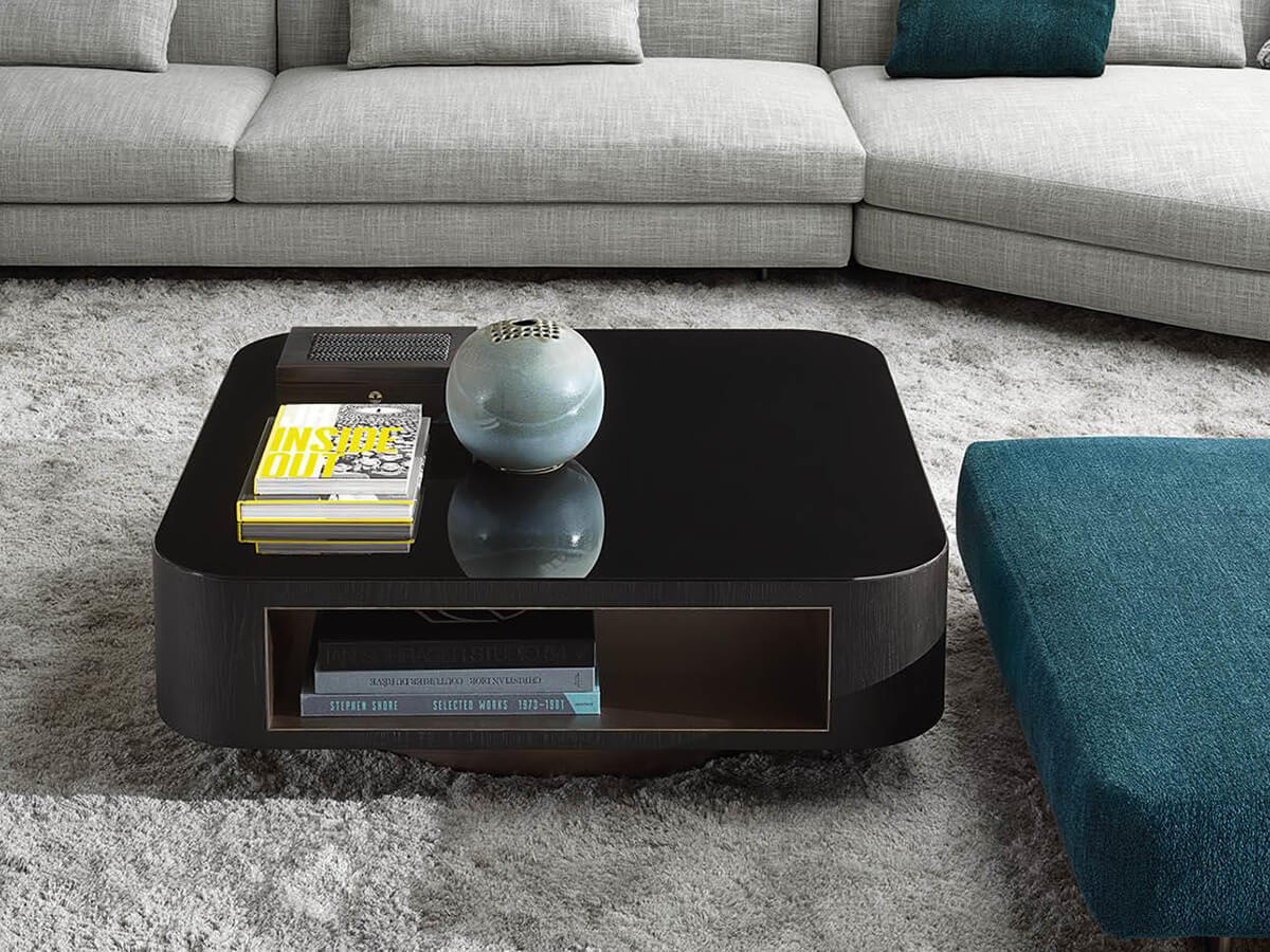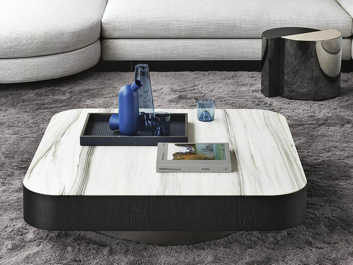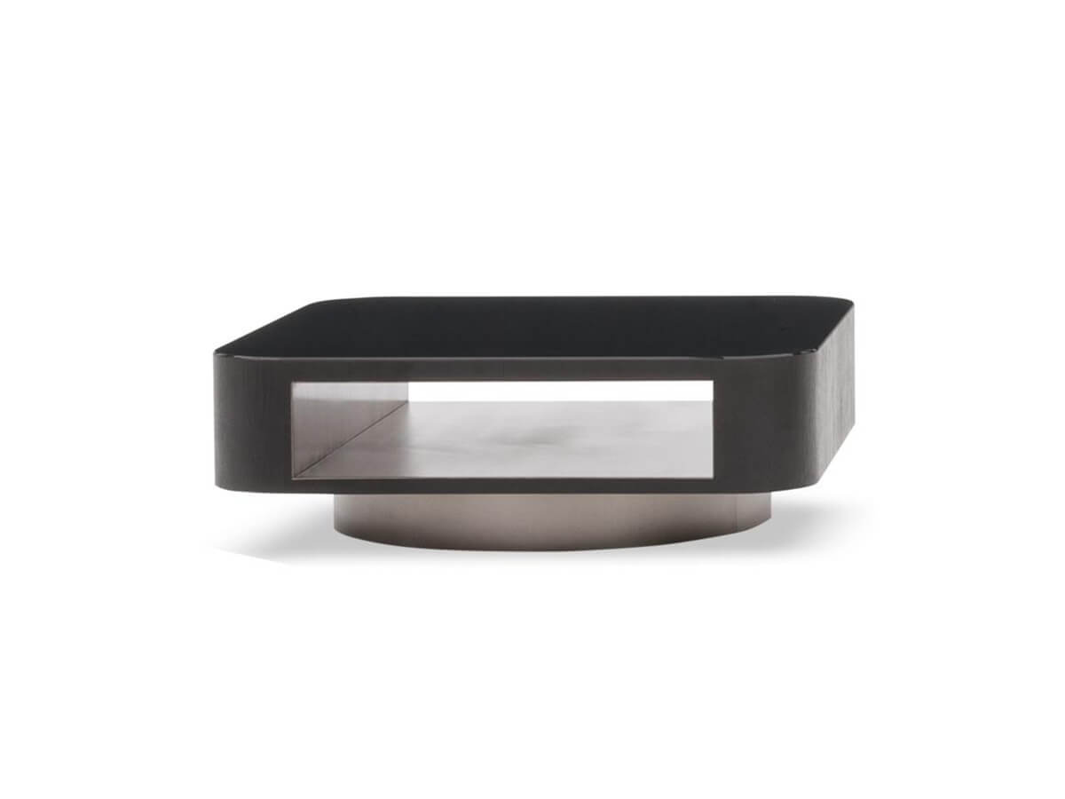 The Milton coffee table collection is declined in numerous proposals with generous, geometric volumes and great formal rigor. The strength of these circular, square, rectangular and trapezoidal tops is softened by the choice of using rounded corners that refer to the sinuous curves of the Alexander “Drop” seating system. The exquisitely retro 70s-inspired design plays on the combination of materials and geometries, creating suggestions of extreme aesthetic taste capable of making Milton the ideal coffee table for refined living rooms and living spaces. The rear metal plinth of the base helps to raise the figure from the ground, giving it a connotation of visual and conceptual "suspension". The family is completed with square-shaped service elements with drawers or pass-through compartments also available in the swivel version.