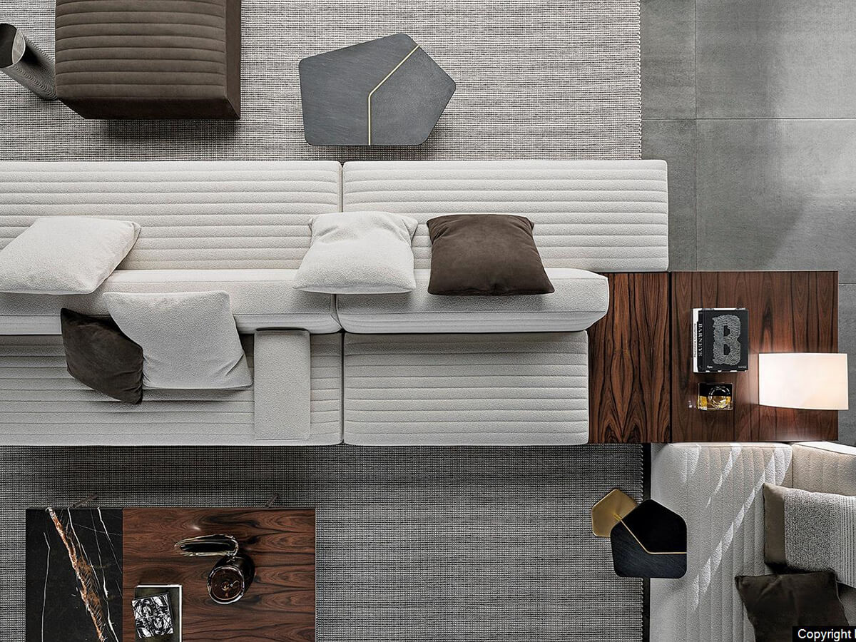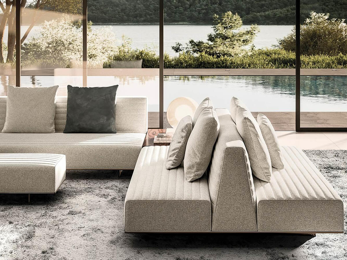 The Roger seating system was born from the collaboration between the designer Rodolfo Dordoni and the well-known brand Minotti. The combination of three types of different elements, each with its own structural characteristics, and the wide choice of armrests and support elements allow the realization of numerous new and original projects. The graphic quilting with long horizontal lines running along the backrests and seats gives great softness and richness surfaces thanks also to sophisticated upholstery and tailored packaging. The blades transversal that raise the sofa from the floor are almost imperceptible and give the impression that the sofa is suspended in space. Extremely versatile, Roger responds to every furnishing need in both residential and hospitality settings.