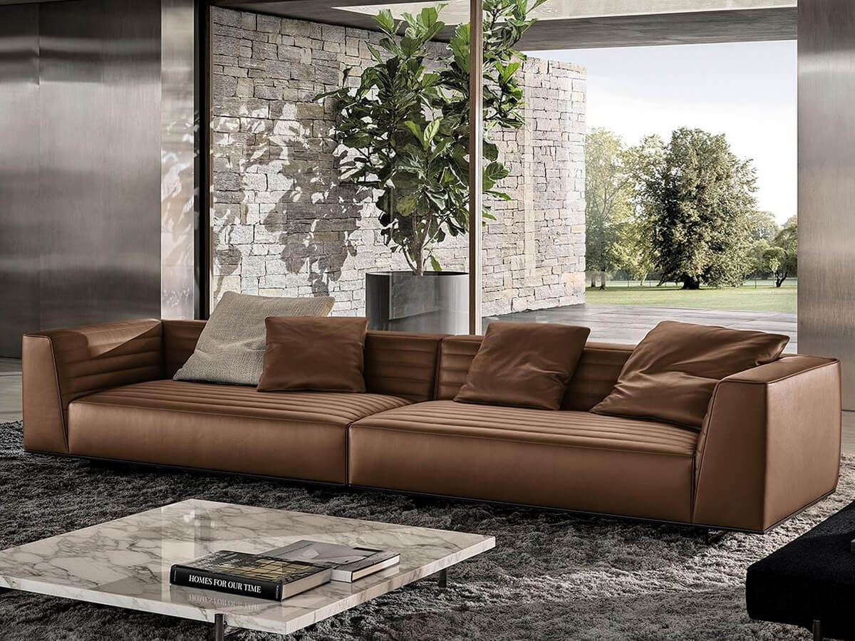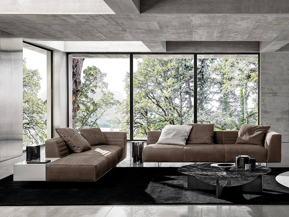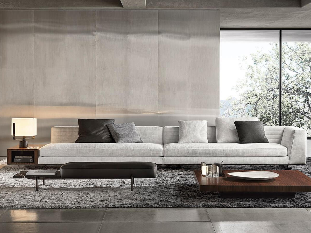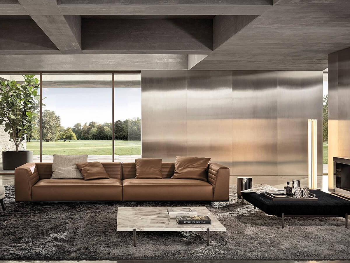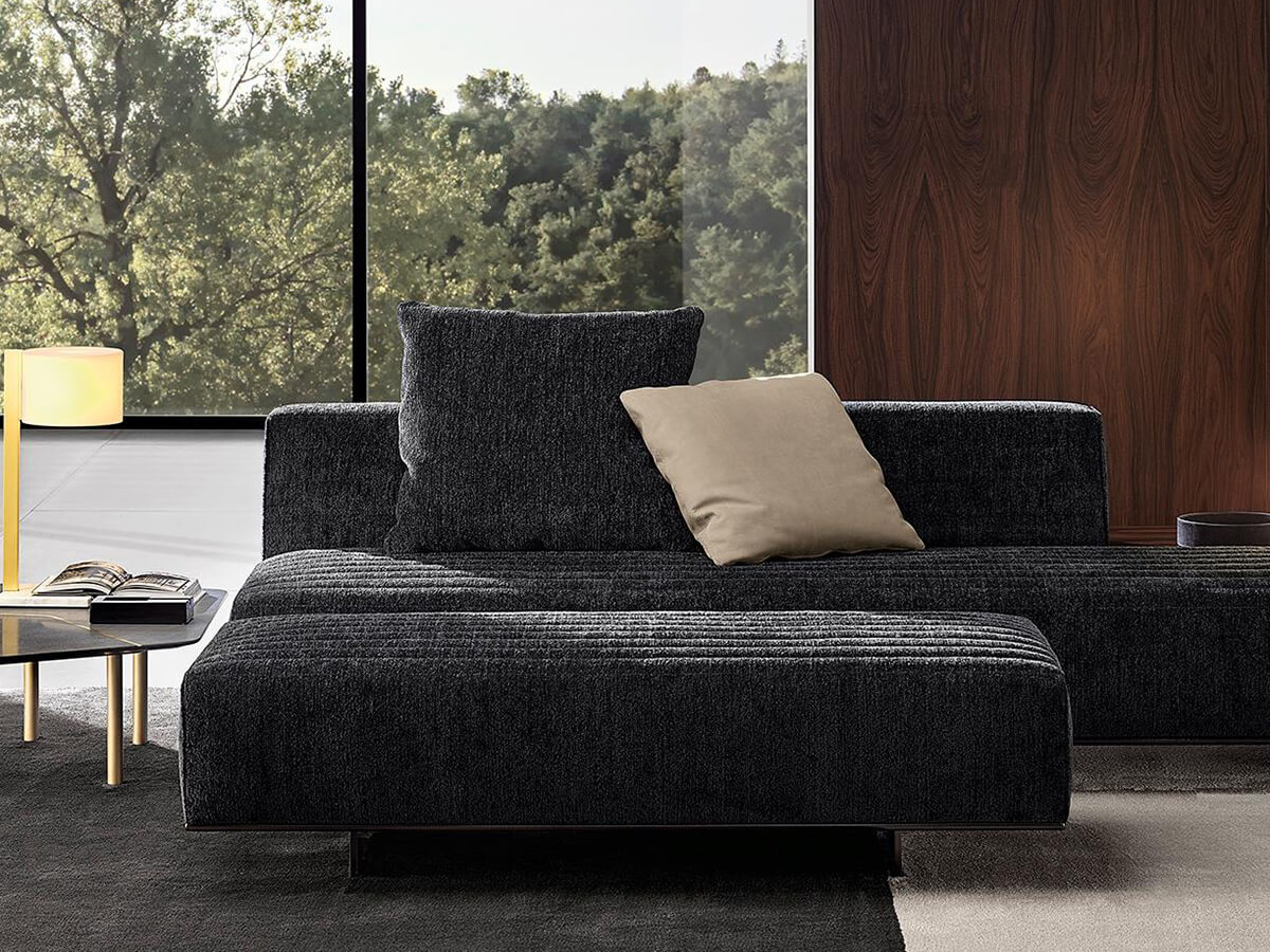 The Roger seating system was born from the collaboration between the designer Rodolfo Dordoni and the well-known brand Minotti. The combination of three types of different elements, each with its own structural characteristics, and the wide choice of armrests and support elements allow the realization of numerous new and original projects. The graphic quilting with long horizontal lines running along the backrests and seats gives great softness and richness surfaces thanks also to sophisticated upholstery and tailored packaging. The blades transversal that raise the sofa from the floor are almost imperceptible and give the impression that the sofa is suspended in space. Extremely versatile, Roger responds to every furnishing need in both residential and hospitality settings.