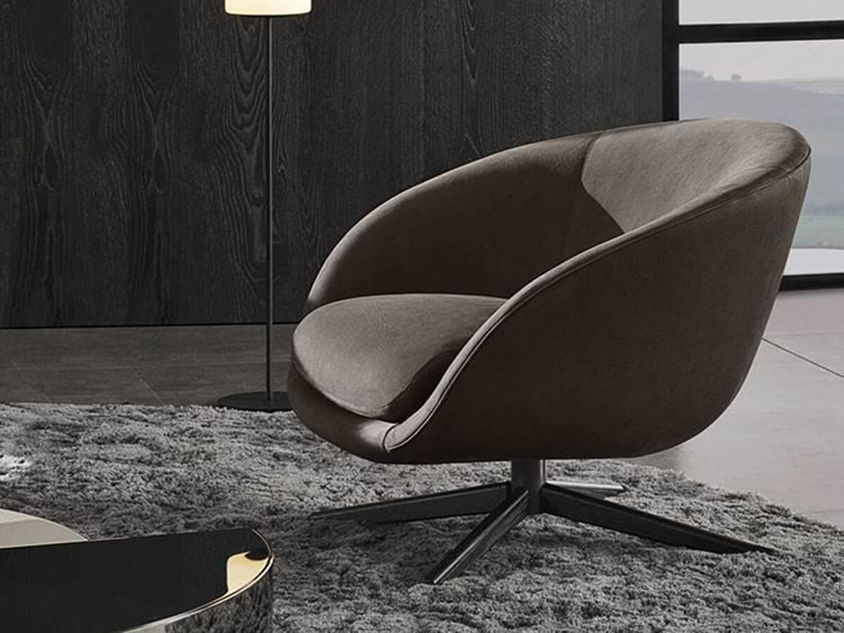 Russel seems to be a tribute to fashion and 1950s style composed, made up of elegant curves and sinuous vintage compositions. The homonymous by Minotti includes numerous seats declined in enveloping armchairs, lounge, dining and bergère armchairs, without however neglecting poufs, accessories and sofas. In each of these creations you can see the unmistakable line of the padded back that embraces and at the same time envelops the seat giving it an extremely intimate and comfortable appearance. The armchair is characterized by the fixed cross base in metal with sheathed feet, a virtuosic detail that is associated in turn with the swivel version for the lounge and dining armchairs as well as the bergère. Russell's sophisticated beauty does not go unnoticed, connoting spaces of extreme taste and refinement.