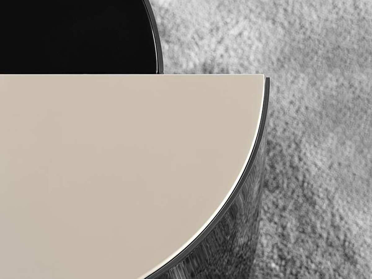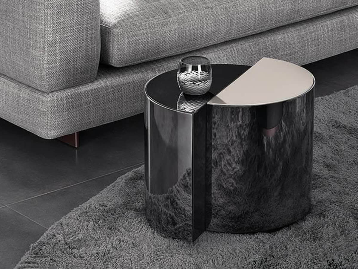Shields stands out for its strong sculptural imprint capable of bringing the imagination back to 70s styles and shapes. The structure is mainly divided into a single cylindrical geometric solid divided into two offset parts whose location gives dynamism and rhythm to the piece. The name of this coffee table, "shields" is due to the external sheet steel coating which, like a real shield, protects and characterizes it. Available in different sizes and heights, Shields owes its beauty also to the contrast of colors of the top, deliberately chosen to create a split between light / dark.
