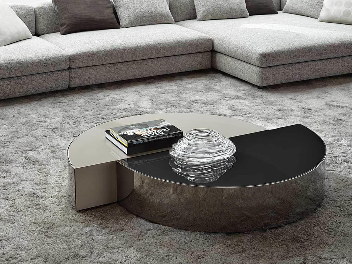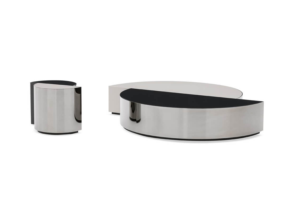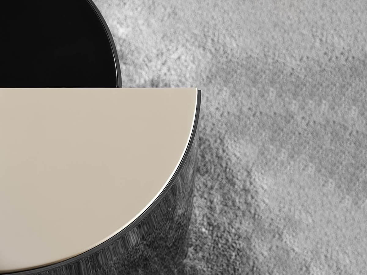 Shields stands out for its strong sculptural imprint capable of bringing the imagination back to 70s styles and shapes. The structure is mainly divided into a single cylindrical geometric solid divided into two offset parts whose location gives dynamism and rhythm to the piece. The name of this coffee table, "shields" is due to the external sheet steel coating which, like a real shield, protects and characterizes it. Available in different sizes and heights, Shields owes its beauty also to the contrast of colors of the top, deliberately chosen to create a split between light / dark.