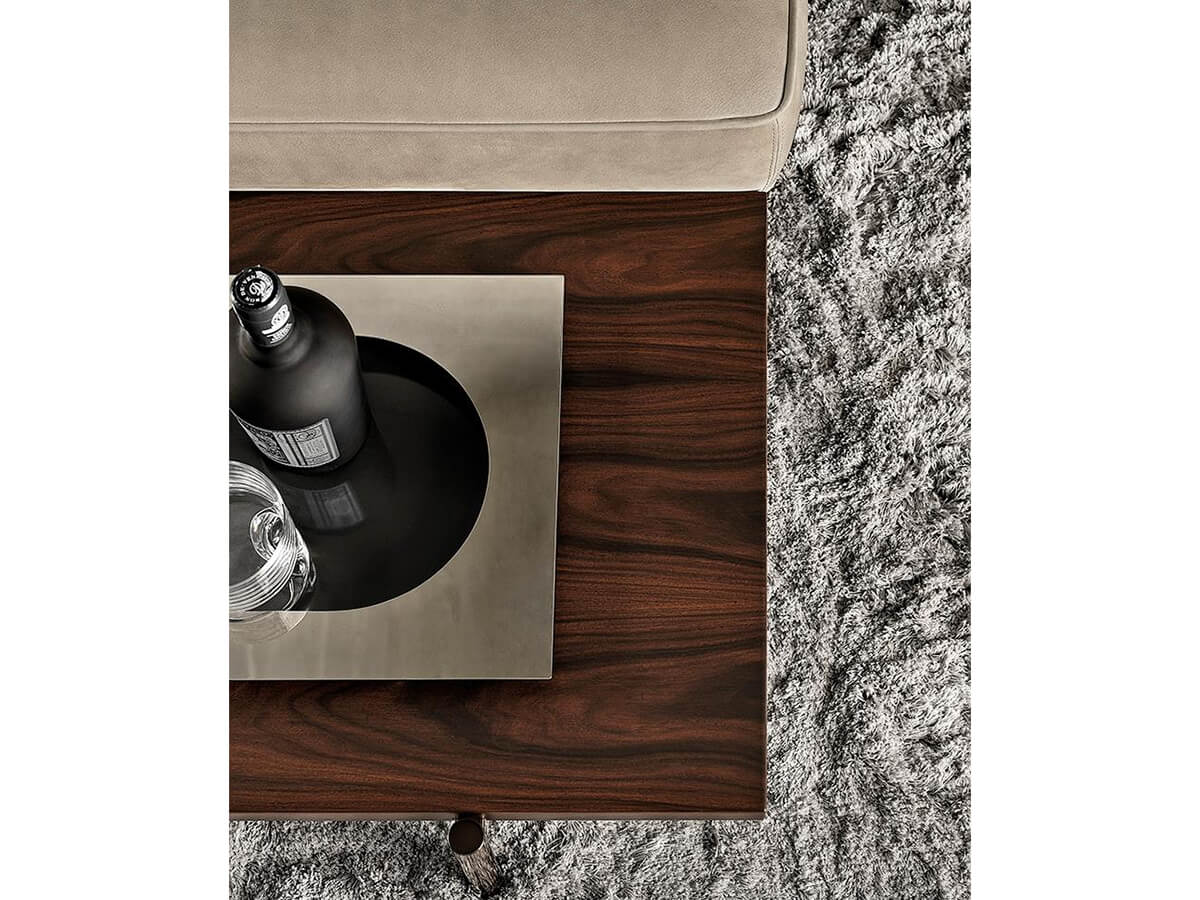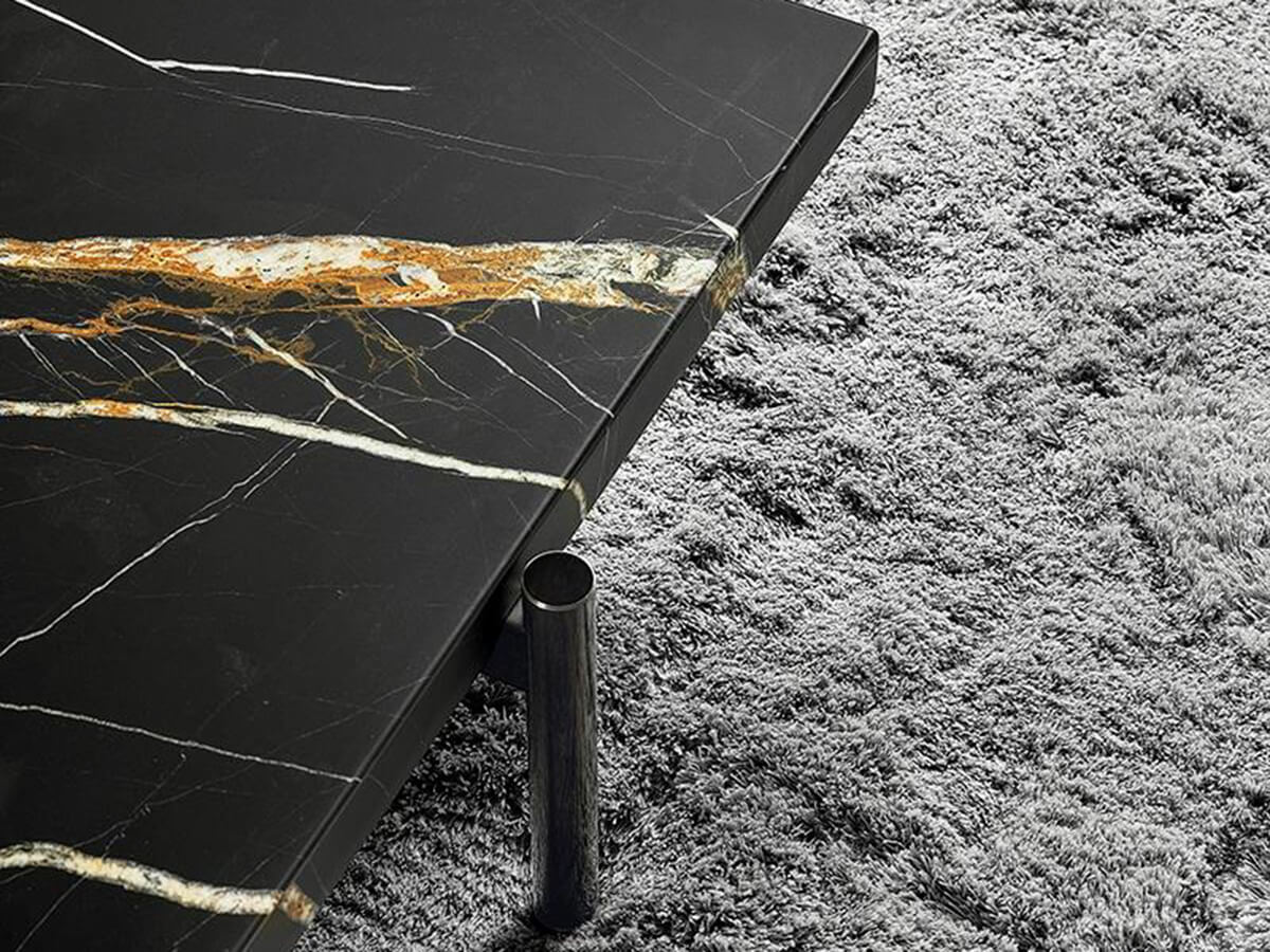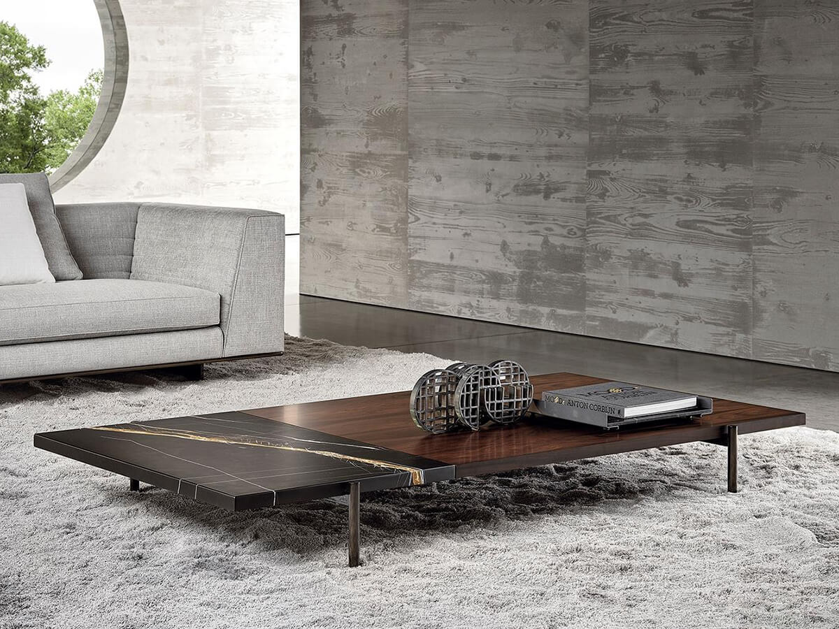 The graphic essentiality of the Superquadra coffee tables, designed by Marcio Kogan for Minotti, reflects to the architectural style used for a sample project in Brasilia in the 1950s. The tables of square and rectangular shape, available in two heights, have legs in aluminum rod brandy color and tops in marble, Calacatta or Sahara Noir, or in dark-stained Santos rosewood brown and lacquered in matt polyester with a single layer or also with dark stained canaletto walnut slats brown. These furnishing accessories are characterized by strong materiality, clearly visible in the versions with marbles and essences juxtaposed with each other, with an original aesthetic result. Positioned in proximity to sofas and seats, in an elegant game of overlapping, the Superquadra coffee tables elegantly complete the living area.