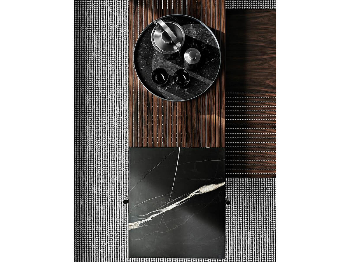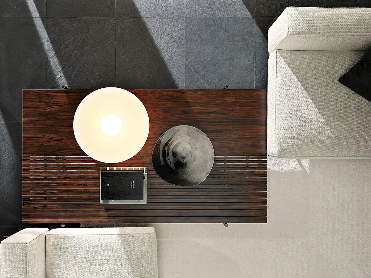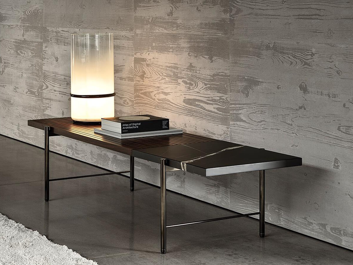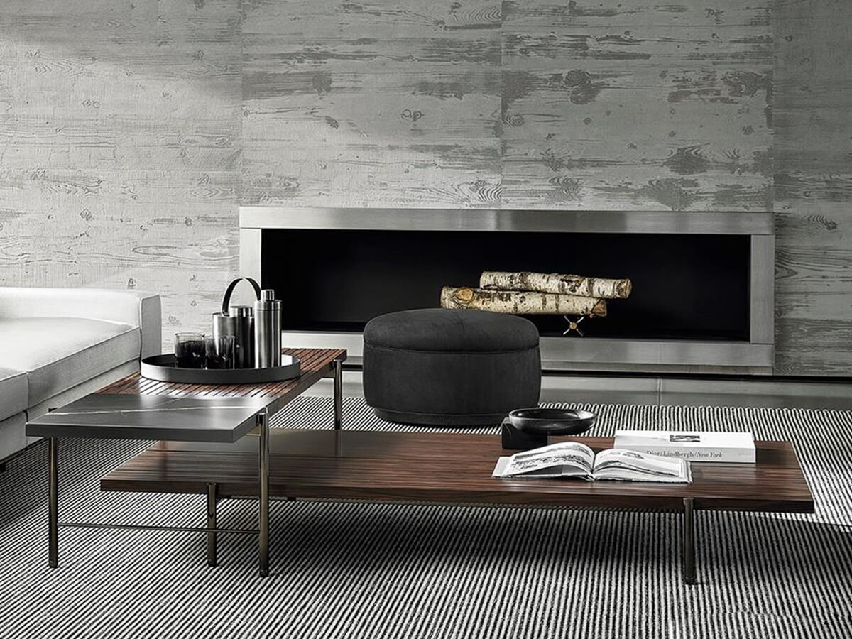 The graphic essentiality of the Superquadra coffee tables, designed by Marcio Kogan for Minotti, reflects to the architectural style used for a sample project in Brasilia in the 1950s. The tables of square and rectangular shape, available in two heights, have legs in aluminum rod brandy color and tops in marble, Calacatta or Sahara Noir, or in dark-stained Santos rosewood brown and lacquered in matt polyester with a single layer or also with dark stained canaletto walnut slats brown. These furnishing accessories are characterized by strong materiality, clearly visible in the versions with marbles and essences juxtaposed with each other, with an original aesthetic result. Positioned in proximity to sofas and seats, in an elegant game of overlapping, the Superquadra coffee tables elegantly complete the living area.