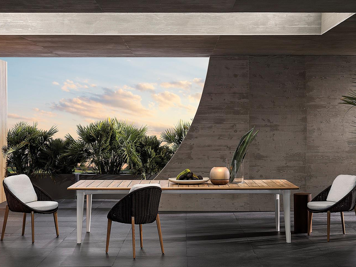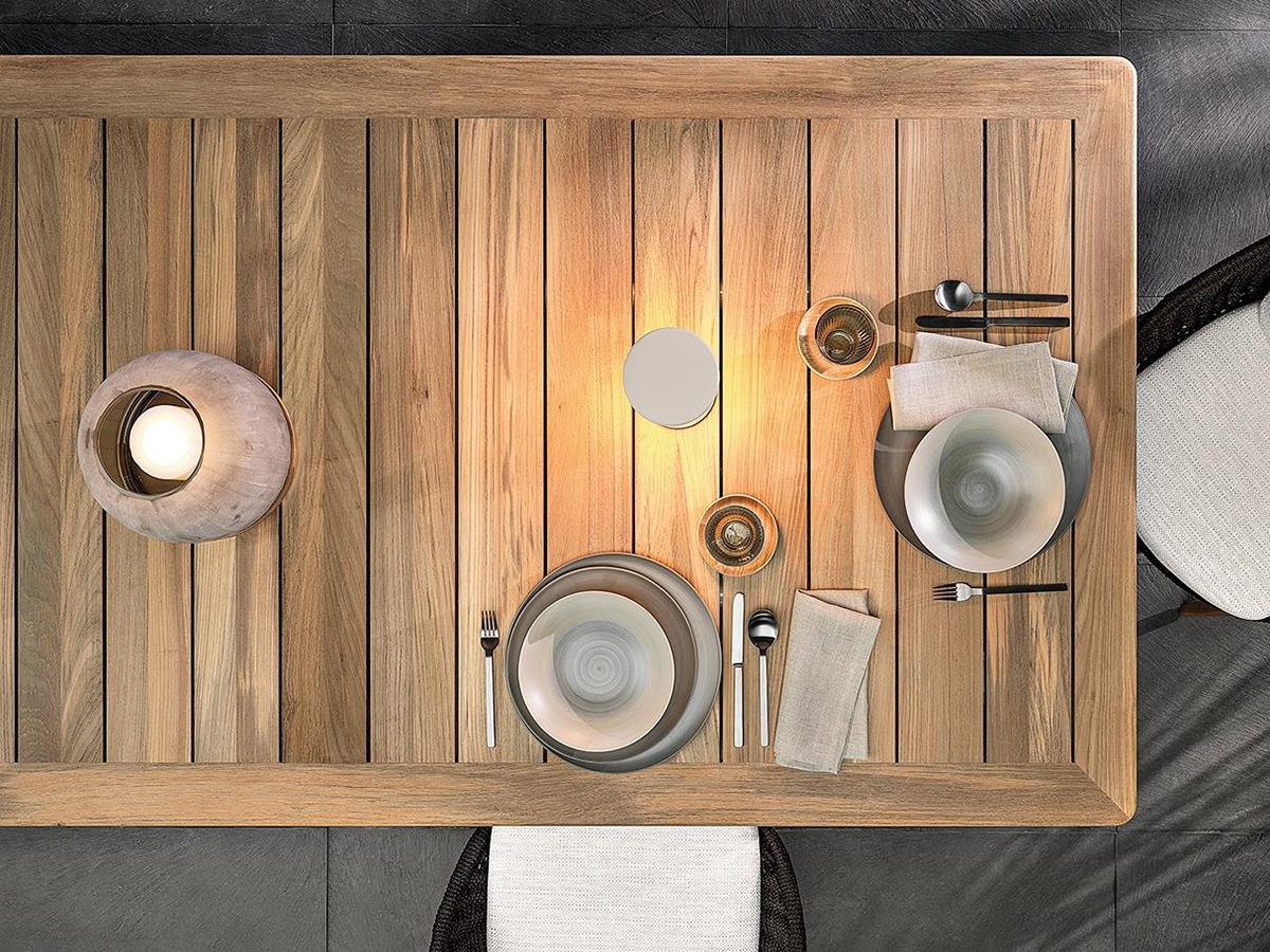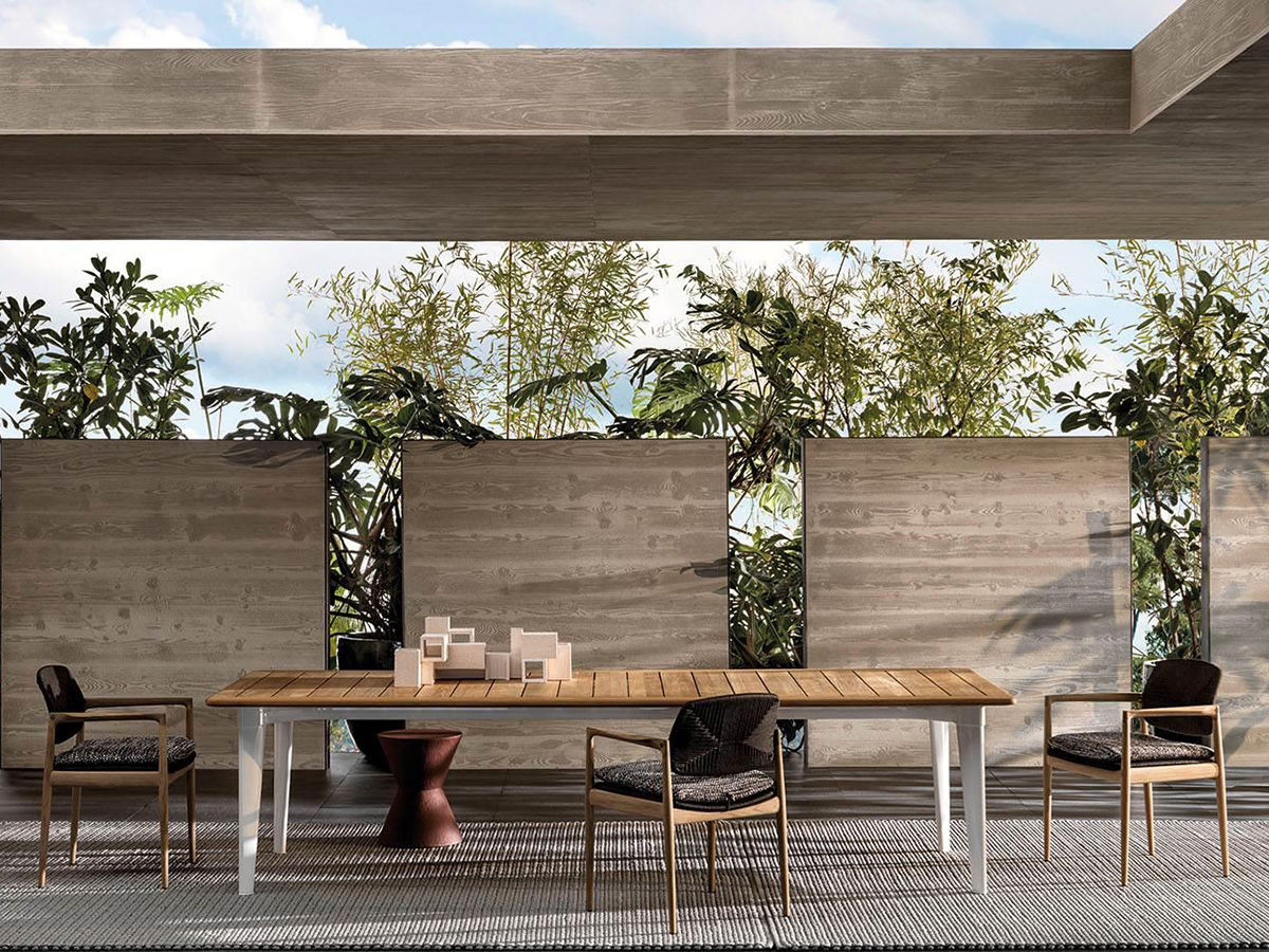 A table with an exquisitely architectural taste, modeled halfway between a sculpture and a design item. Terrace stands out from other Minotti outdoor proposals for its tapered legs and exquisitely retro aesthetics, as well as for the thin teak top that is well suited for outdoor use. The main body, made of cast aluminum, stands out for the choice of glossy and modern finishes, perfect for combining the company's outdoor style. The rectangular top is available in three different dimensions, created to be placed in any outdoor environment, from the most to the least spacious.