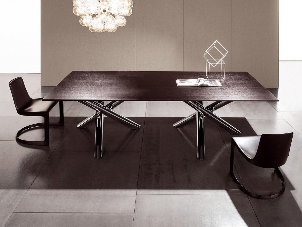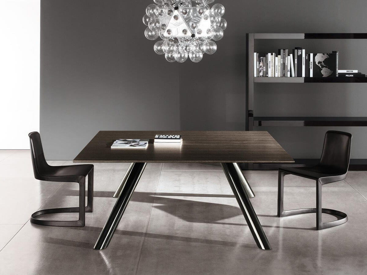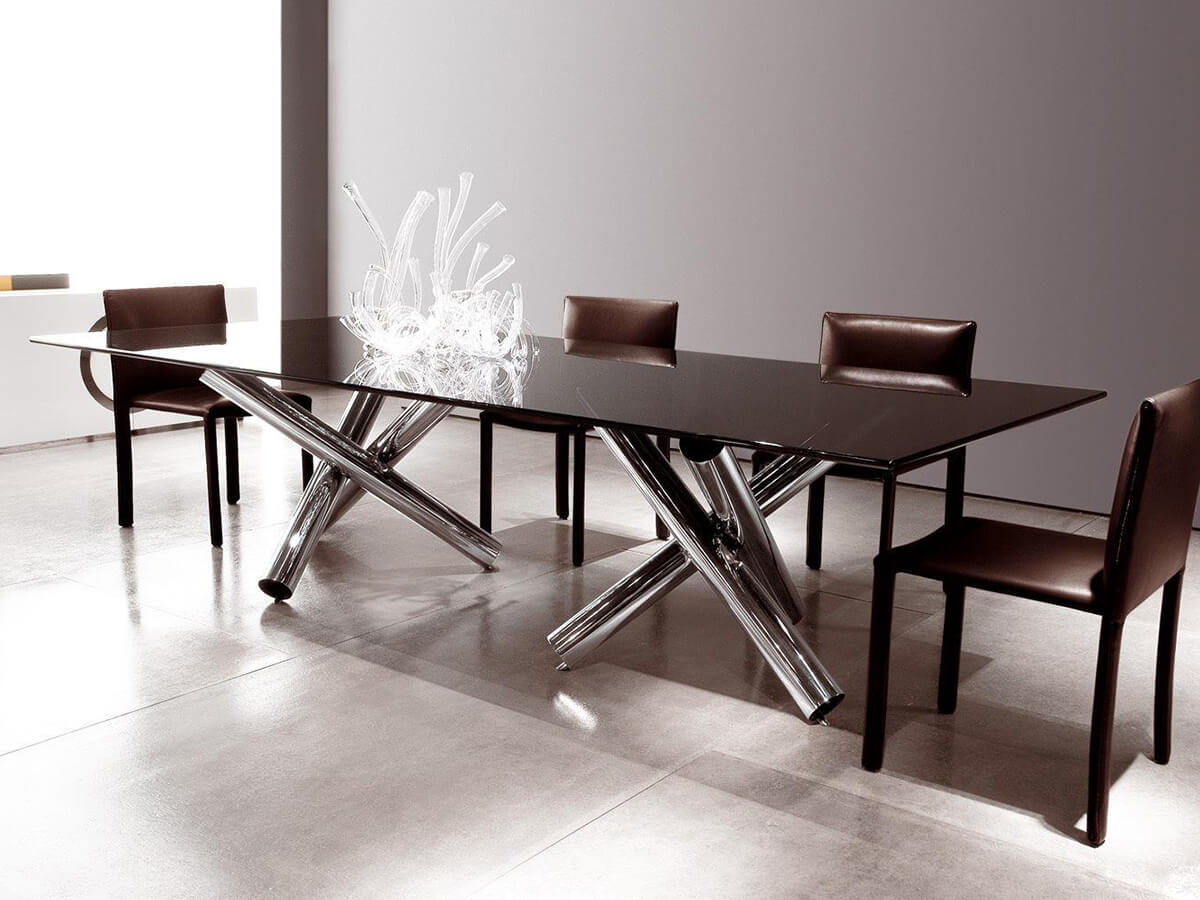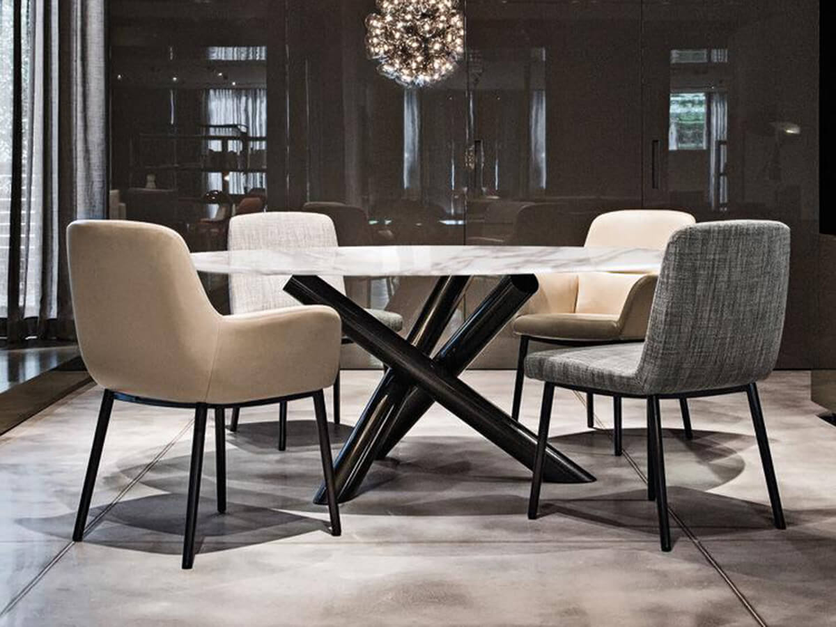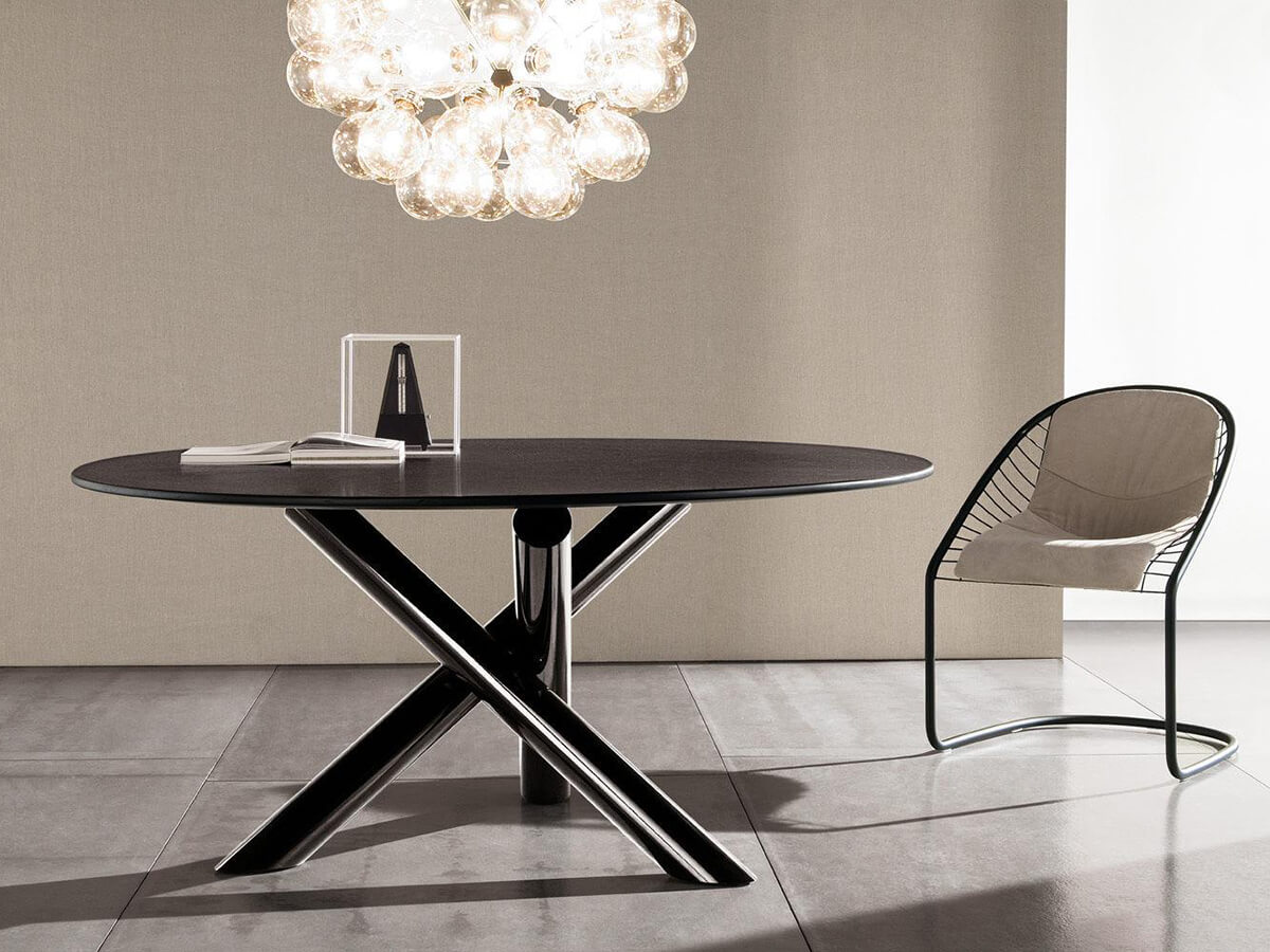Halfway between a sculpture and a piece of furniture, the Van Dyck table combines the refinement of construction details with extremely fine finishes. The characteristic support base consists of three metal tubes with a diameter of 10 centimeters welded together to create a highly suggestive shape. The top is available in round, square and rectangular versions, in different sizes. Here, too, the available finishes are developed in a unique assortment aimed at promoting unparalleled customization that ranges from marble, wood, glass, lacquer and much more. The personality of the Von Dyck table stands out in any environment, thus finding its place in different contexts and living dimensions.