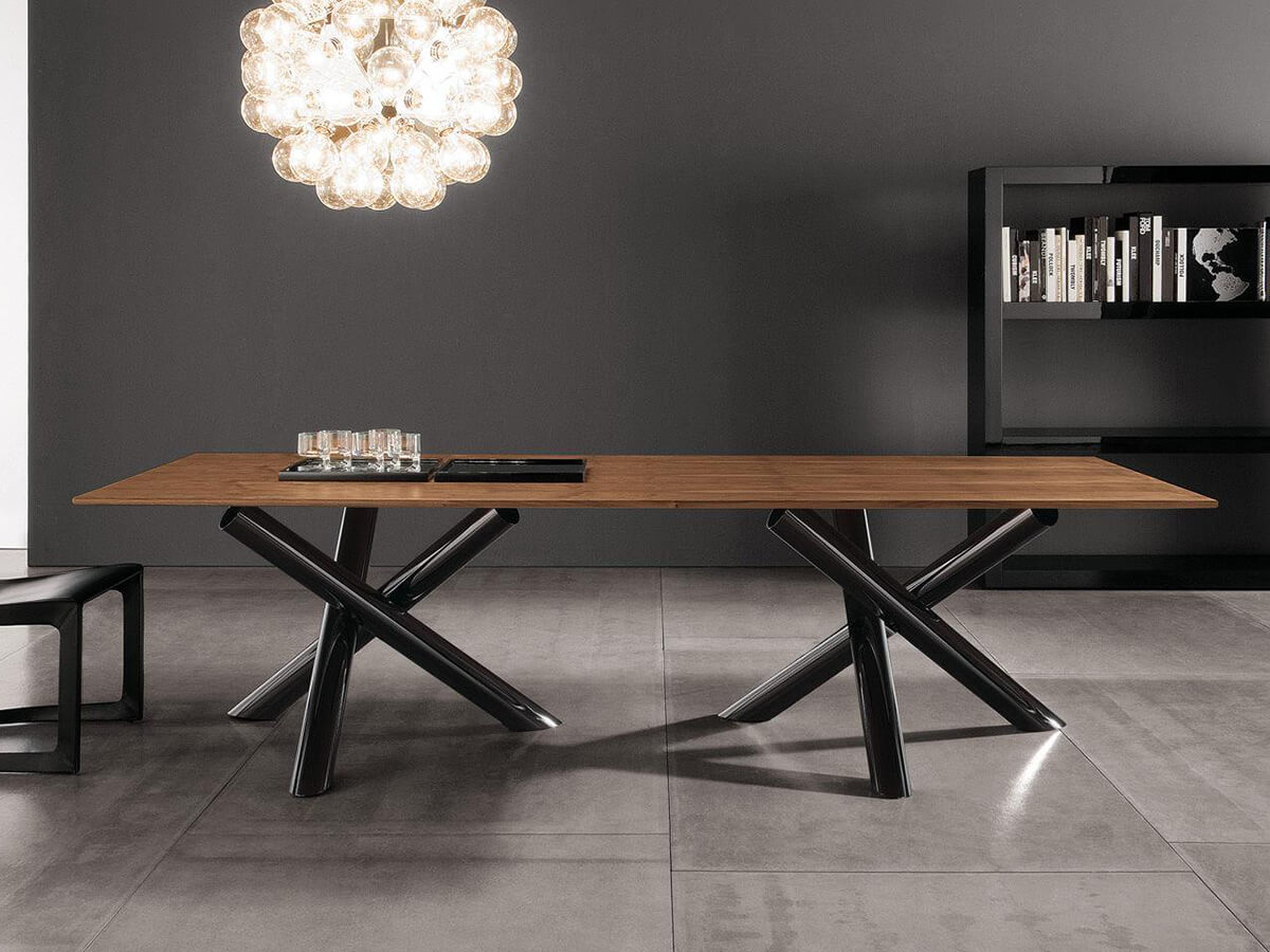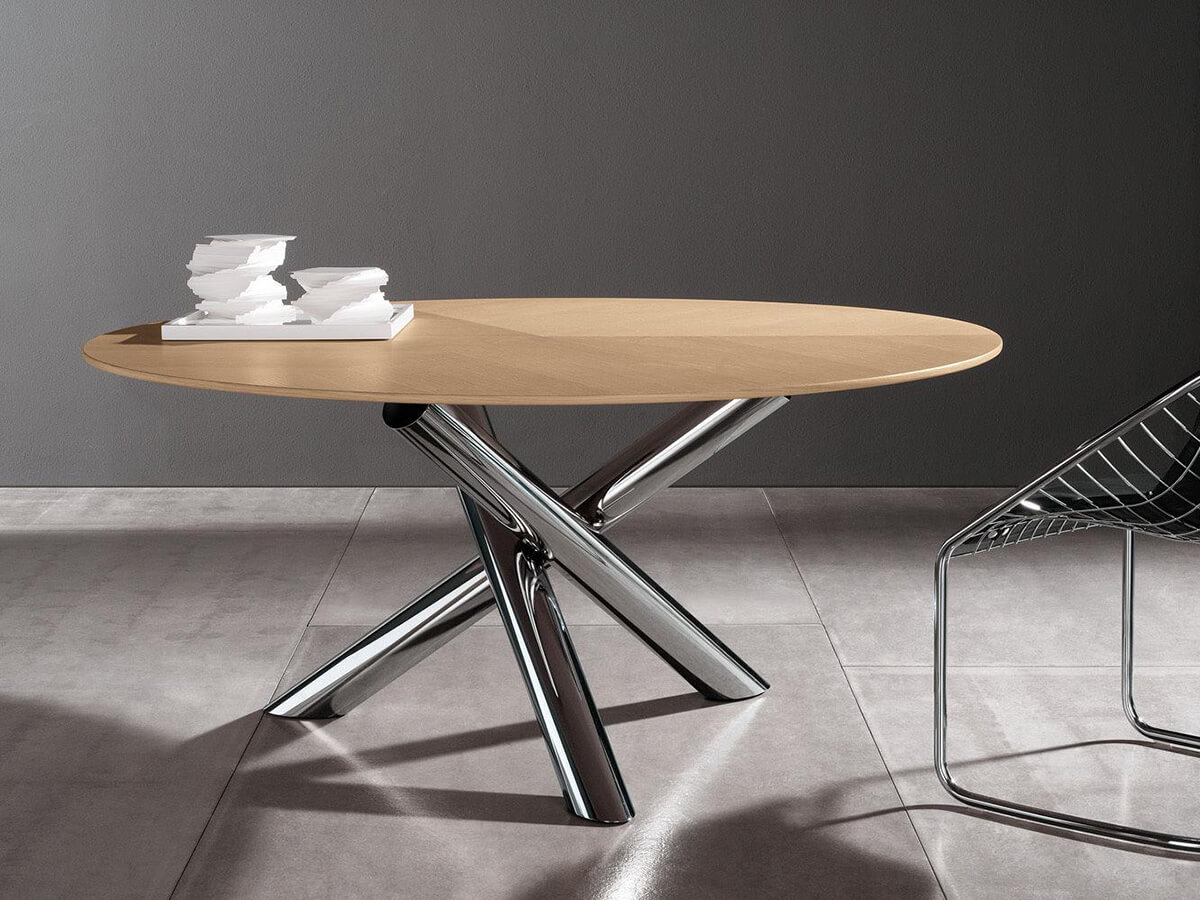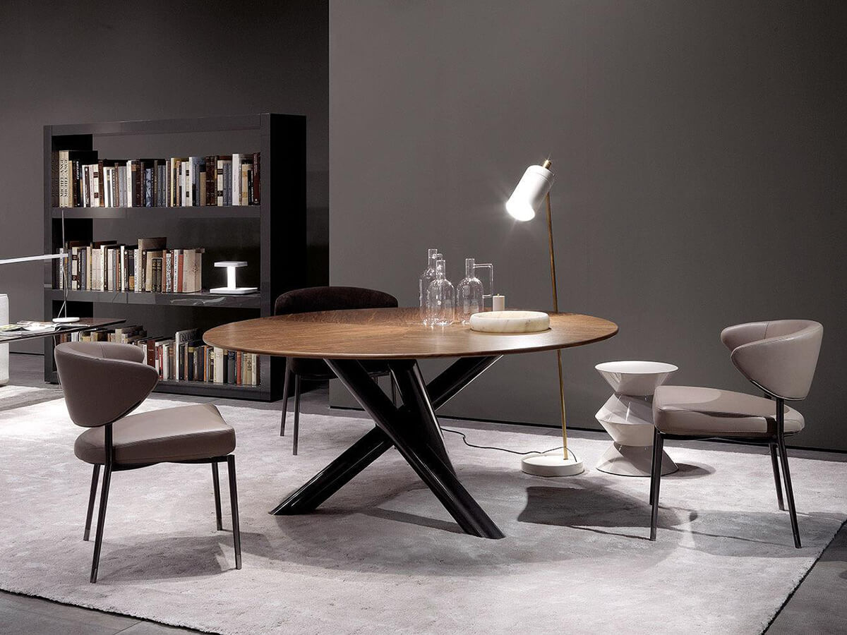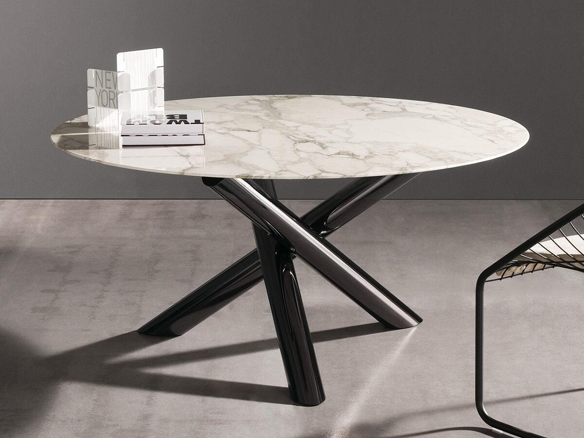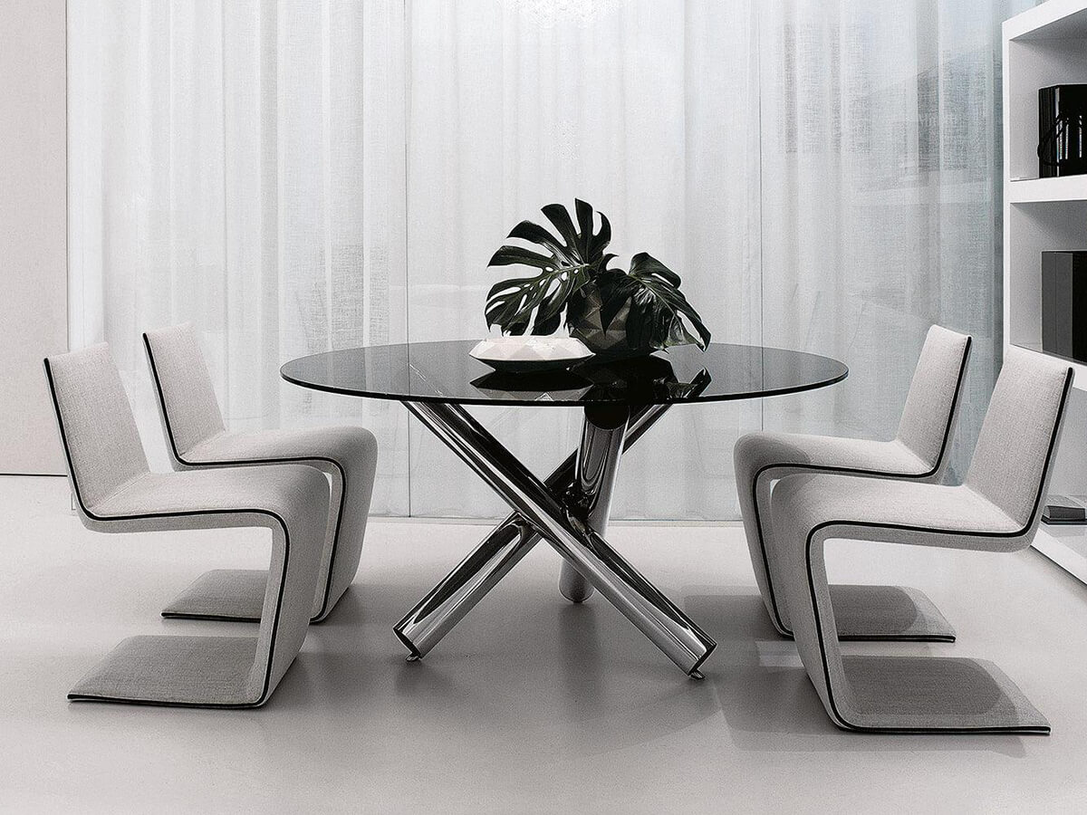 Halfway between a sculpture and a piece of furniture, the Van Dyck table combines the refinement of construction details with extremely fine finishes. The characteristic support base consists of three metal tubes with a diameter of 10 centimeters welded together to create a highly suggestive shape. The top is available in round, square and rectangular versions, in different sizes. Here, too, the available finishes are developed in a unique assortment aimed at promoting unparalleled customization that ranges from marble, wood, glass, lacquer and much more. The personality of the Von Dyck table stands out in any environment, thus finding its place in different contexts and living dimensions.