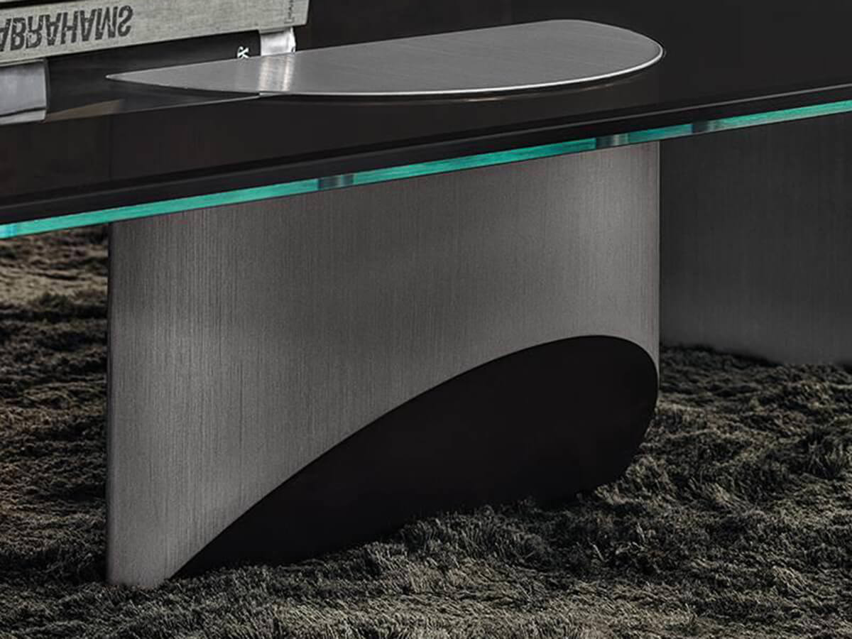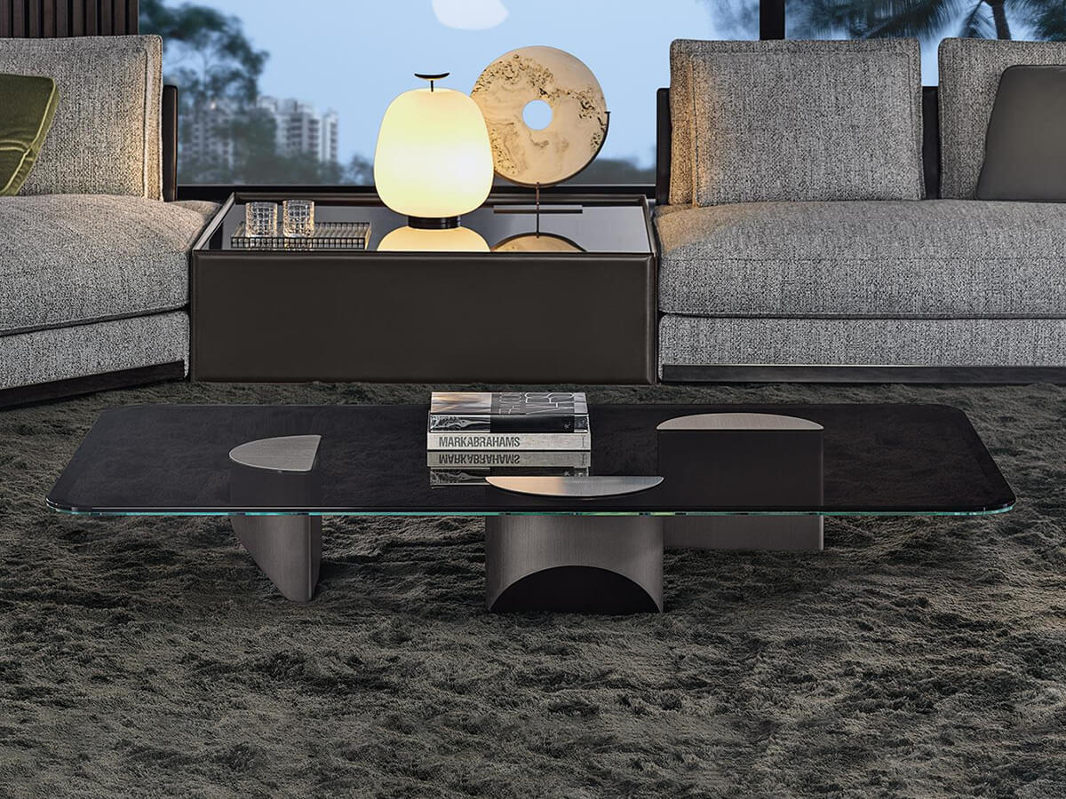 The Wedge coffee table stands out from the numerous Minotti proposals for the peculiar shape of the legs, modeled to lighten the supporting structure and give an unusual touch. The oblique chisel-point cut of these semicircular supports create the illusion that the table rests on tiptoe on the ground. The resulting visual effect is highly suggestive and novel. A further highlight is the choice of the glass or wood top, perfect for letting a glimpse of the underlying design or intuiting its great aesthetic value. Even in the table version for the dining space, Wedge does not lose its peculiar touch, giving life to refined spaces.