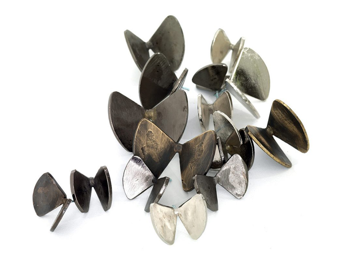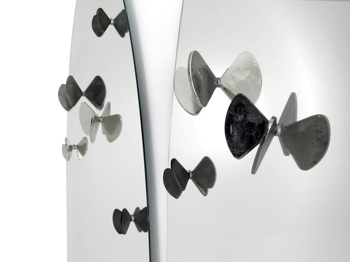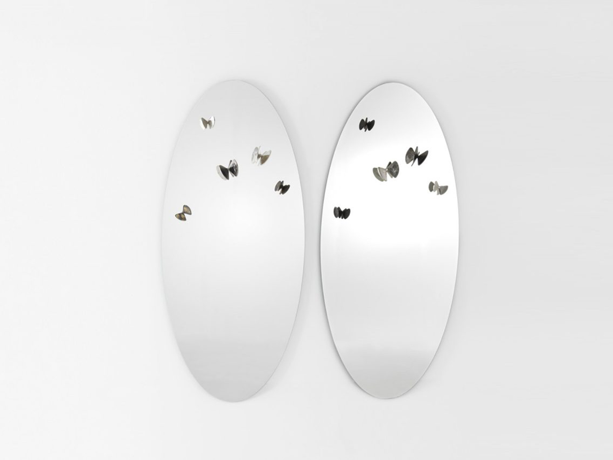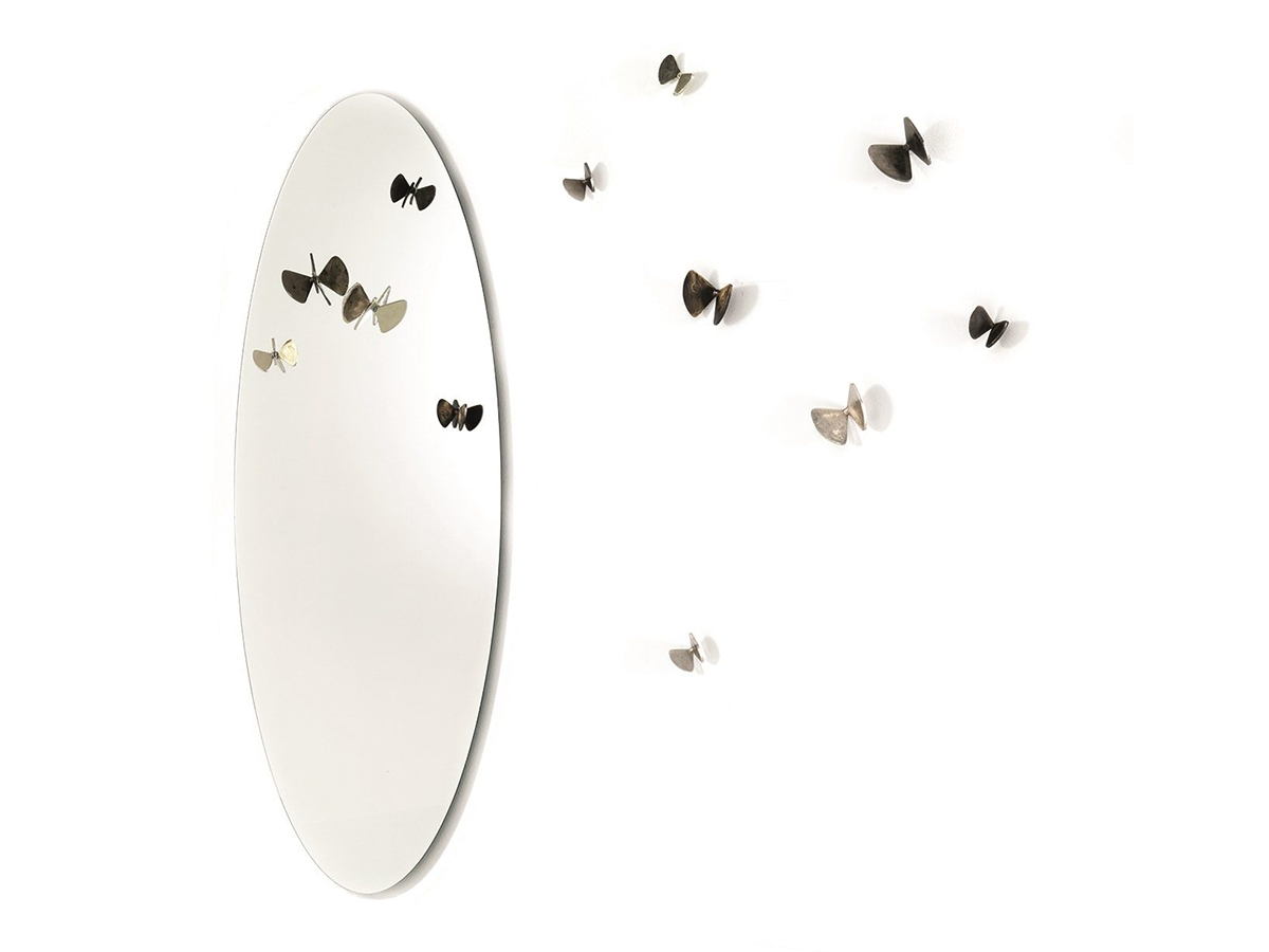 A mirror that embodies the desire to dream and above all, experiment with materials. Bice is a mirror with an apparently ordinary, oval design, enriched however by a multitude of small butterflies in cast brass in different colors that embellish its surface creating a playful and unusual effect. The butterflies also act as wall coat racks as it is possible to fix them to the wall as desired, following your personal taste. Bice is available both with and without butterfly coat racks depending on the use you want to make of it. Ideal for bedrooms, it also adapts perfectly to living contexts.