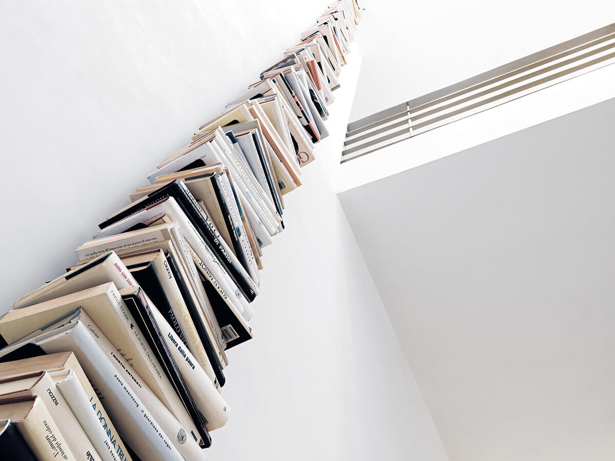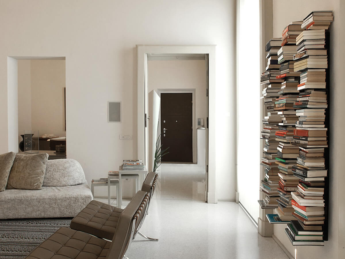 A classic of modern furniture. Ptolomeo is a self-standing bookcase with a simple and rigorous design, essential to make room for the main guest for whom it was conceived: books. Ptolomeo eliminates the superfluous by being essential for a single steel column to which thin steel shelves are joined. The shelves disappear as the column fills with books. Since its inception in 2004 it has established itself as an icon of the design of the sector, then structured in different heights fixed on the solid base in stainless steel or lacquered metal coordinated with the structure specially designed to ensure its stability.