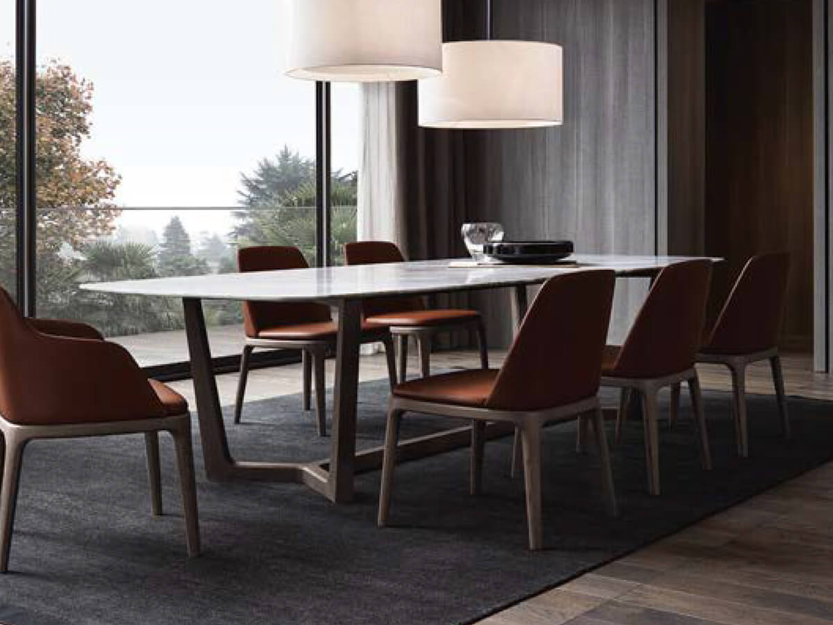 Concorde is a table for the dining area, designed by Emmanuel Gallina and produced by Poliform. Its elegant and masterfully modeled physiognomy makes it a versatile piece of furniture, capable of adapting to any context and style of the house. This fixed table with solid wood legs offers different variants for the top, available in wood, marble, glass and many more variants depending on the taste. Nonetheless, Concorde is offered by the company in both a rectangular version with rounded corners and a round one, perfect for enhancing the geometry of the legs. Also available as a desk, Concorde is a must for contemporary furniture.