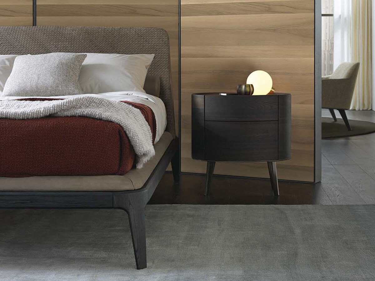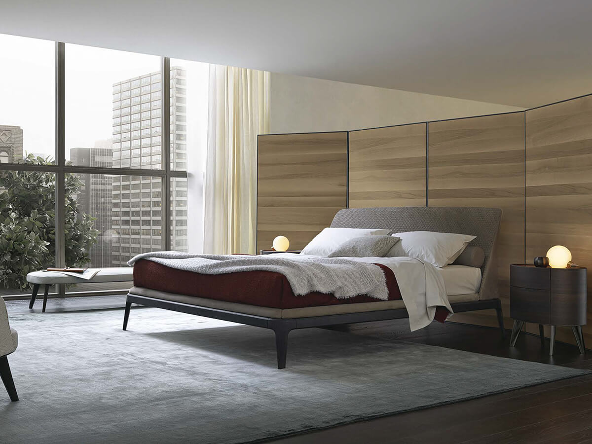 Kelly is one of the most iconic Poliform beds, whose international success is mainly due to the successful balance of aesthetics and functionality that has always characterized every product of the company. Supported by the delicate lines of the solid wood structure upholstered with details in wood and derivatives, the structure of the Kelly bed then extends into the beautiful headboard in molded polyurethane, with polyester wadding and final removable cover in fabric, leather or woven leather. The characteristic design of the latter element differentiates Emmanuel Gallina's work from many others in the sector, giving that particular touch that many desire for their home