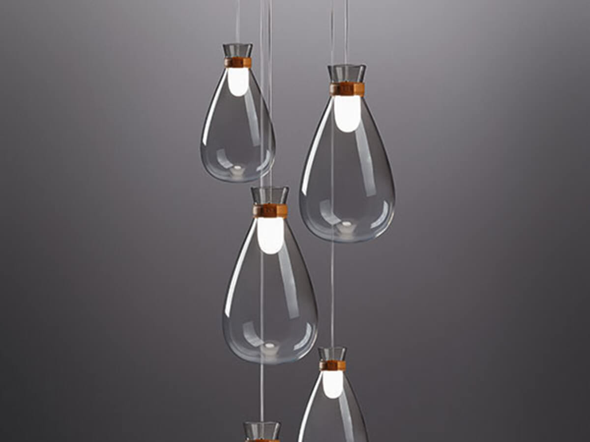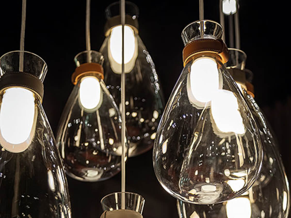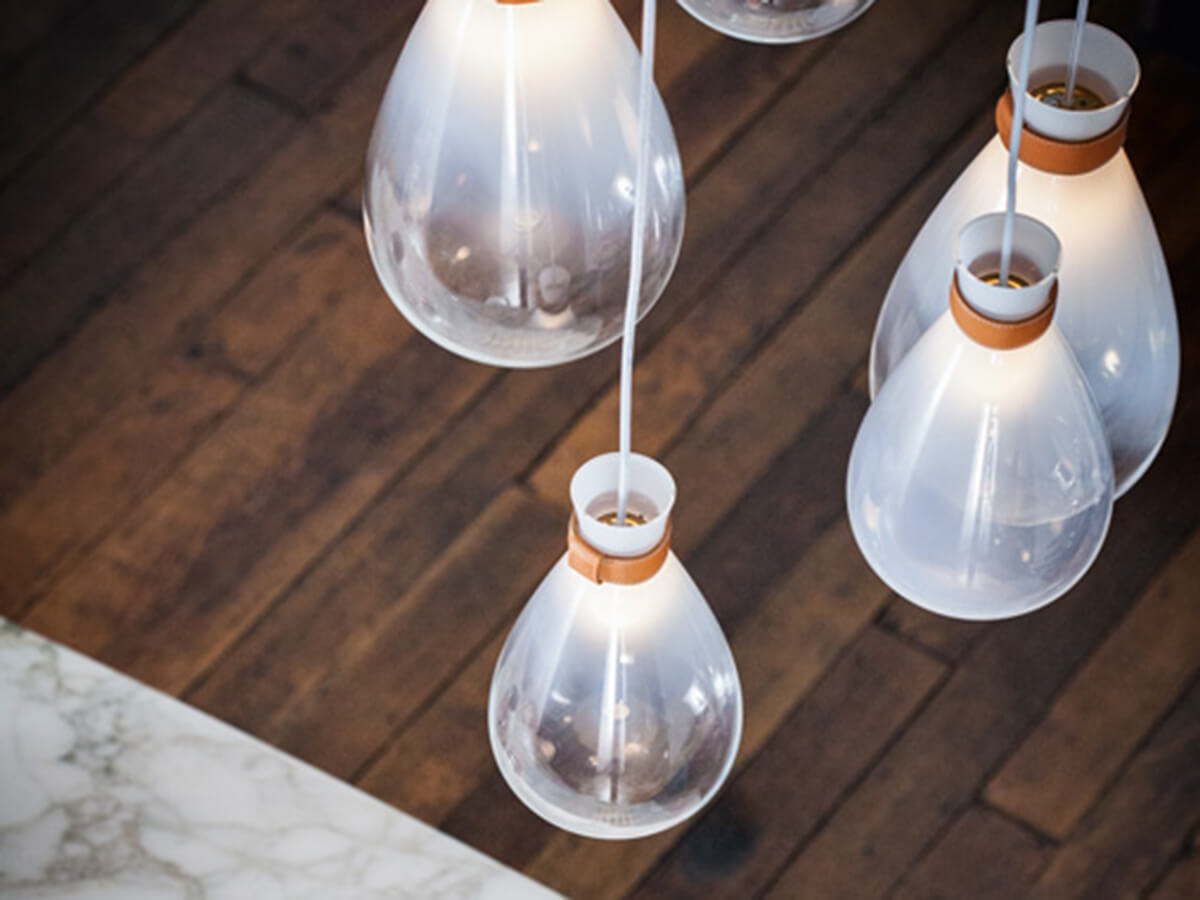 Soffi represents a tribute to the purity of light and blown glass. From the art of the skilled Venetian masters comes his minimal and extremely inspired design, which Gamfratesi has been able to translate, giving life to a luminous piece of furniture that is unique in its kind. Delicate and irregular globes seem to emerge from a thin leather bracelet, suspended in space by the force of gravity. Soffi lamps consist of two elements, both in blown glass: the outer globe has a shaded and sloping color while the inside of the lighting body is in opaque blown glass with pearl finishes. By switching on the lamp, the light is thus spread evenly, projecting a uniform and particularly pleasant glow.