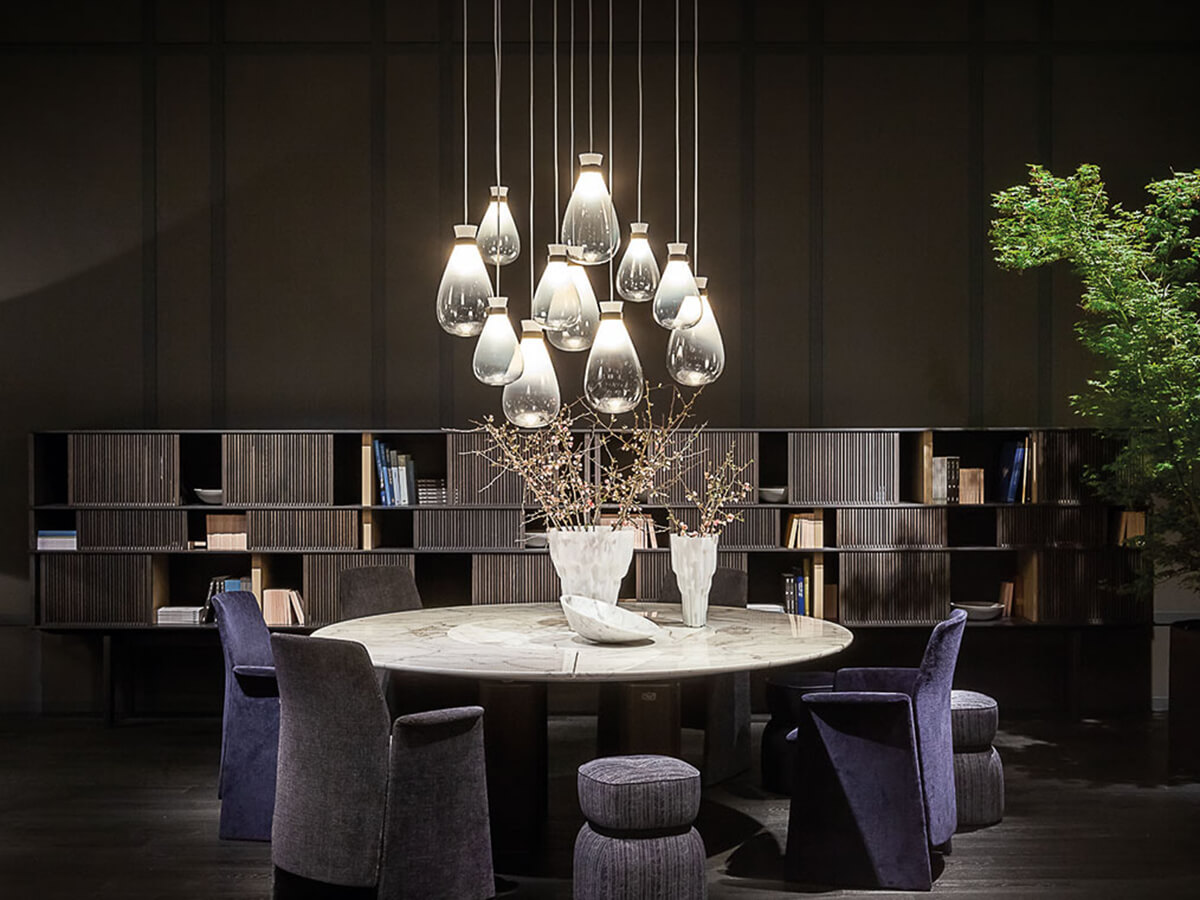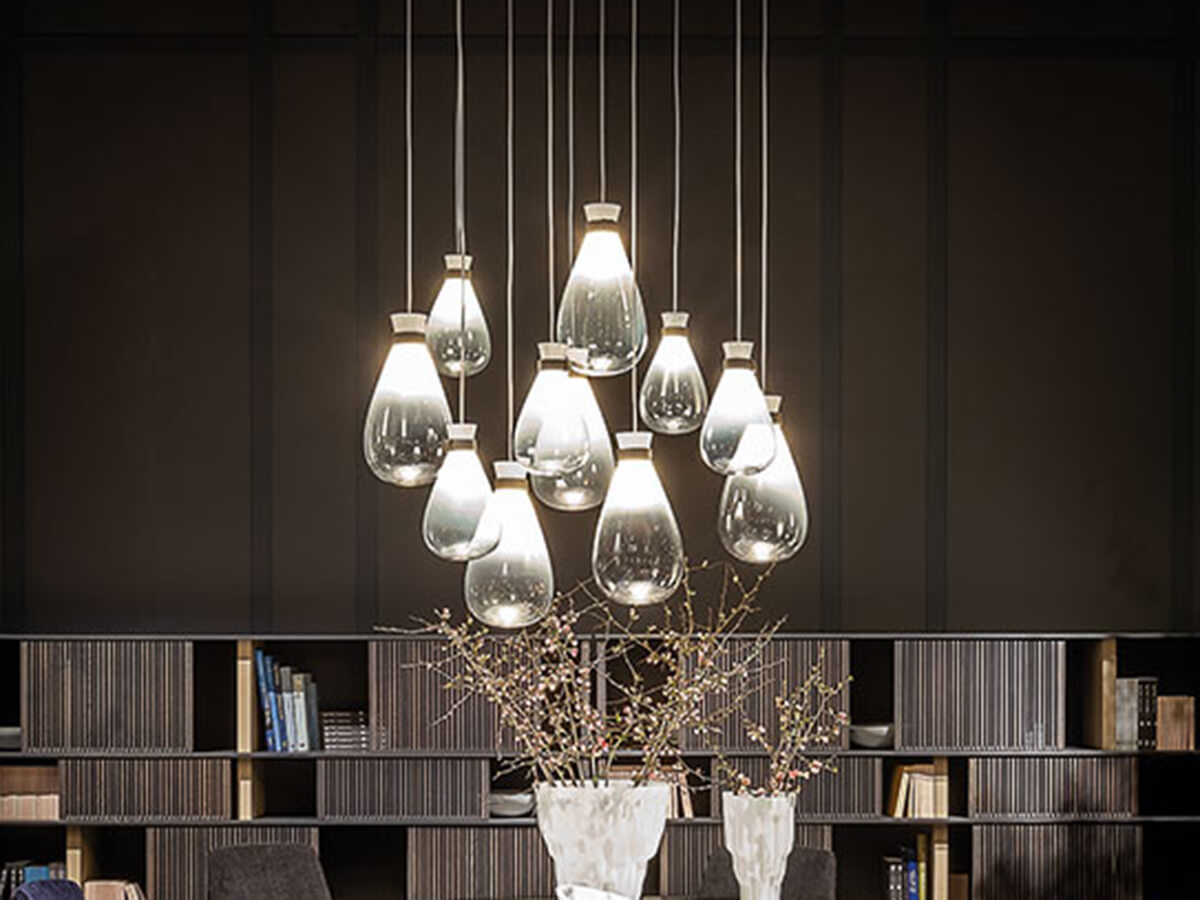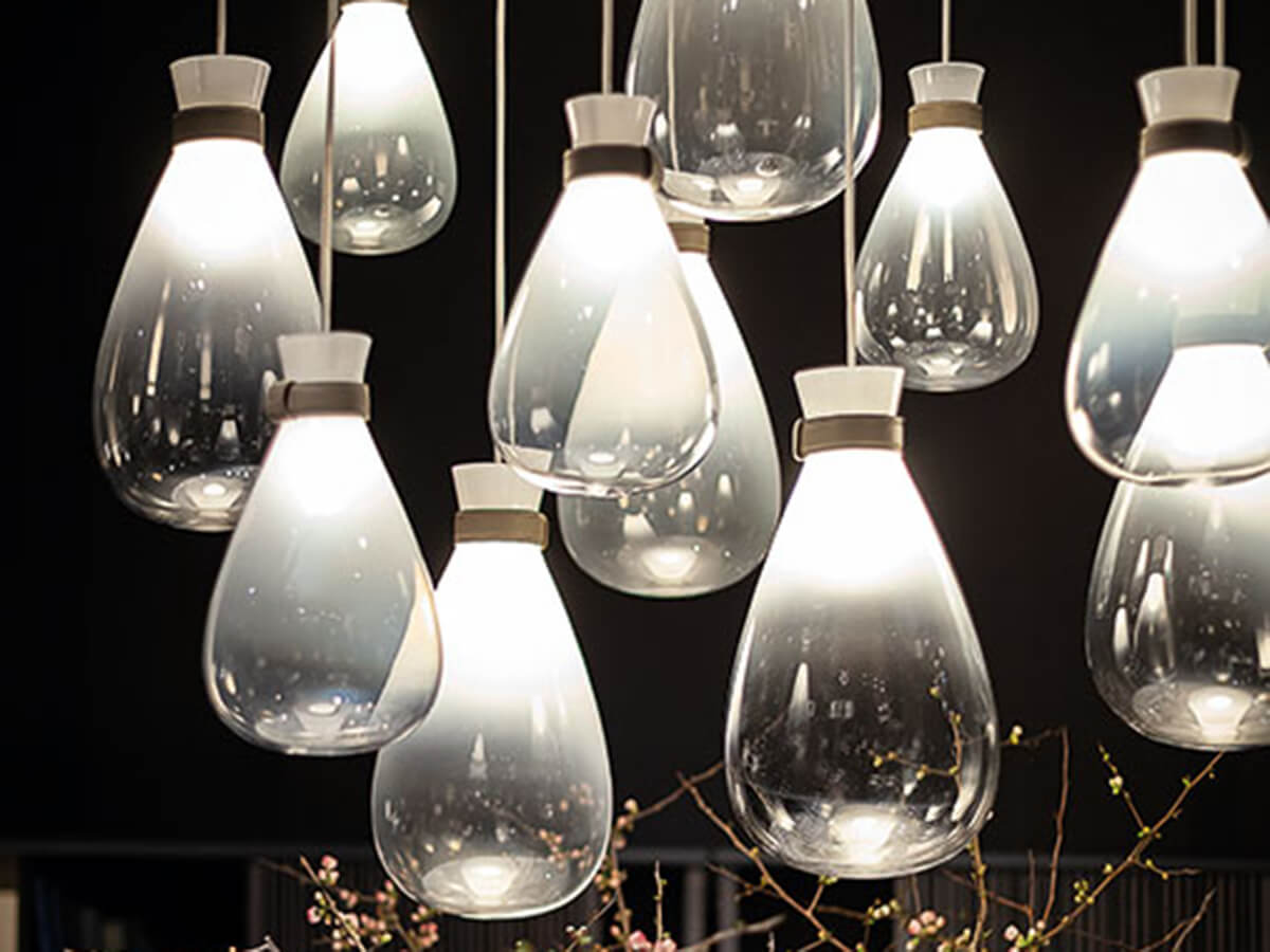 Soffi represents a tribute to the purity of light and blown glass. From the art of the skilled Venetian masters comes his minimal and extremely inspired design, which Gamfratesi has been able to translate, giving life to a luminous piece of furniture that is unique in its kind. Delicate and irregular globes seem to emerge from a thin leather bracelet, suspended in space by the force of gravity. Soffi lamps consist of two elements, both in blown glass: the outer globe has a shaded and sloping color while the inside of the lighting body is in opaque blown glass with pearl finishes. By switching on the lamp, the light is thus spread evenly, projecting a uniform and particularly pleasant glow.