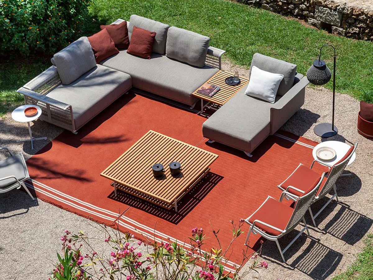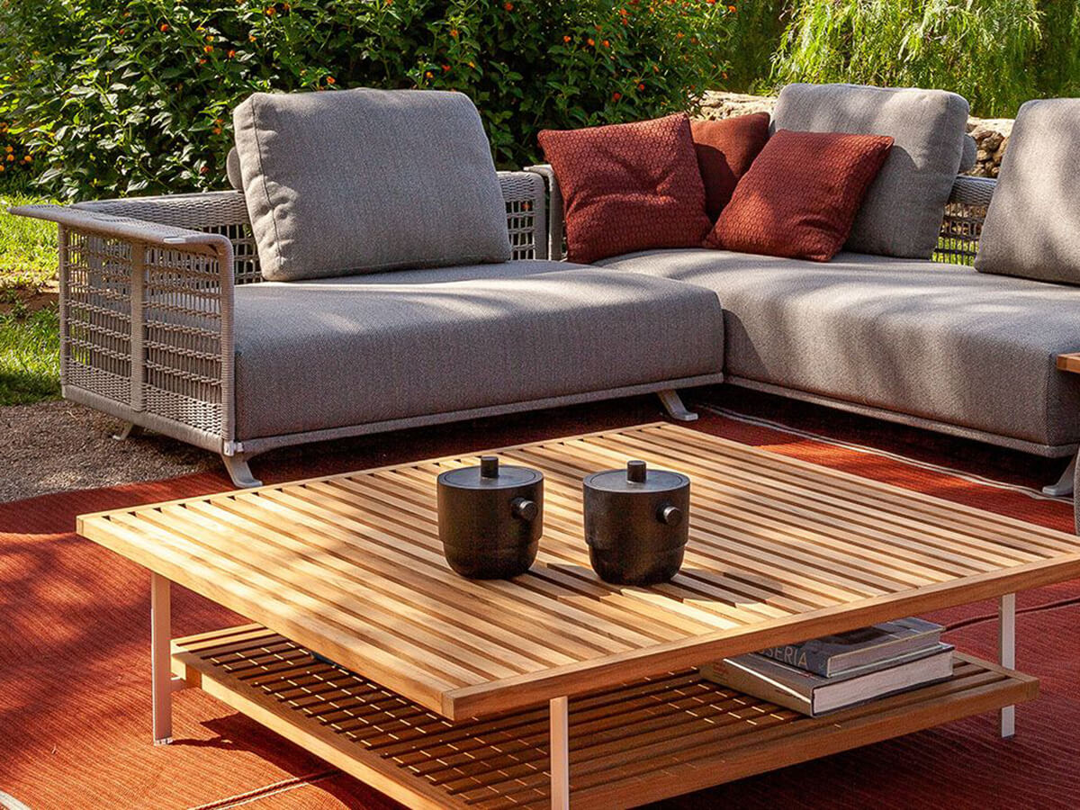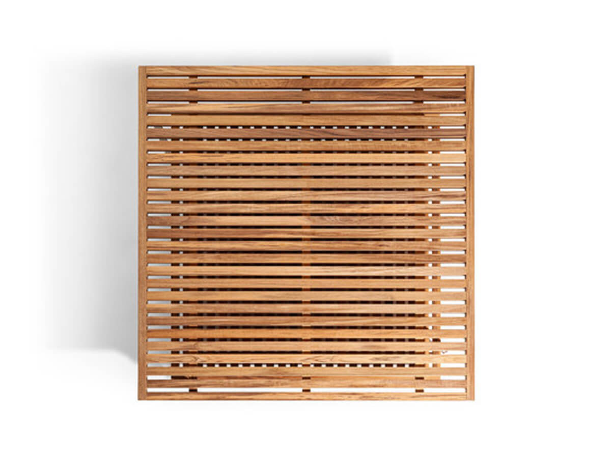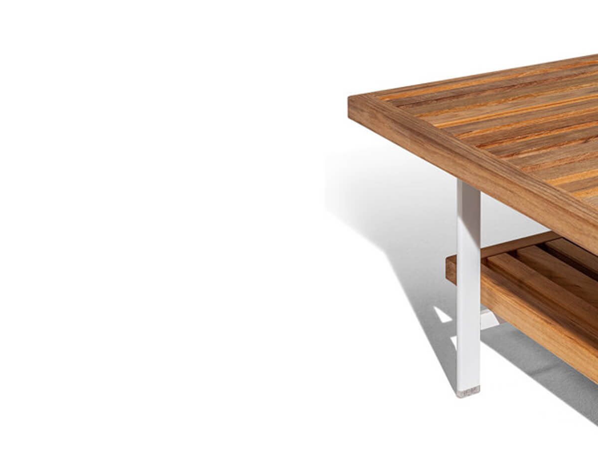 The Solaria outdoor coffee table designed by Ludovica + Roberto Palomba and produced by Poltrona Frau, presents a design with clean lines and a choice of materials that favors a dialogue with nature surrounding. This piece of furniture, available in the square or rectangular version, has a chalk-colored painted stainless steel structure, and a solid teak slatted top with natural finish. In the version with two tops mounted with the slats in alternating directions, it reminds to the wooden grates used mainly in the nautical field to drain the water. Extremely versatile element, it can be placed in the center of the space or inserted into the composition of the modular sofa Solaria.