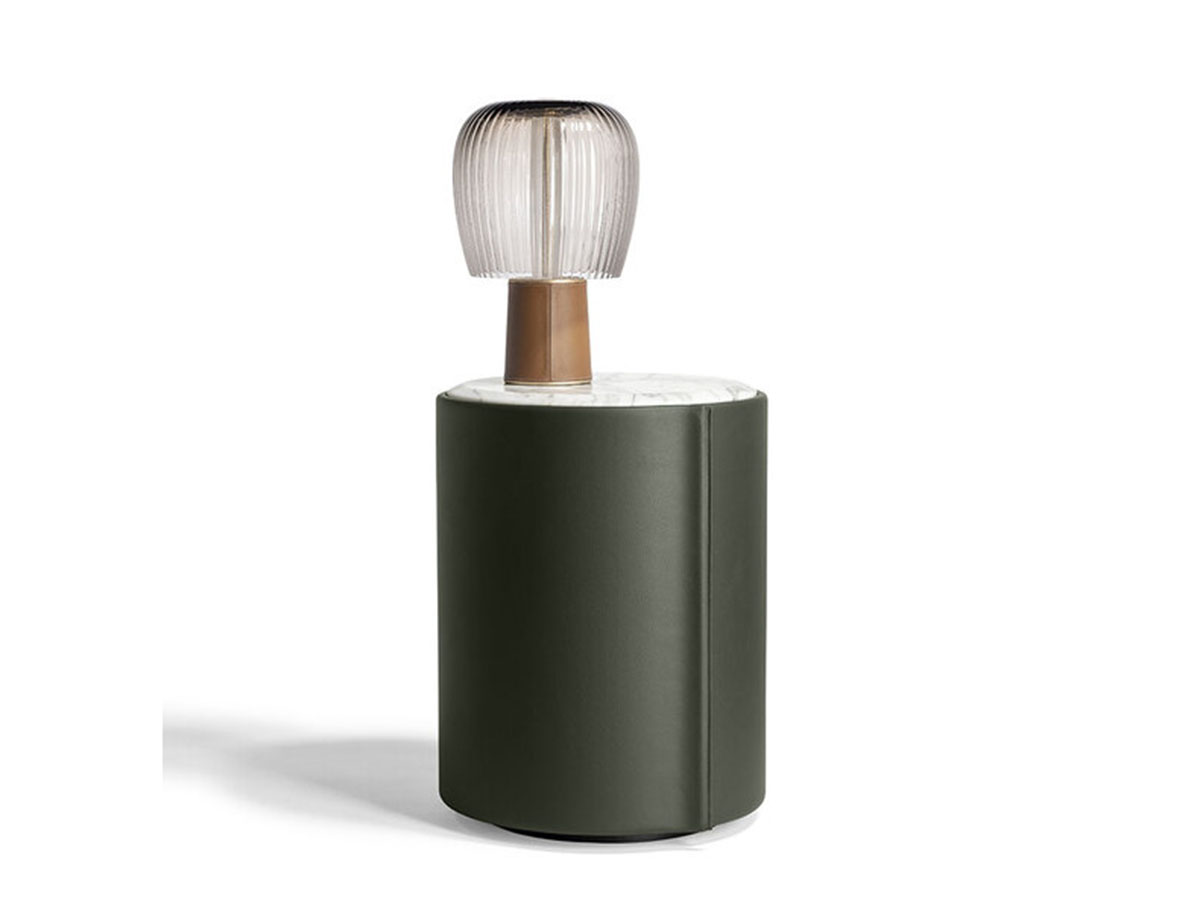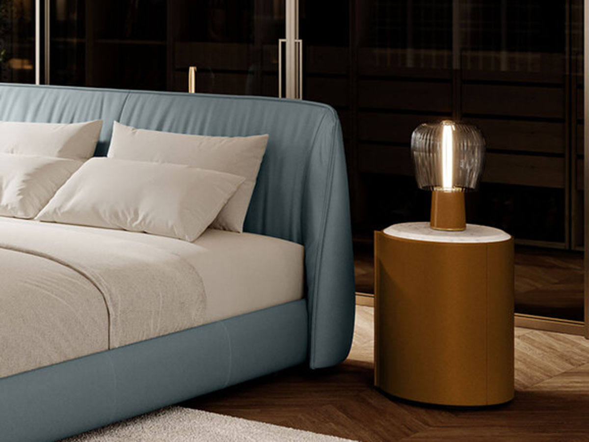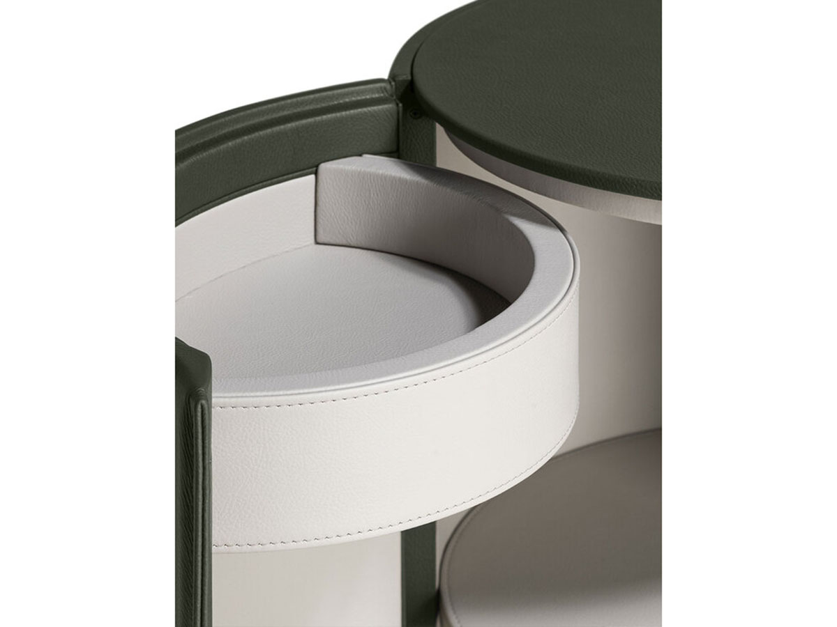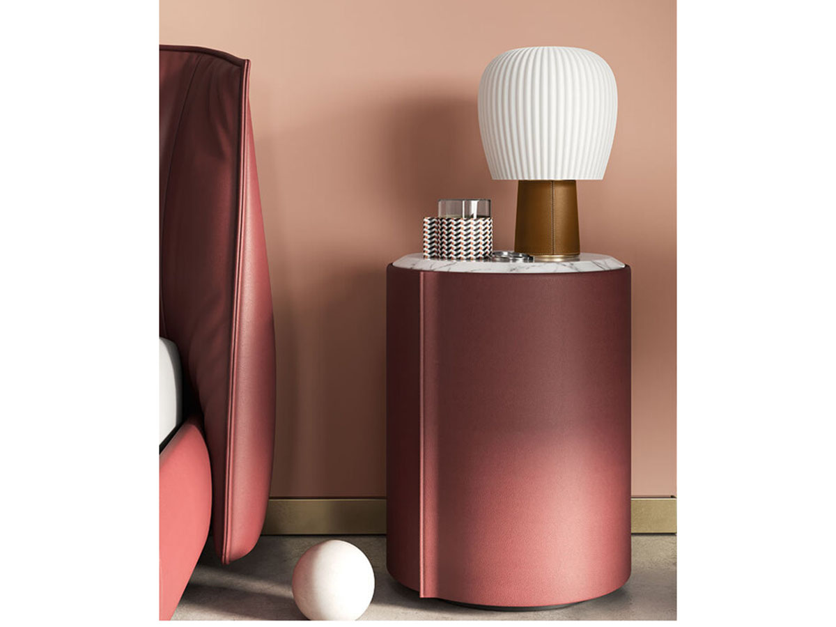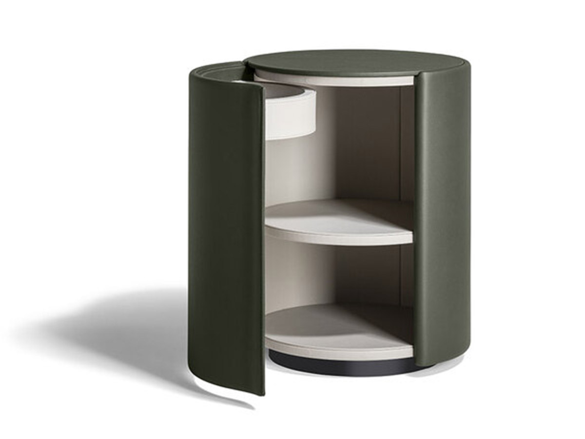 The Stock’n Roll bedside table has the indelible mark of Poltrona Frau style, which has always been an example of elegance and beauty in the field of high-end design. The supporting structure and the door are made of curved beech plywood and solid beech. The upholstery is strictly in leather Frau, the company’s famous masterpiece, with tone-on-tone stitching. The bedside table container is available with both right and left opening. The activation of the door is very simple, designed to store small everyday objects inside the sleeping area. The internal tray is made of birch plywood, with upholstery that can be matched to the external surface.