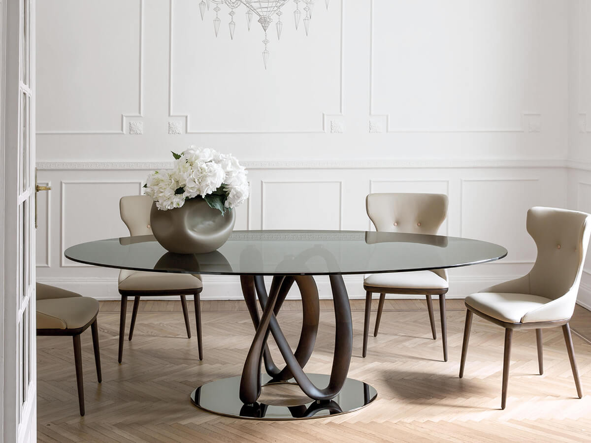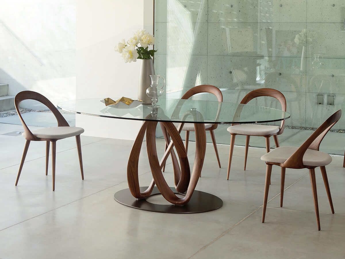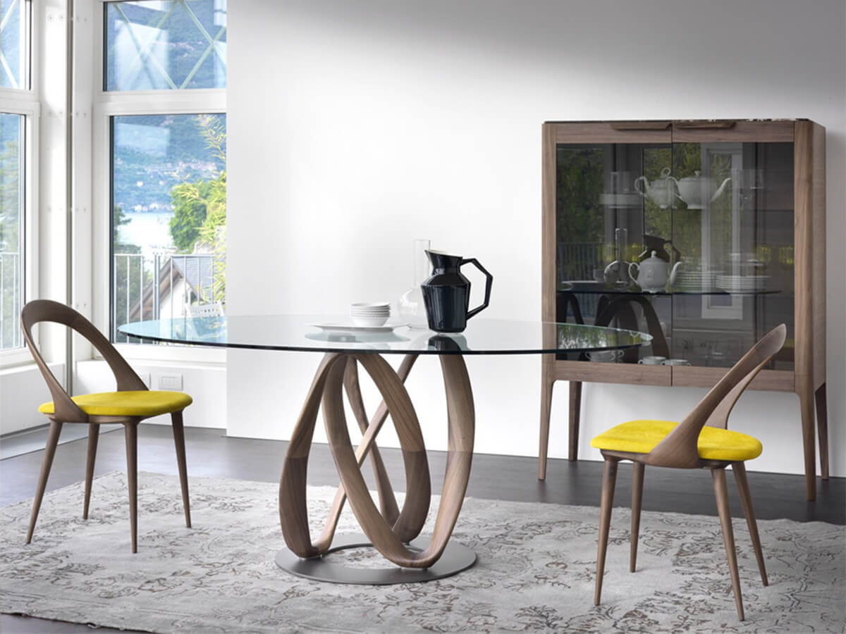 A table capable of expressing itself in different dimensions and perspectives, ideal for those who want to give their living room a touch of material and at the same time impalpable. Infinity is available in round, elliptical, square shape and more, to better adapt to different contexts. The beauty of the transparent top creates a perfect dichotomy with the legs in solid ash wood stained in different colors. The base supports the structure creating an additional mirror, in a succession of refractions and contrasts. The resultant is extremely pleasant and delicate, perfect for tastes of all times. Technical features: plate under the base available in chrome, black chrome, pewter gray or brushed brass finish