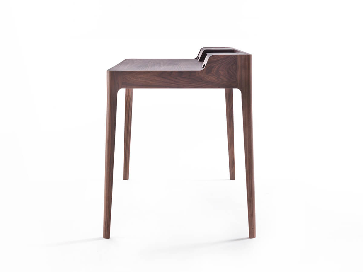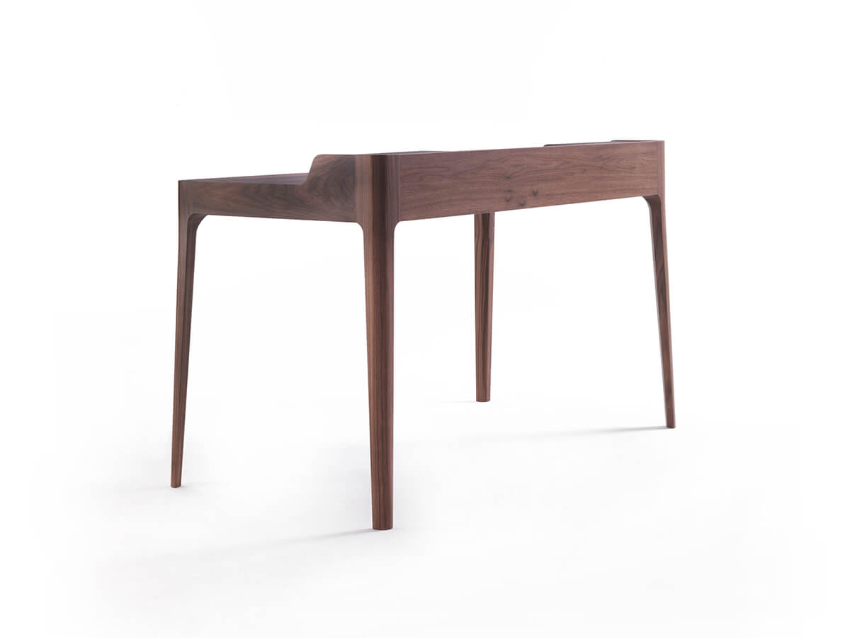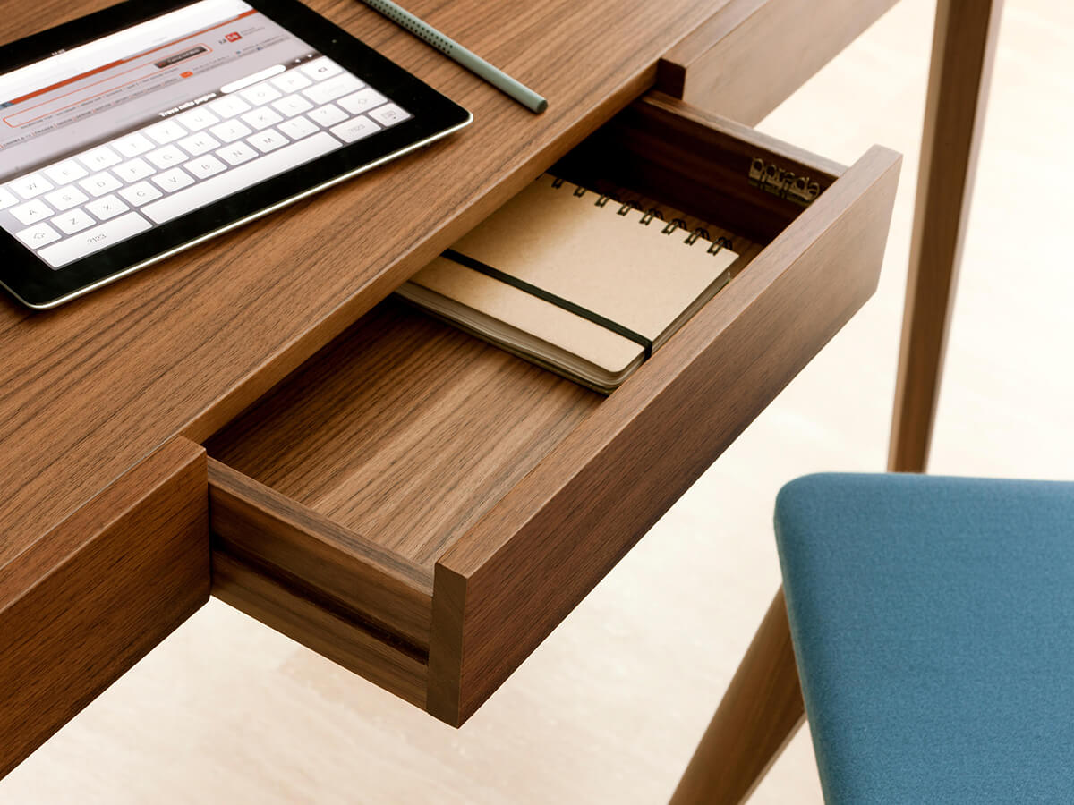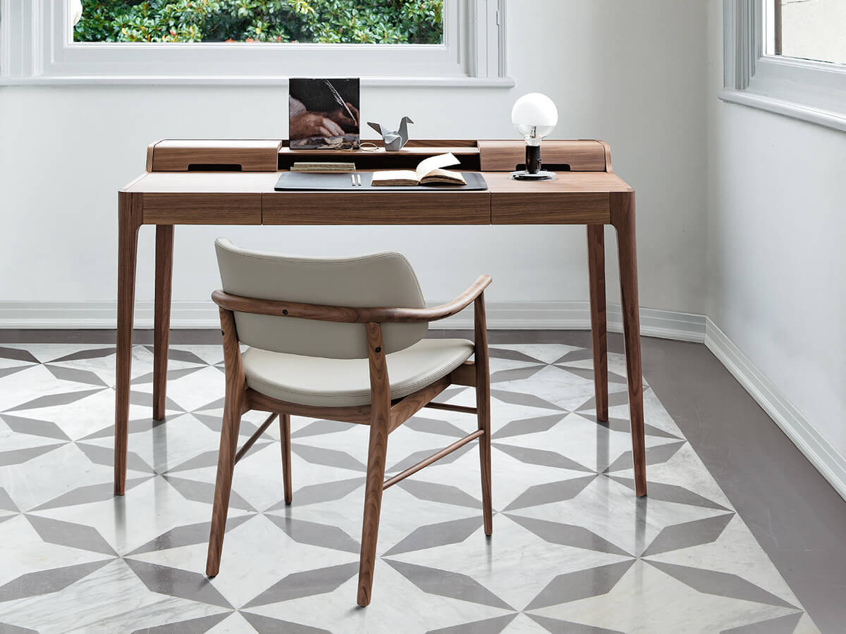A desk with a strong character, capable of fully fulfilling a double function of elegance and functionality. Saffo was born from the creative studio of C. Ballabio and Porada, united in giving life to an object that is well suited to the needs of the home office but not only. Ideal for studios and formal spaces, it is also suitable for more varied contexts such as living rooms and small spaces where you feel the need for a floor where you can carry out various office, study and more activities. This desk has a drawer in solid canaletta walnut with storage compartments and retractable cable guides. The desk pad is in leather, to improve the aesthetic and functional performance during use