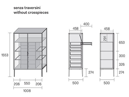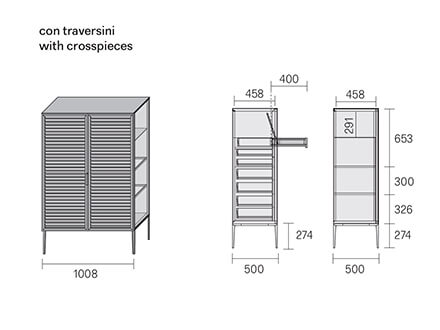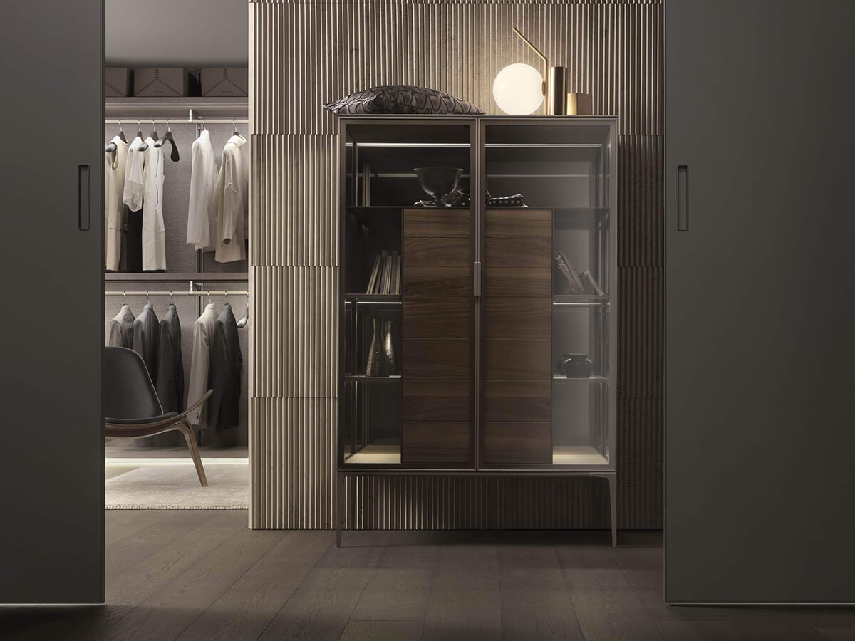 The Alambra system by Rimadesio is a very modern reinterpretation of the traditional concept of sideboard and display cabinet. The aluminium structure, very thin and unobtrusive, leaves all the attention to the finish of the doors: these can be in transparent glass, in a mood to enhance the contents of the sideboard, or in painted glass in the numerous colors of the Rimadesio Ecolorsystem range. In another version, the door is partially covered by a dense succession of parallel crosspieces that partially conceal the view of the interior in a highly refined "see-through effect" effect. Particular attention was paid by Rimadesio in the engineering of the opening and closing system, practical and silent, totally devoid of screws and gaskets.* Technical features: also available with LED lighting