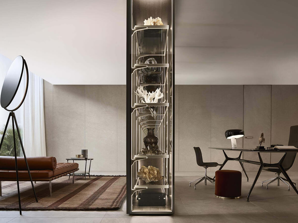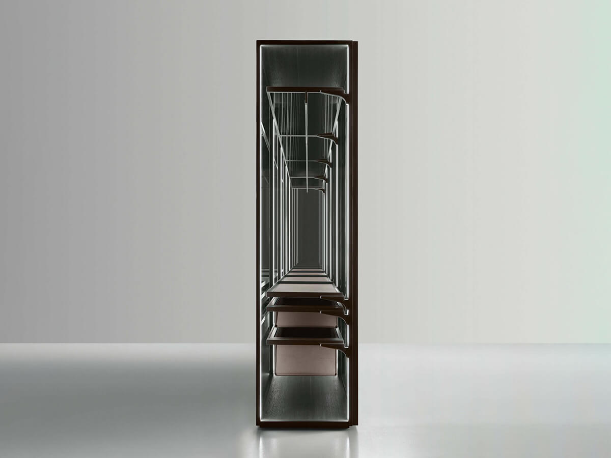 The Rimadesio Cover Freestanding system is a small technical jewel that lends itself to countless design interpretations. A self-supporting evolution of the Cover system, Cover Freestanding can be used both in the night area, with the function of a wardrobe, and in the living area, where it takes on the role of a luxurious bookcase-display. The latter is the version proposed by way of example in this sheet, in a composition in the center of the room in which the transparency of the glass further enhances the precious metal finishes of the internal shelves and the structure.