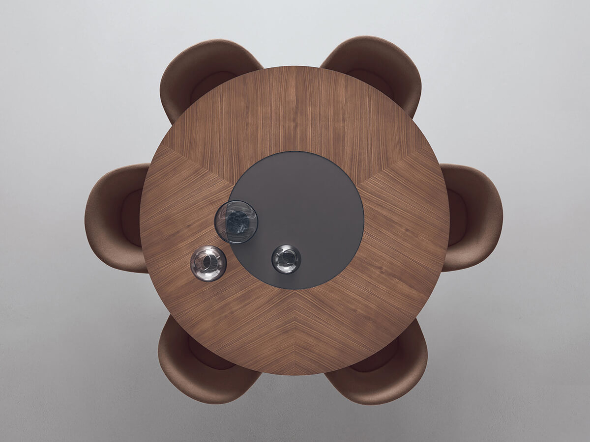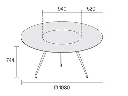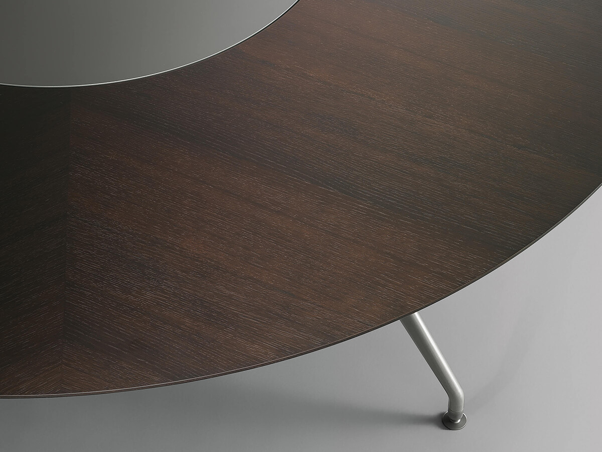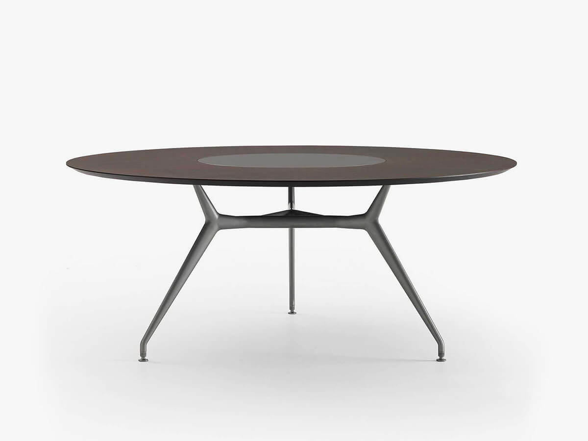 The Manta table by Rimadesio is characterized by the elegant and sinuous legs in painted die-cast aluminium linked by a solid central tie-rod which ensures extreme stability. It is available in a wide variety of sizes, round or "boat-shaped", which combined with the wide variety of finishes available for the top (from glass to wood, from marble to lacquering) allow it to take on an ever-changing identity adaptable to any context. In some versions it can also be customized with the inclusion of a discreet and refined central tray, coplanar with the top. Another salient feature of Manta is the modularity of the structure, which also allows the creation of long tables (up to well over 4 meters) supported by several spans of legs.* Technical features: the revolving tray is available in glossy or matt lacquered glass
