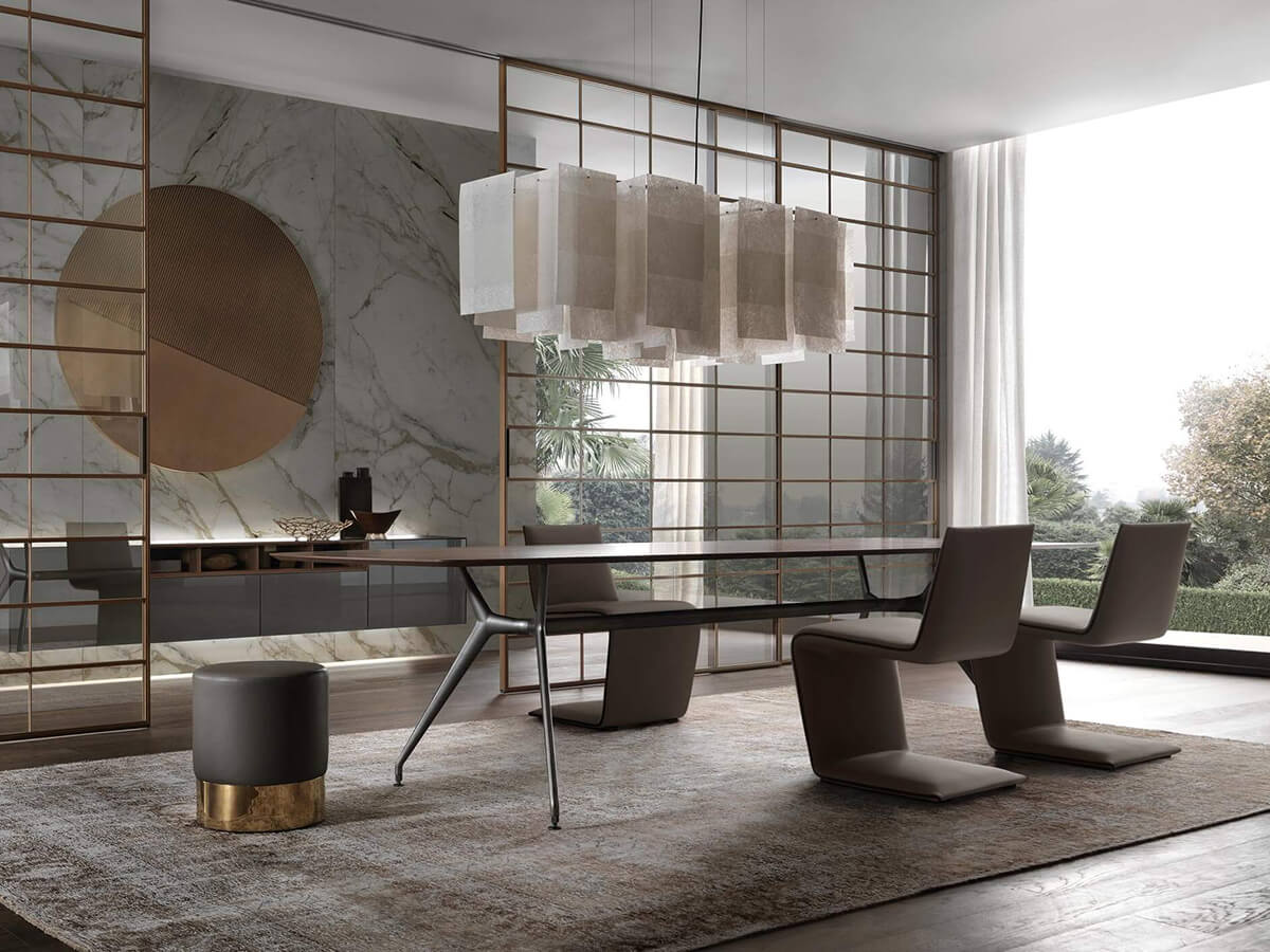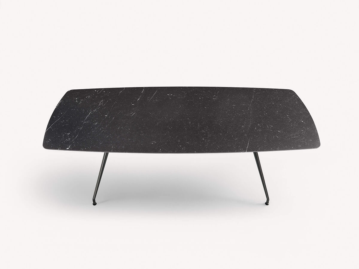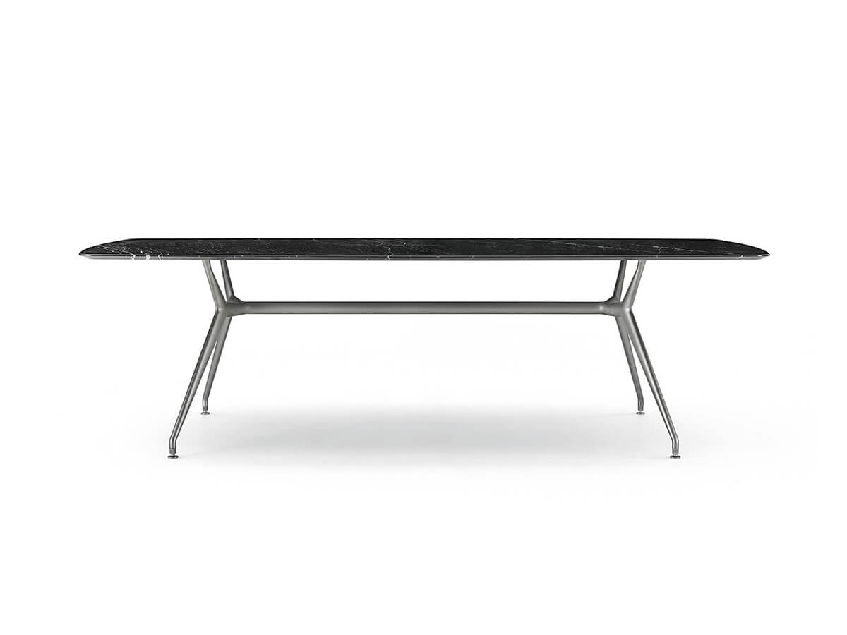 The Manta table by Rimadesio is characterized by the elegant and sinuous legs in painted die-cast aluminium linked by a solid central tie-rod which ensures extreme stability. It is available in a wide variety of sizes, round or "boat-shaped", which combined with the wide variety of finishes available for the top (from glass to wood, from marble to lacquering) allow it to take on an ever-changing identity adaptable to any context. In some versions it can also be customized with the inclusion of a discreet and refined central tray, coplanar with the top. Another salient feature of Manta is the modularity of the structure, which also allows the creation of long tables (up to well over 4 meters) supported by several spans of legs.* Technical features: the revolving tray is available in glossy or matt lacquered glass