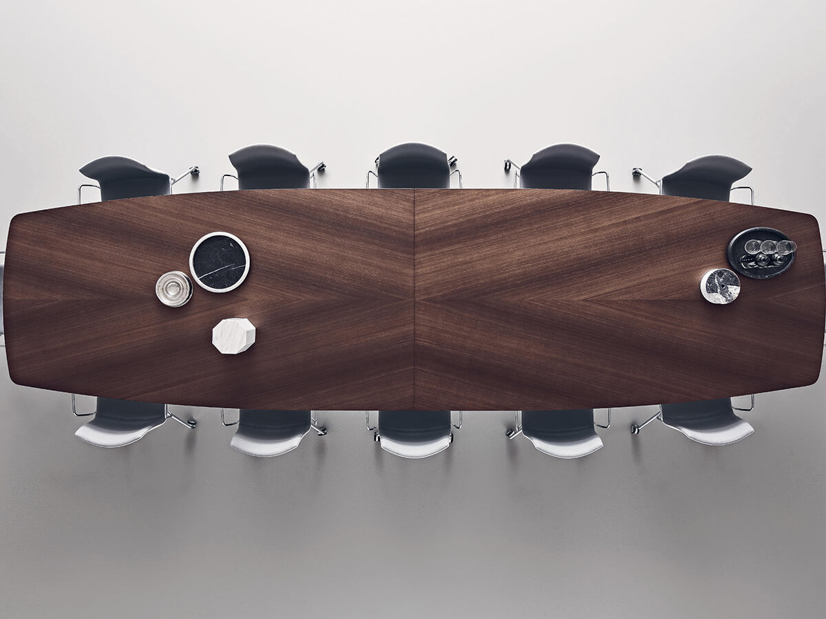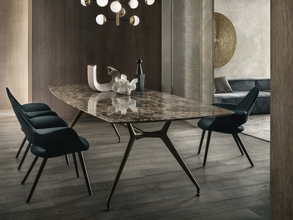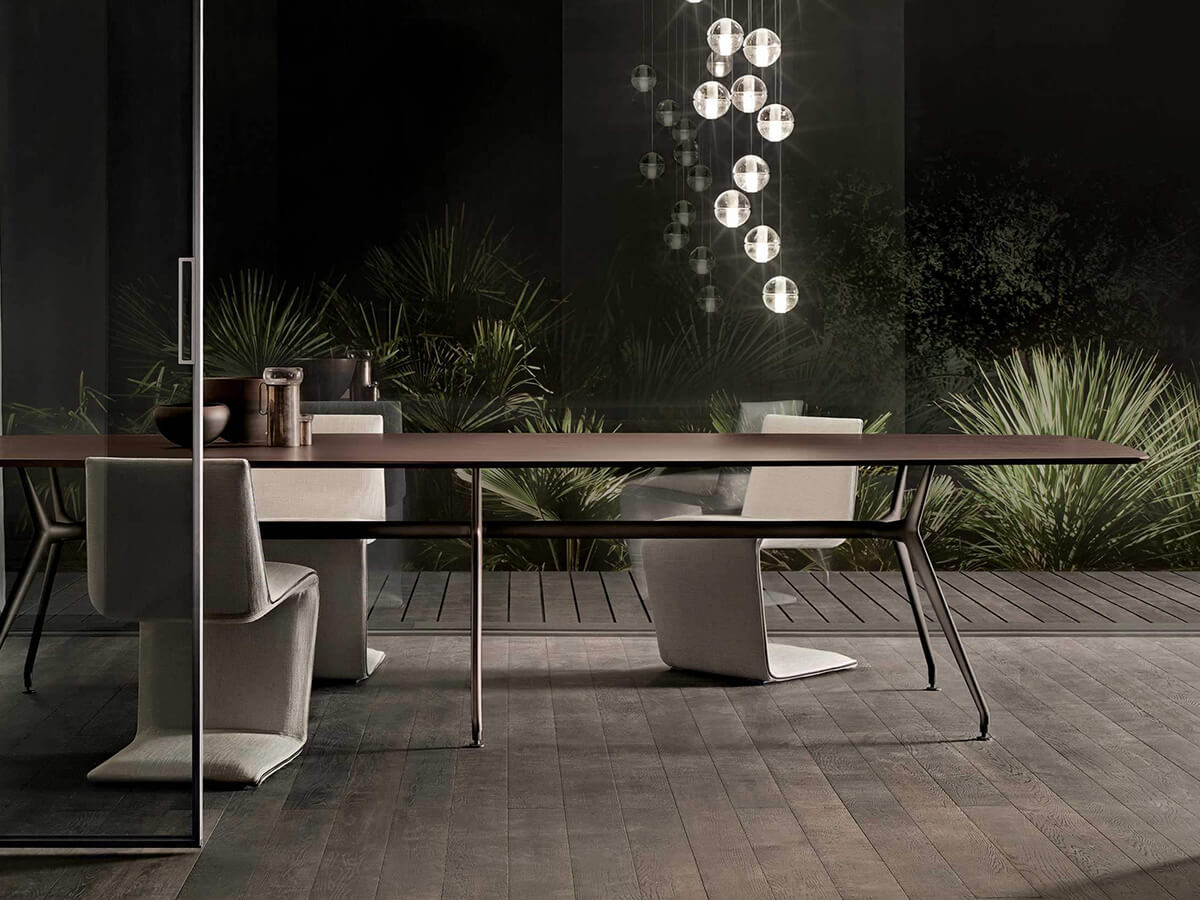 The Manta table by Rimadesio is characterized by the elegant and sinuous legs in painted die-cast aluminium linked by a solid central tie-rod which ensures extreme stability. It is available in a wide variety of sizes, round or "boat-shaped", which combined with the wide variety of finishes available for the top (from glass to wood, from marble to lacquering) allow it to take on an ever-changing identity adaptable to any context. In some versions it can also be customized with the inclusion of a discreet and refined central tray, coplanar with the top. Another salient feature of Manta is the modularity of the structure, which also allows the creation of long tables (up to well over 4 meters) supported by several spans of legs.* Technical features: the revolving tray is available in glossy or matt lacquered glass