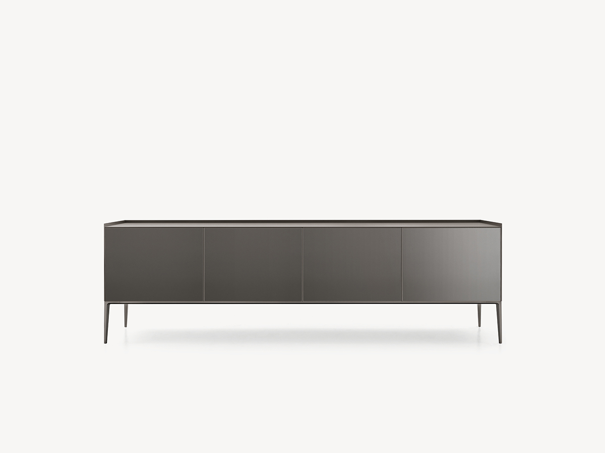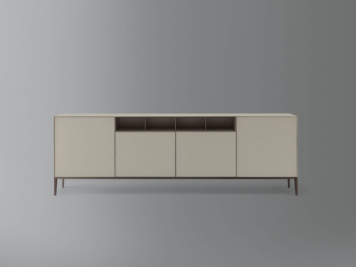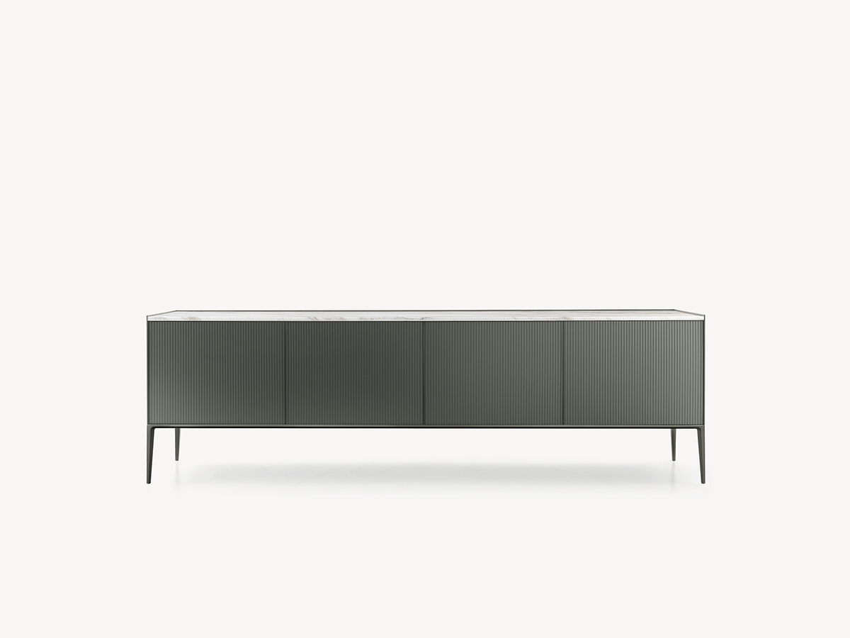 The Self Up sideboard is an articulation of the Self storage system, the cornerstone of the Rimadesio proposal for the living area and beyond. Supported by thin and elegant aluminium feet, Self Up is a storage unit characterized by the utmost formal lightness. Leaning on a real furnishing system, Self Up allows an almost infinite variety of compositions: it can also take the form of a sideboard or chest of drawers, it can provide for the insertion of open compartments or drawers and can provide for doors and structure a great variety of finishes, ensured by the 70 colors available for the finishes thanks to Rimadesio's Ecolorsystem program. The doors can also be made of glass or ribbed wood, with a pleasant and refined retro effect.