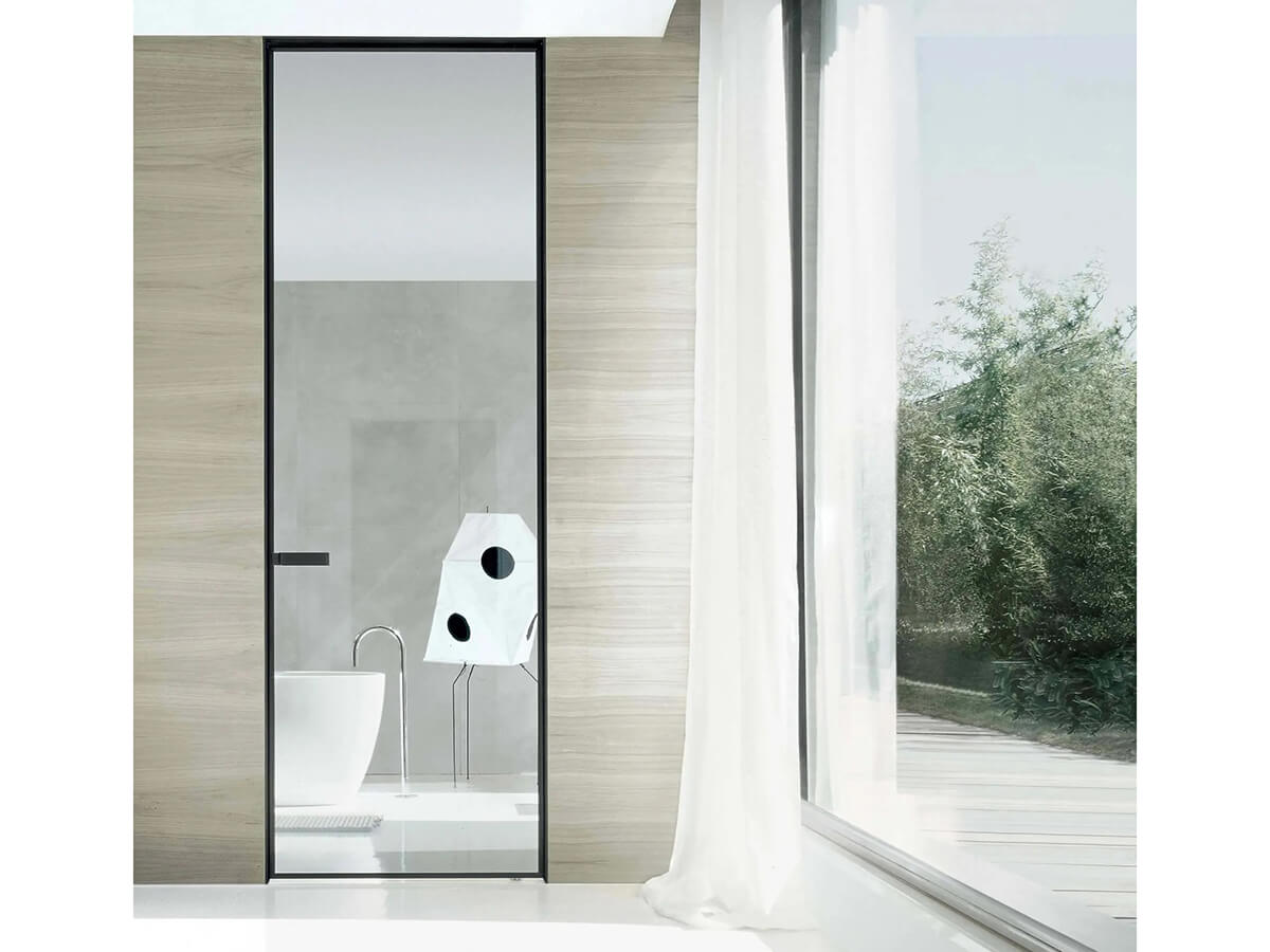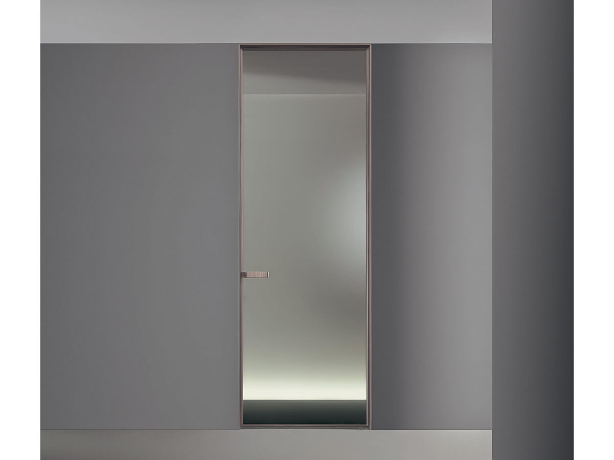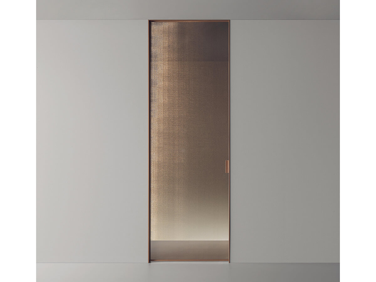 In the Vela door by Rimadesio, the jamb, recessed into the wall, is invisible to sight. The result is the effect of a glass surface - made up of the door panel - perfectly integrated into the wall, without interruption, with a scenographic result with great formal cleanliness. The Vela door is mounted centrally with respect to the jamb, thus making it easy to open on both sides. It is available in different glass finishes, from the traditionally transparent ones to the wide range of Ecolorsystem lacquered colors (Rimadesio exclusive), up to special treatments such as etched glass or glass with mesh. Vela is also available in a sliding variant.