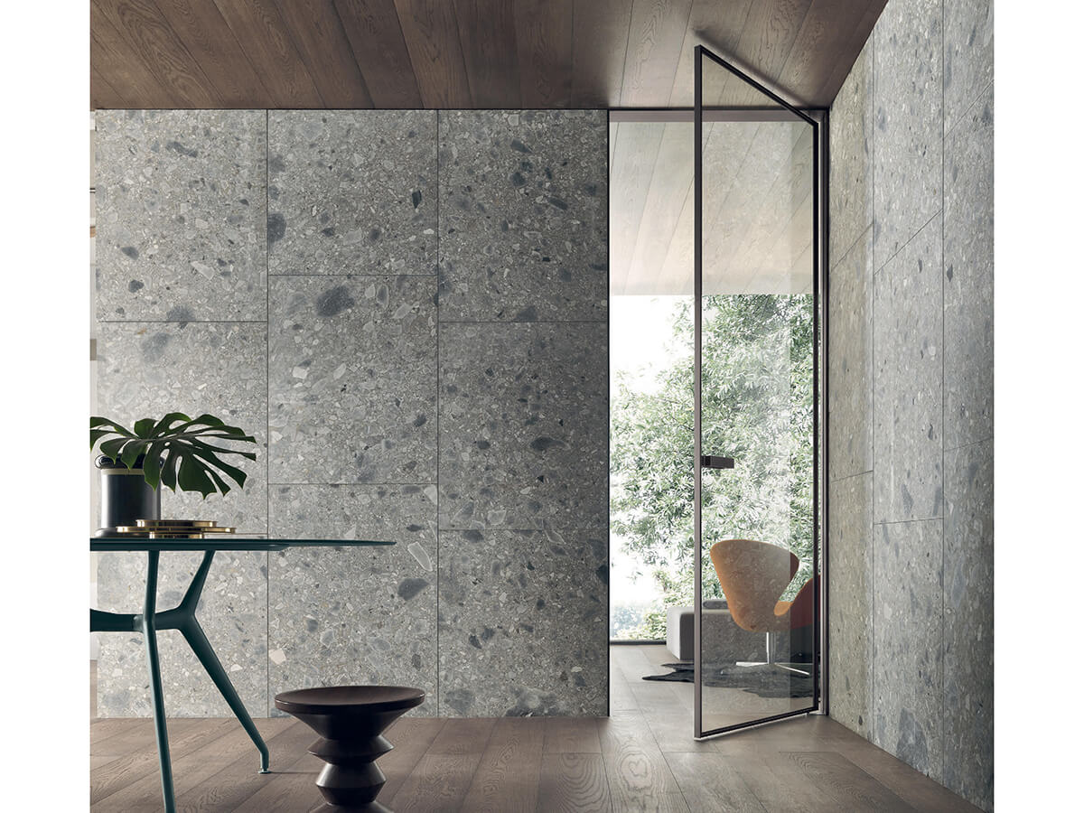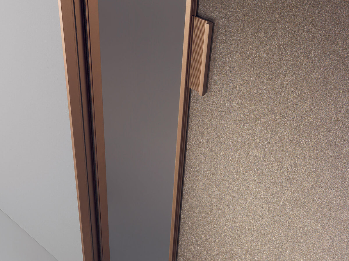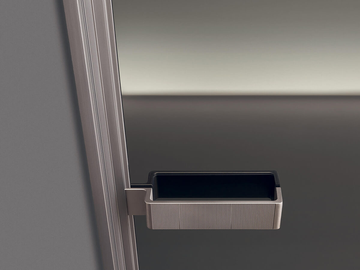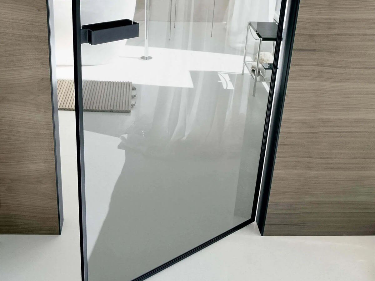In the Vela door by Rimadesio, the jamb, recessed into the wall, is invisible to sight. The result is the effect of a glass surface - made up of the door panel - perfectly integrated into the wall, without interruption, with a scenographic result with great formal cleanliness. The Vela door is mounted centrally with respect to the jamb, thus making it easy to open on both sides. It is available in different glass finishes, from the traditionally transparent ones to the wide range of Ecolorsystem lacquered colors (Rimadesio exclusive), up to special treatments such as etched glass or glass with mesh. Vela is also available in a sliding variant.
