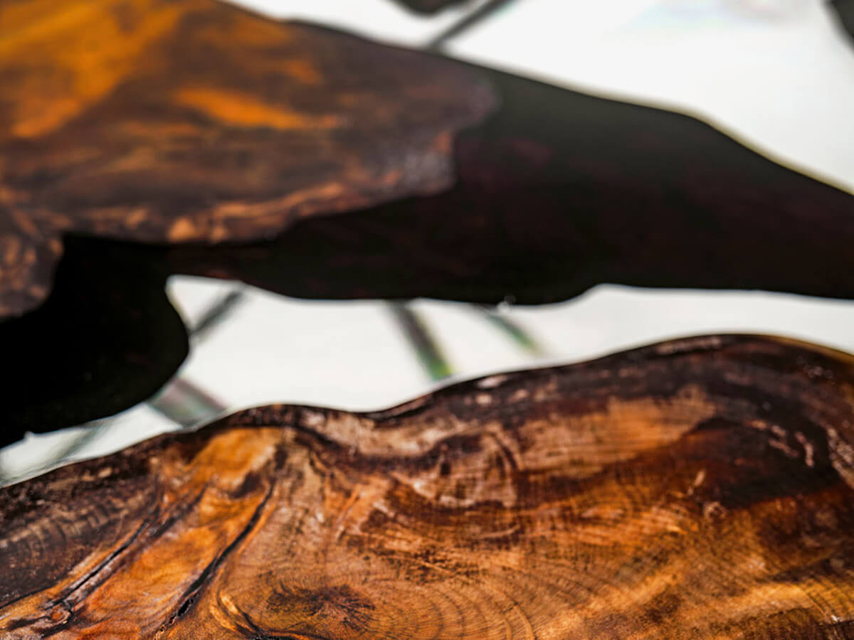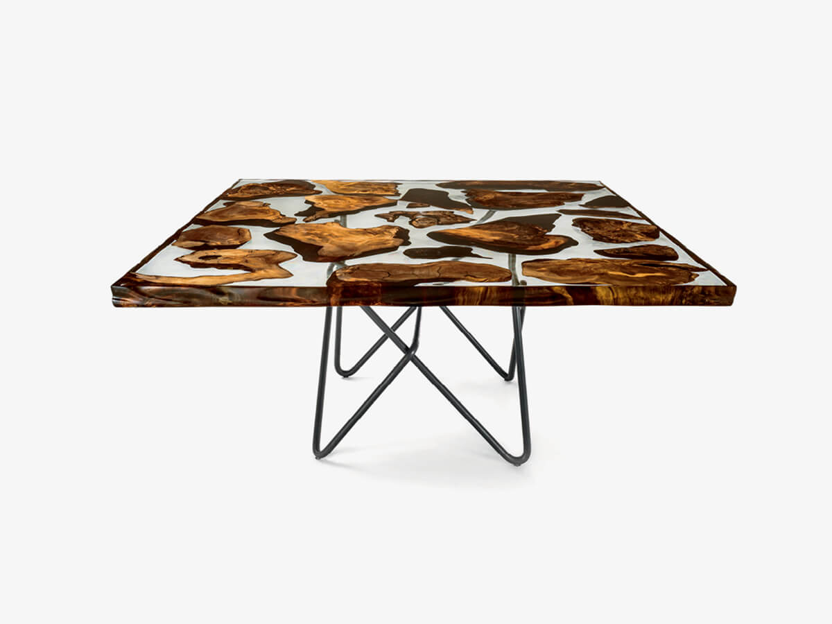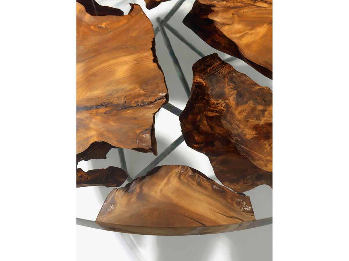 The Kauri collection combines history and design into one of great effect, so peculiar that it is always inimitable. From a wood that has remained underground for millennia, the Kauri top always conforms to a unique piece, to which the processing will give further value and aesthetic relevance. The customer is asked to choose the favorite slab, since each one embodies inside a different and impossible to replicate story. The artisan power of Riva1920 consists in knowing how to give these elements a second and more prestigious life, enriching the tables with a solid support base that supports and at the same time “directs” the wood in its slow and constant development. Technical features: top in “Millennial Kauri”, a wood that has remained underground for thousands of years; the tops are also available with resin inserts. Millennial Reflections version: sculptural base made with steel sheets by the artist Helidon Xhixha