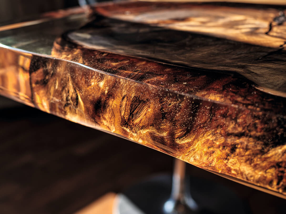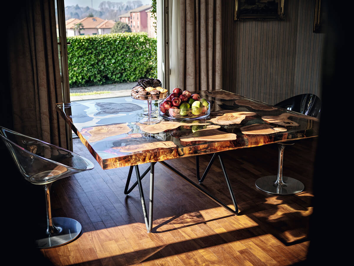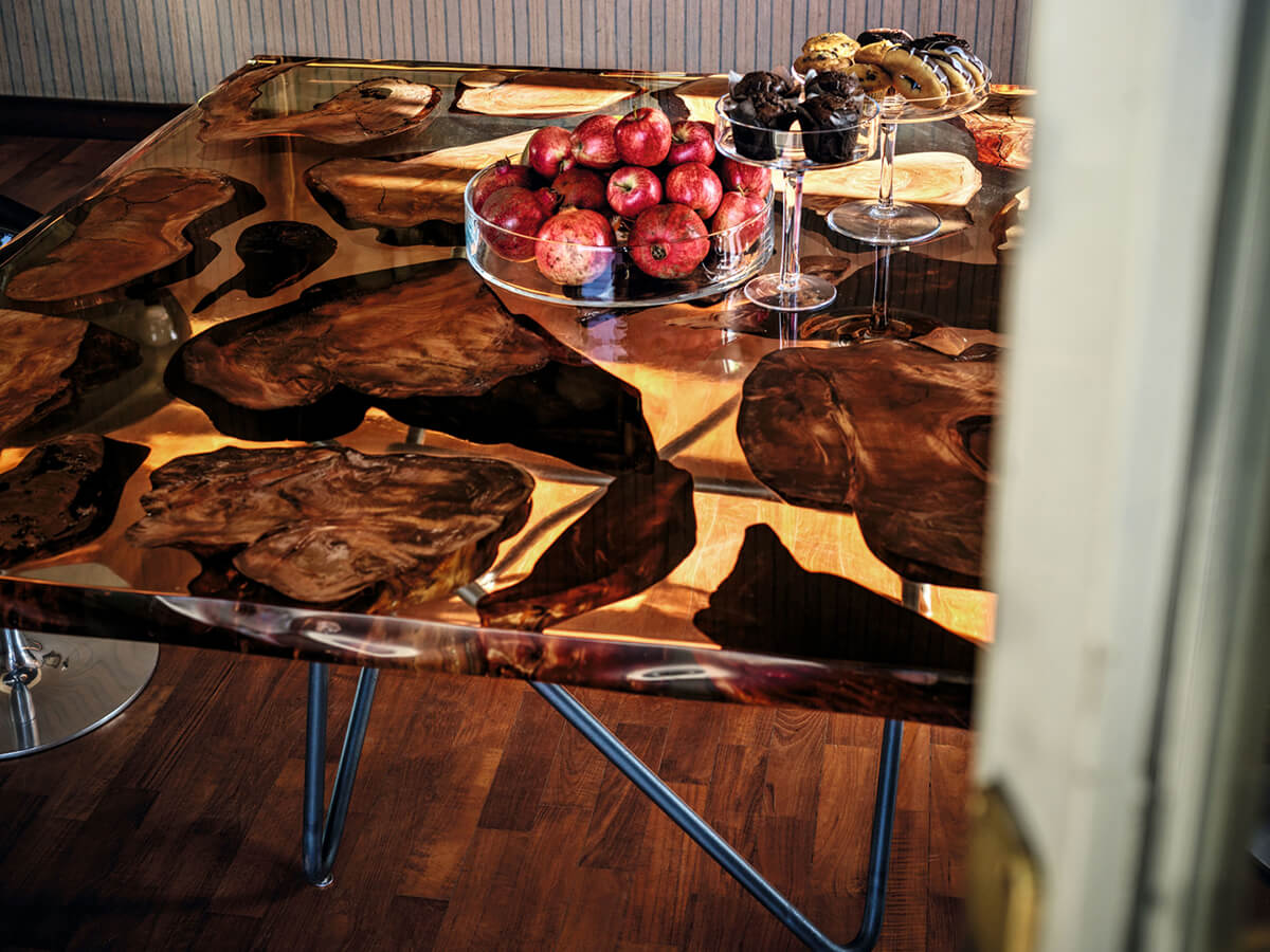 The Kauri collection combines history and design into one of great effect, so peculiar that it is always inimitable. From a wood that has remained underground for millennia, the Kauri top always conforms to a unique piece, to which the processing will give further value and aesthetic relevance. The customer is asked to choose the favorite slab, since each one embodies inside a different and impossible to replicate story. The artisan power of Riva1920 consists in knowing how to give these elements a second and more prestigious life, enriching the tables with a solid support base that supports and at the same time “directs” the wood in its slow and constant development. Technical features: top in “Millennial Kauri”, a wood that has remained underground for thousands of years; the tops are also available with resin inserts. Millennial Reflections version: sculptural base made with steel sheets by the artist Helidon Xhixha