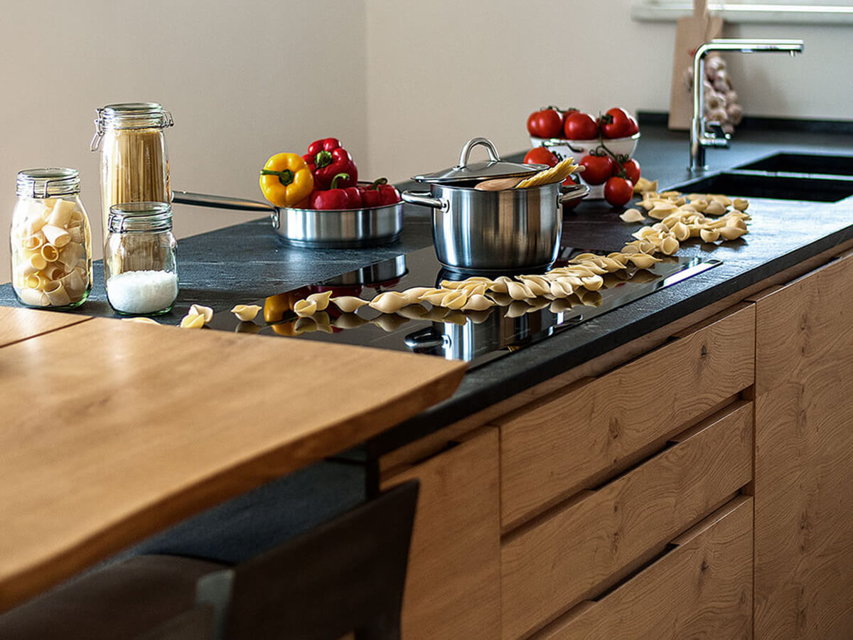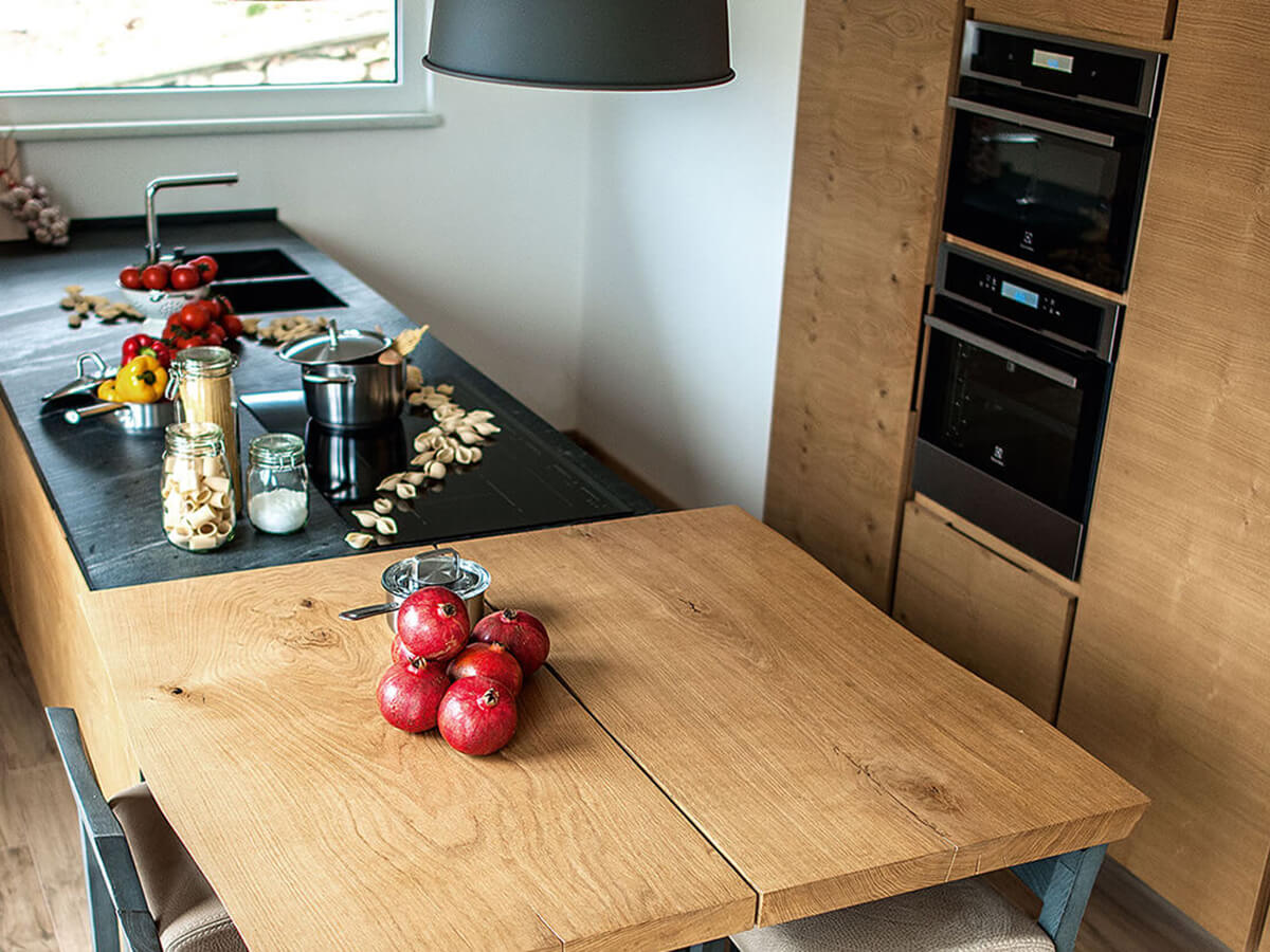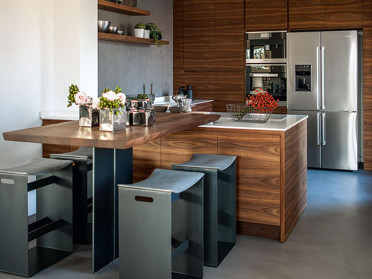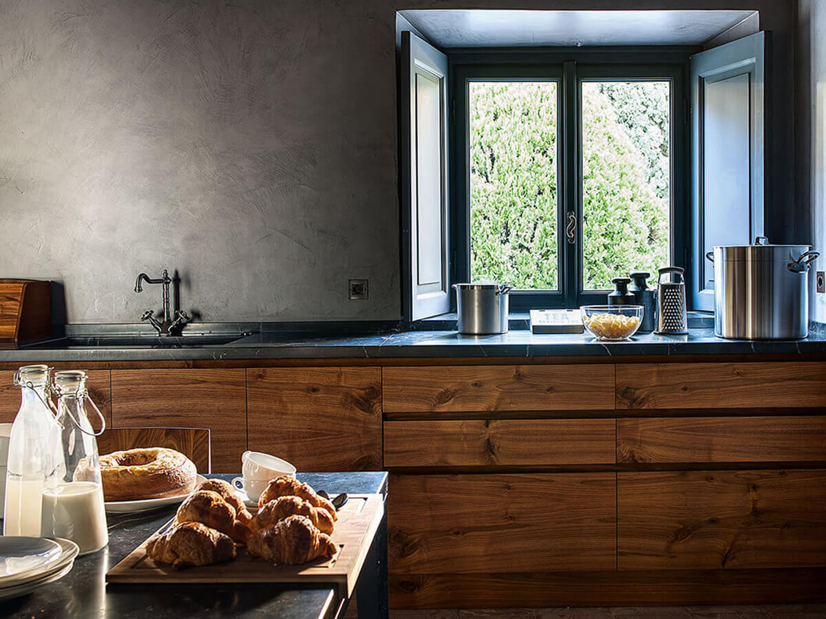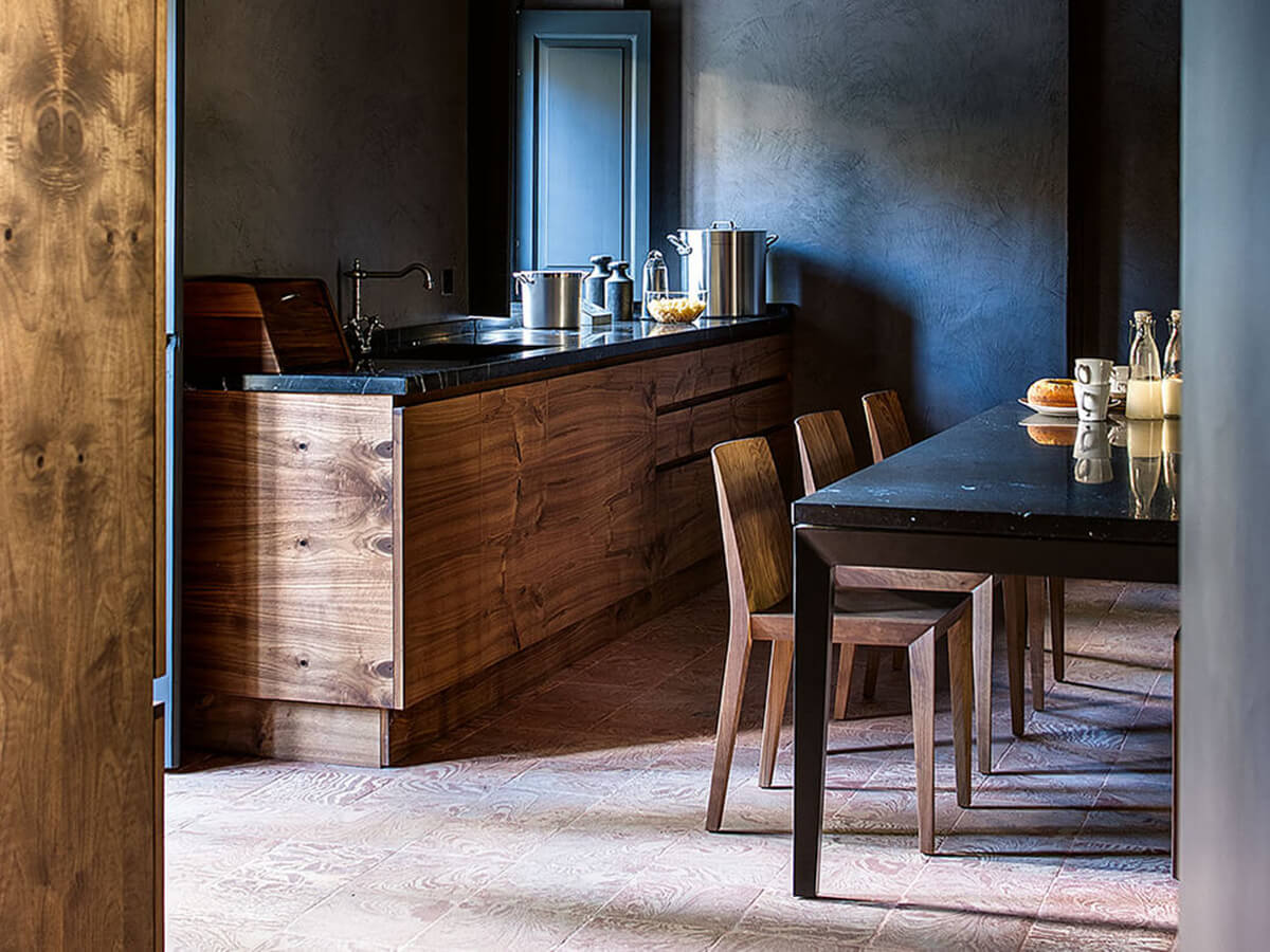 The wooden kitchen model "La Cucina" by Matteo Thun combines rustic and traditional suggestions with the class and elegance of a modern design kitchen. All guaranteed by the usual quality of Riva 1920, true masters in woodworking, capable of creating an artisanal kitchen available in multiple solutions and modularity to better adapt to the characteristics of the environment and the project.A peculiar feature of the "La Cucina" model is the elegant continuity of grain in the veneers of the doors of base units, wall units, columns and island, which make the most of the peculiarities of wood to create a sort of "natural decoration" that is always unique and alive emphasized by the absence of handles along the entire surface of the kitchen.