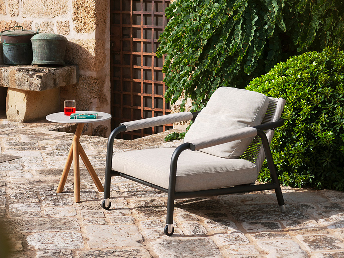 An outdoor armchair capable of adapting to different contexts, transmitting the characteristic style of the Roda company, number one in the production of outdoor furniture. Astra is a reclining armchair, equipped with wheels where the structure is entrusted to solid aluminum tubing and cords with a cotton feel that generate fresh and comfortable compositions, perfect for all those who love spending pleasant moments in company or relaxing in the open air. The Astra collection also includes sofas and lounge seats to create larger and more structured compositions. Ideal for terraces, balconies, gardens and poolside.
