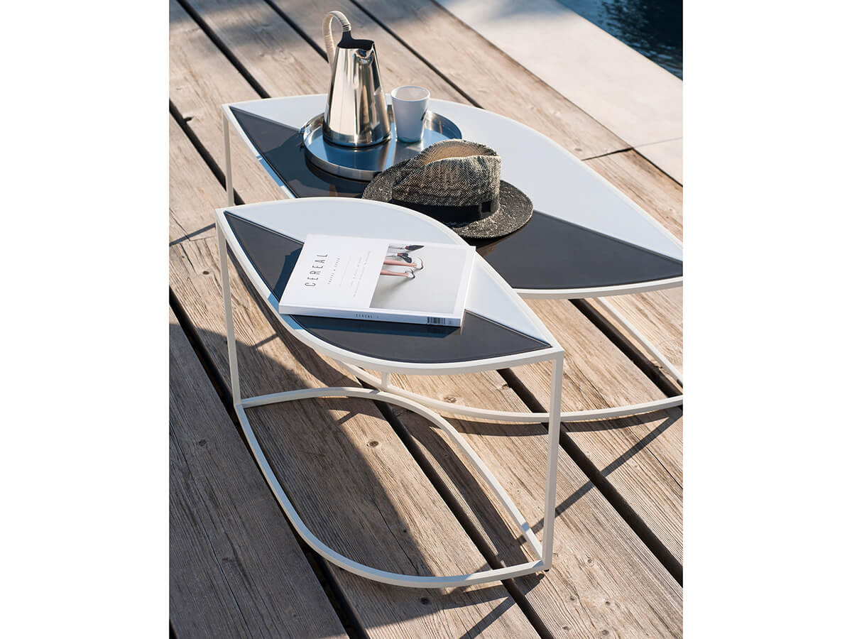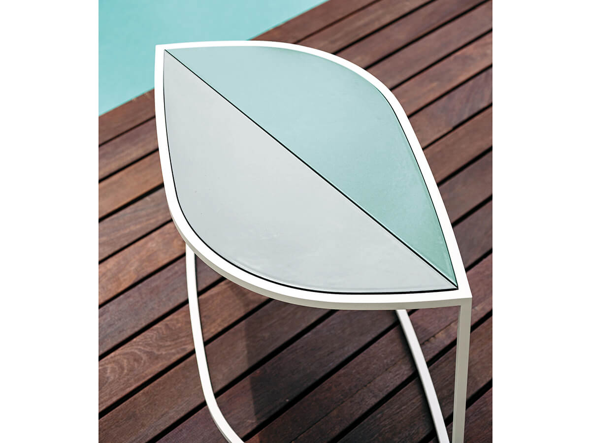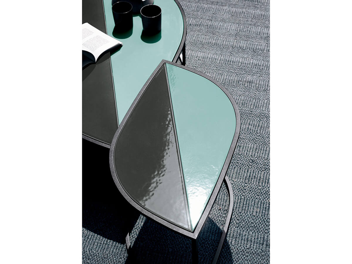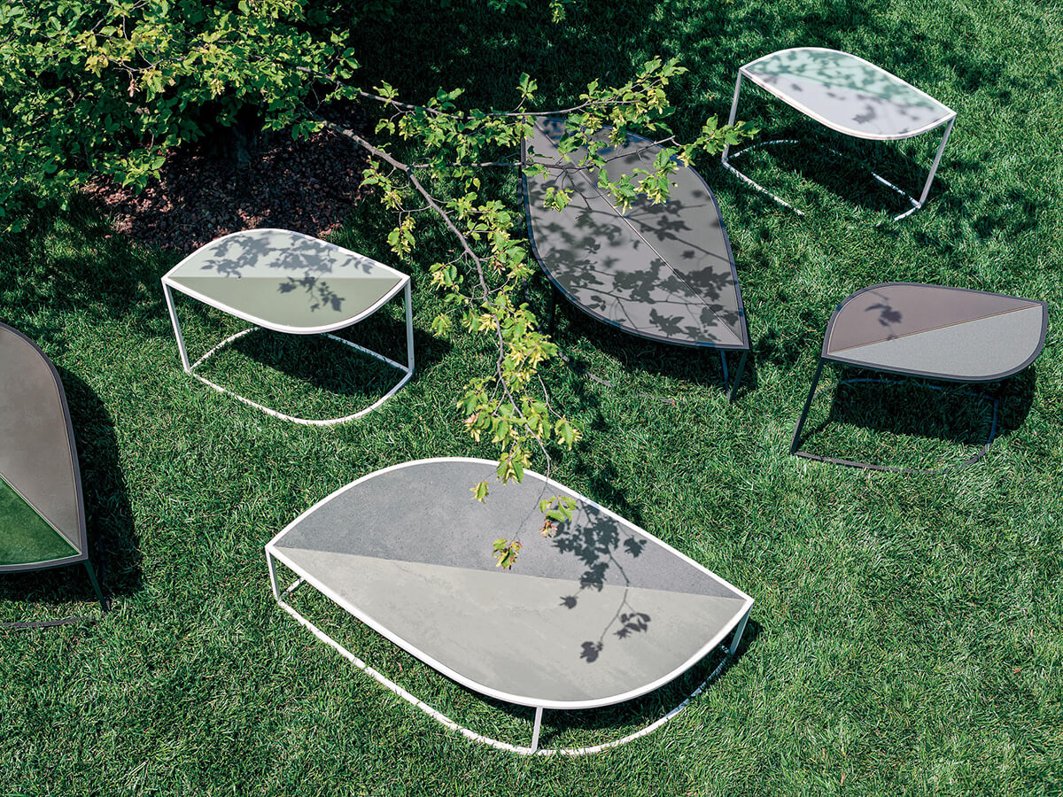 A coffee table with a particularly inspired design, capable of immediately attracting the eye for its simple yet sensitively elaborate shapes. Leaf, as its name suggests, is reminiscent of a leaf falling from trees and, settling, becomes a complement to the outdoors, ideal for gardens, terraces and more. The collection is designed to combine elements of different sizes and colors together in order to recreate a real "carpet" of leaves. The structure is in stainless steel with a shaped stoneware top. The different combinations available are perfect for creating breathtaking compositions.