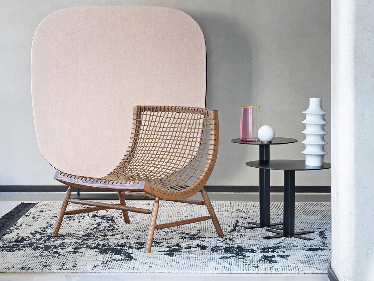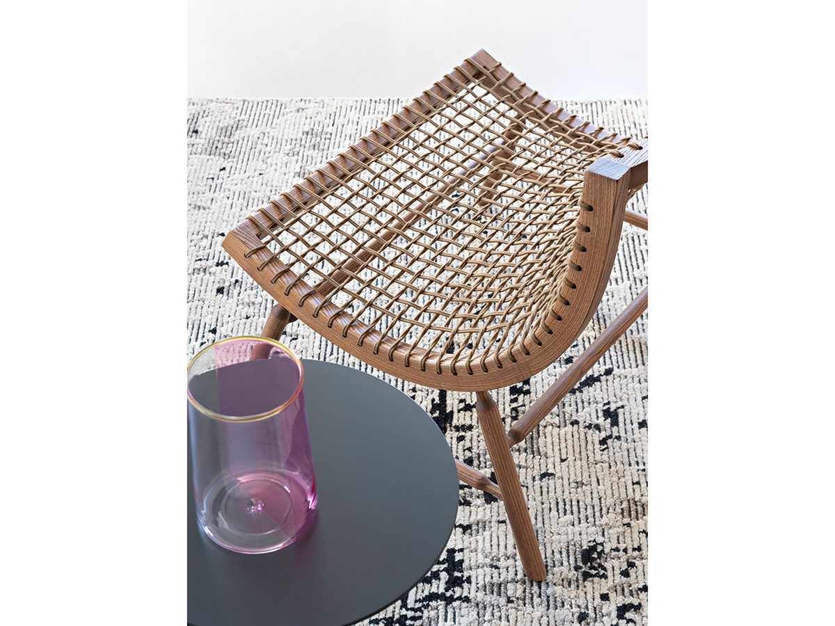Originally the sitar is a particular instrument very popular in the Middle East and in the Eastern tradition. It is a stringed instrument whose sweet sound enlivens ballads and various artistic compositions. In the same way, Sitar by Saba takes up this formal and aesthetic lightness to create a surreal object, one of a kind. The name "seh-tar" literally means three ropes, and it is no coincidence that it is made up of varnished ash and woven nautical rope which together create a strong and resistant weave, yet capable of accommodating the back effortlessly, creating a particularly soft and suitable for various more or less formal contexts. Even the structure of Sitar adapts to different situations without ever going out of tune or being badly calibrated.