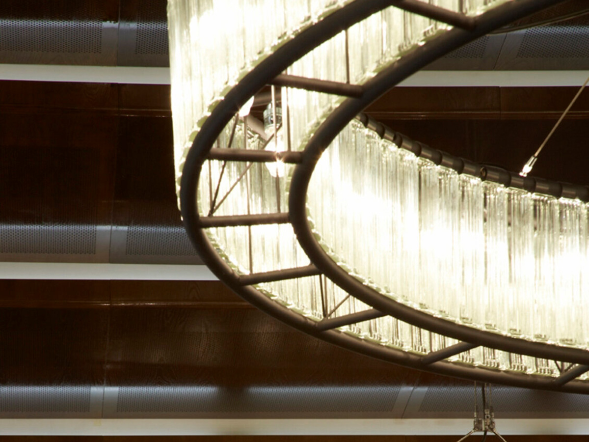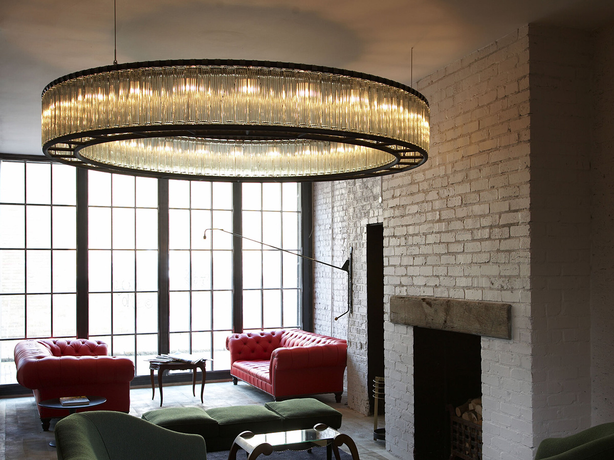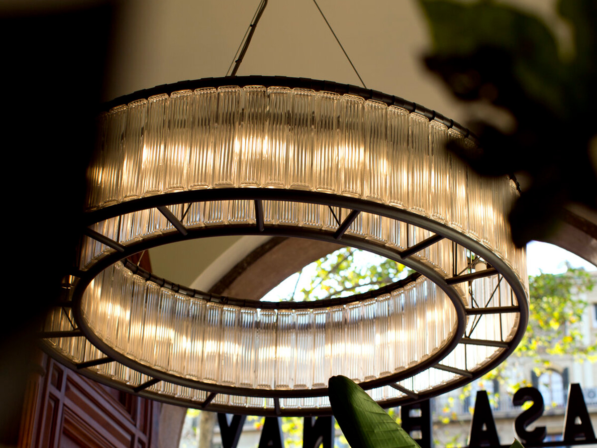 A monumental crown of circular light, the Estadio lamp by Santa & Cole always leaves the viewer speechless. It is perfect for public spaces such as hotel lobbies or prestigious luxury boutiques, but it can also be used for high-standing domestic environments in order to obtain a particularly impactful scenographic effect. Designed by Miguel Milá for the 1992 Barcelona Olympic Games, it is proposed as a modern version of the enormous metal chandeliers full of candles that illuminated the rooms of medieval castles: the designer has in fact decided to keep the tubular frame exposed steel, framing a thick ribbed glass ring that houses the light sources.