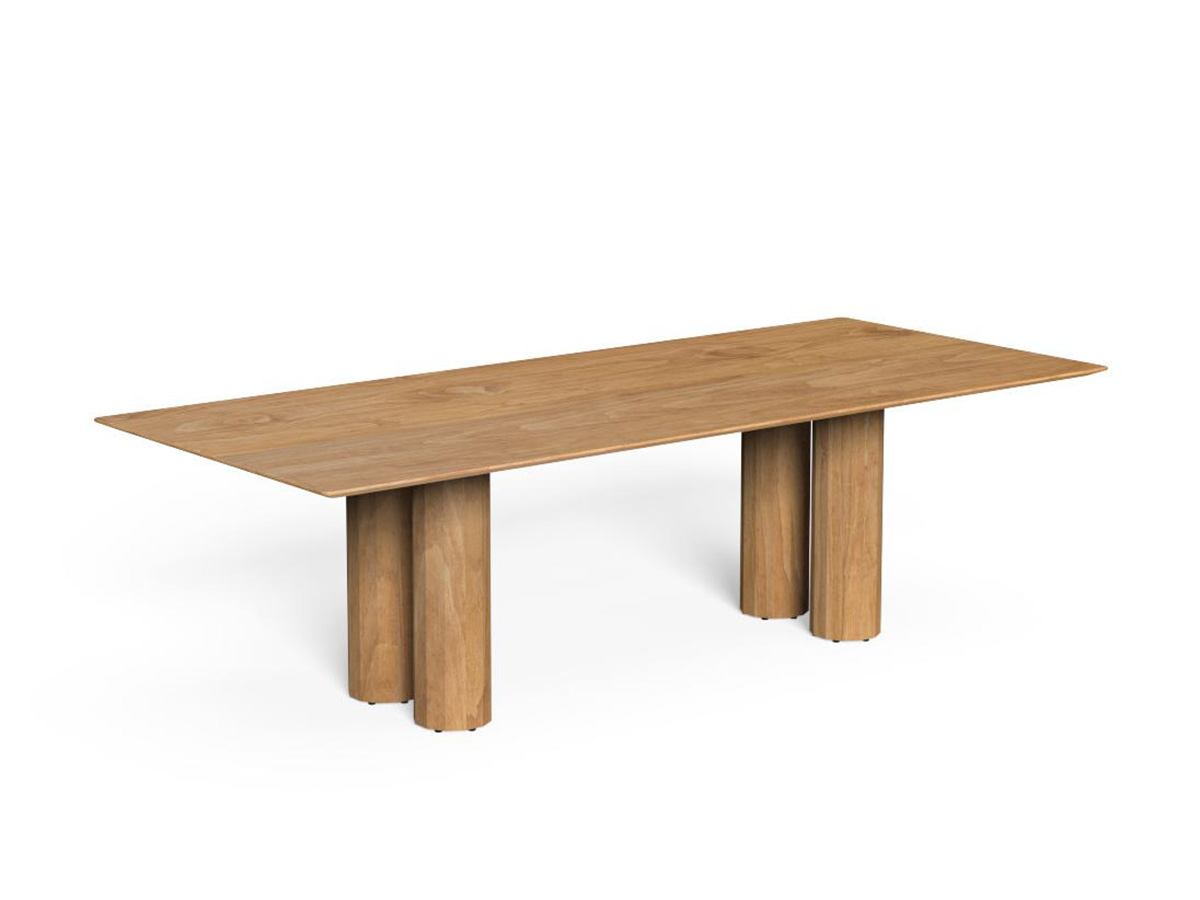 Salinas is an outdoor dining table designed for exterior living spaces. It is defined by its substantial presence and the meticulous craftsmanship of the wood that makes up the entire structure, used consistently without material variations. The Salinas collection by Talenti is composed of pieces in which the central theme is the natural pleasure of outdoor living, free from elements that might clash with the surrounding environment. Salinas is available in two finishes—one light and one darker—intentionally contrasted to offer a clear and decisive choice. Designed by Ludovica + Roberto Palomba, the table features a solid, stable base with four classic legs, paired with a lighter tabletop conceived as a thin surface on which to rest, gather, and converse.
