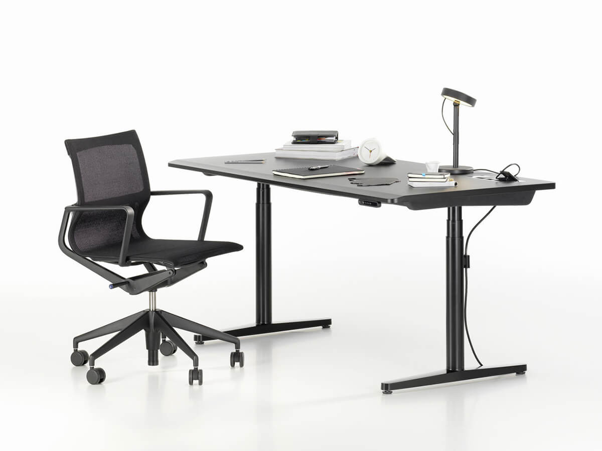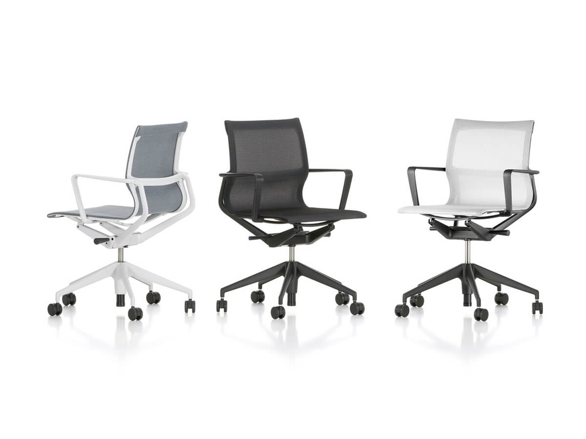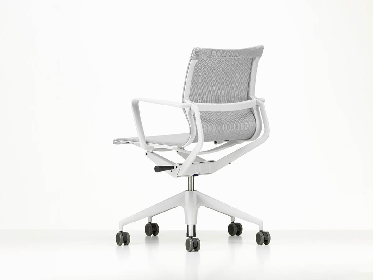 An ideal seat for the office as well as for the contemporary home office. The flexible frame engages on polyamide armrests ensuring unparalleled comfort, perfect for those who find themselves spending many hours in a seated position. The seat height is adjustable by means of a gas pump. The base is available with a five-star base in die-cast aluminum. The Physix Conference variant has a four-spoke base without wheels. Physix Studio, on the other hand, features a more streamlined and elegant adjustment system, suitable for the home office due to its reduced visual mechanics. Thanks to its design, Physix has fully joined the long series of Vitra chairs capable of combining technology and elegance.