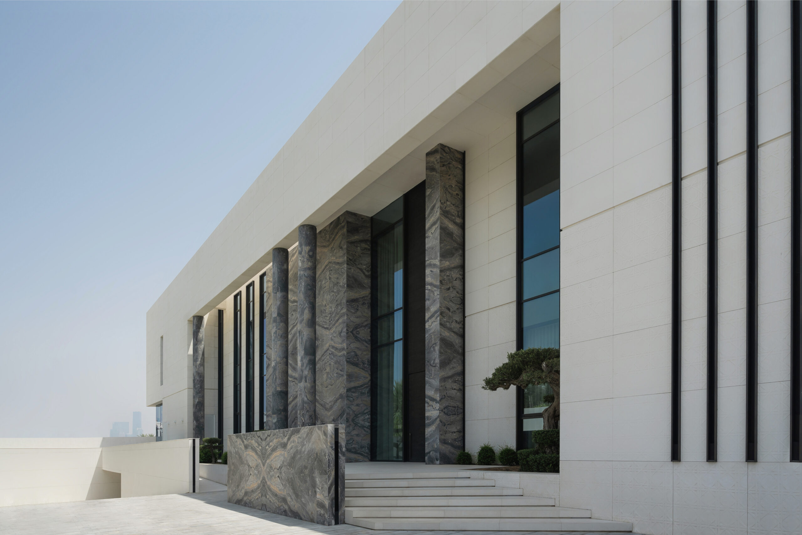 Externally, the villa is covered with a white stone of Turkish origin, called Limbra, treated with different finishes to create a surface contrast.