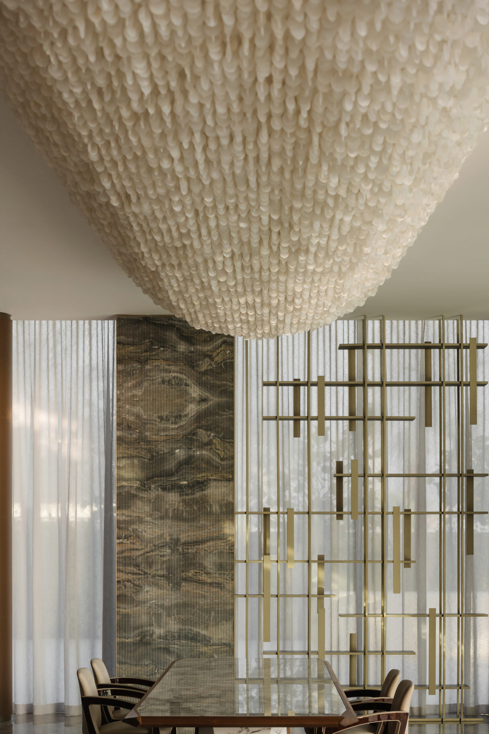 On the same floor, you can find a second living area and a dining area including a spectacular double-height kitchen, in which an island made entirely of “Fior di Bosco” marble plays a key role. Visually contrasting is the sinuous chandelier made of leather straps and LEDs, which with its lightness and aerodynamics fills the entire upper field of vision, while “chevron” design marble geometries usually used for parquet form the base of the imposing parallelepiped, creating a geometric play.